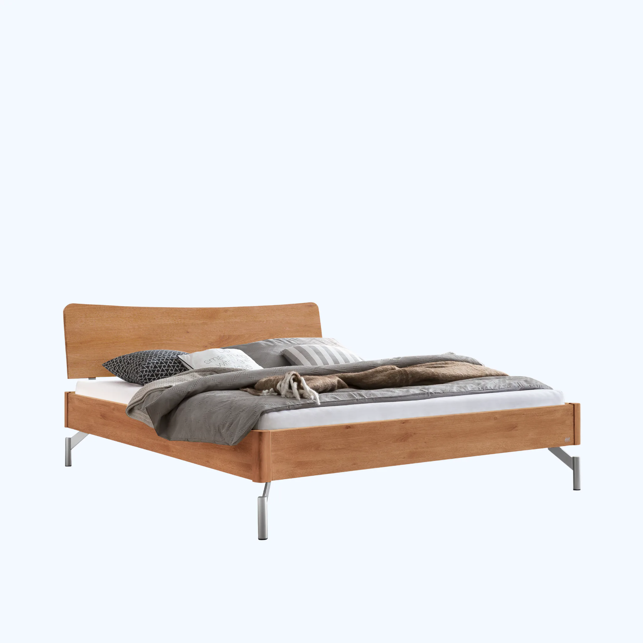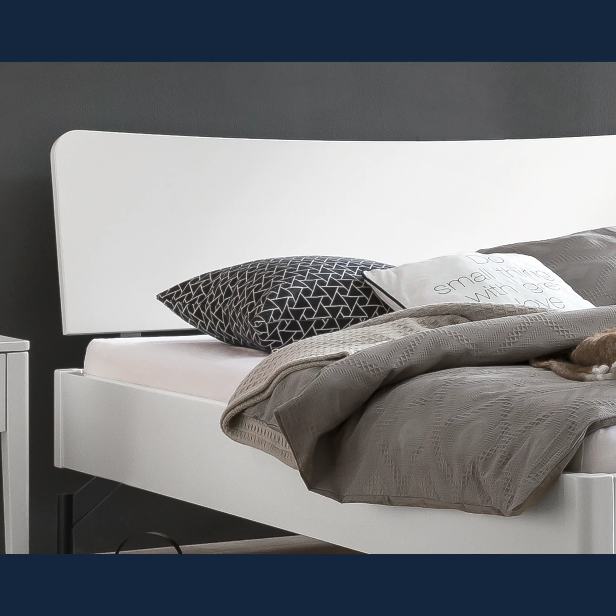 Hasena Albinia puristisches Massivholzbett mit sanft geschwungenem Holz-Kopfteil und Metallfüßen; Einlegetiefe 18 cm. Erhältlich in 12 Größen und 5 Farben.