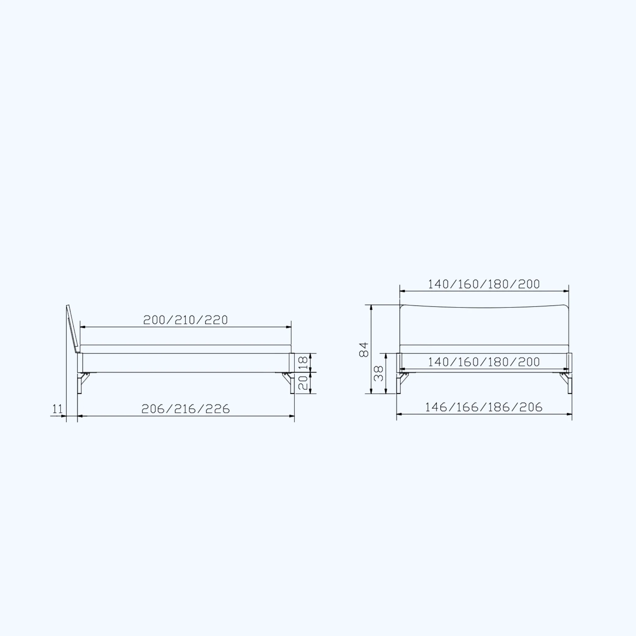 | Liegefläche | 140×200 cm, 140×210 cm, 140×220 cm, 160×200 cm, 160×210 cm, 160×220 cm, 180×200 cm, 180×210 cm, 180×220 cm, 200×200 cm, 200×210 cm, 200×220 cm |