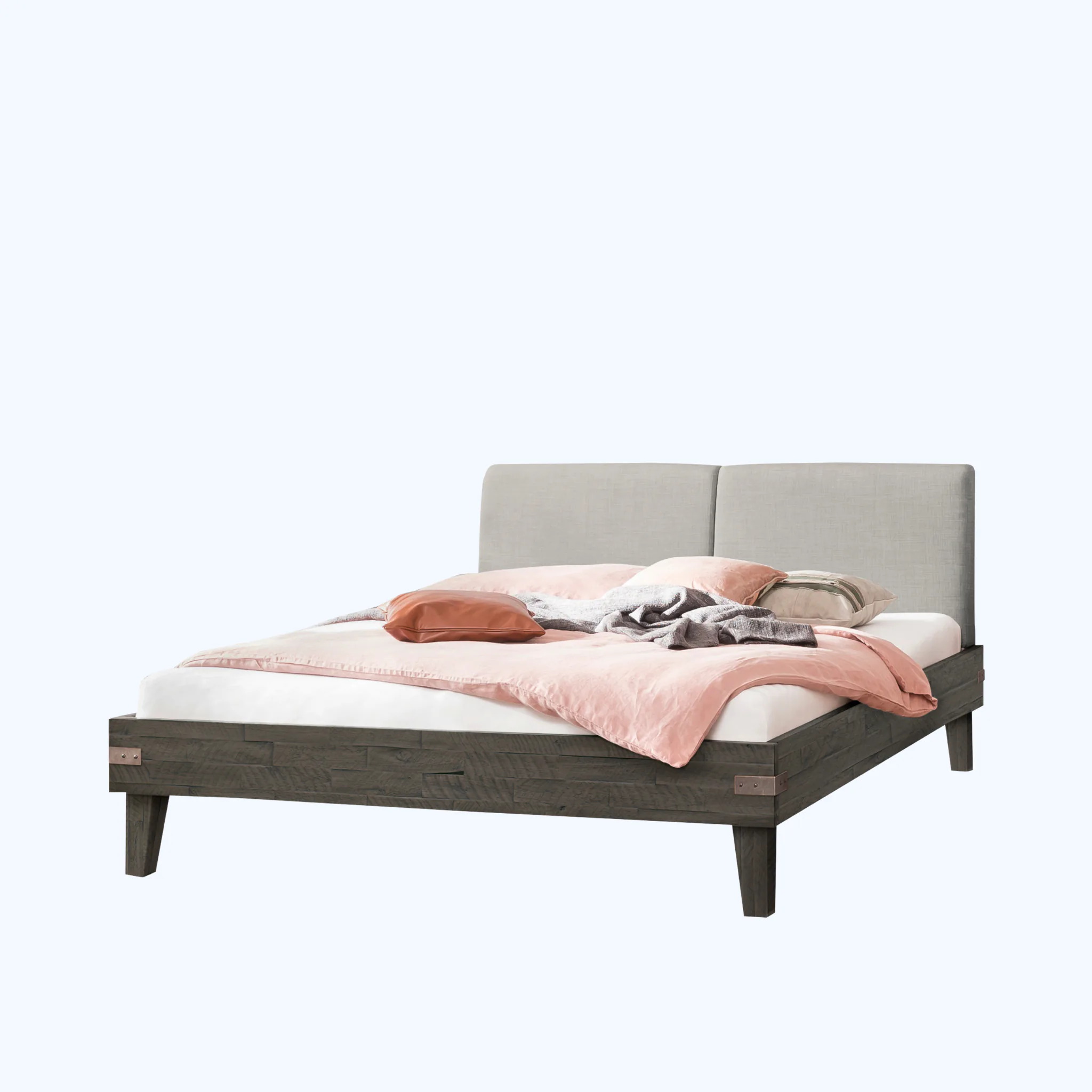 Gestalten Sie Ihren Abend in angenehm ruhiger Atmosphäre. Massivholzbett aus Akazie, Stoffkopfteil und 18 cm Einlegetiefe. Verfügbar in 3 Größen und 2 Farben.