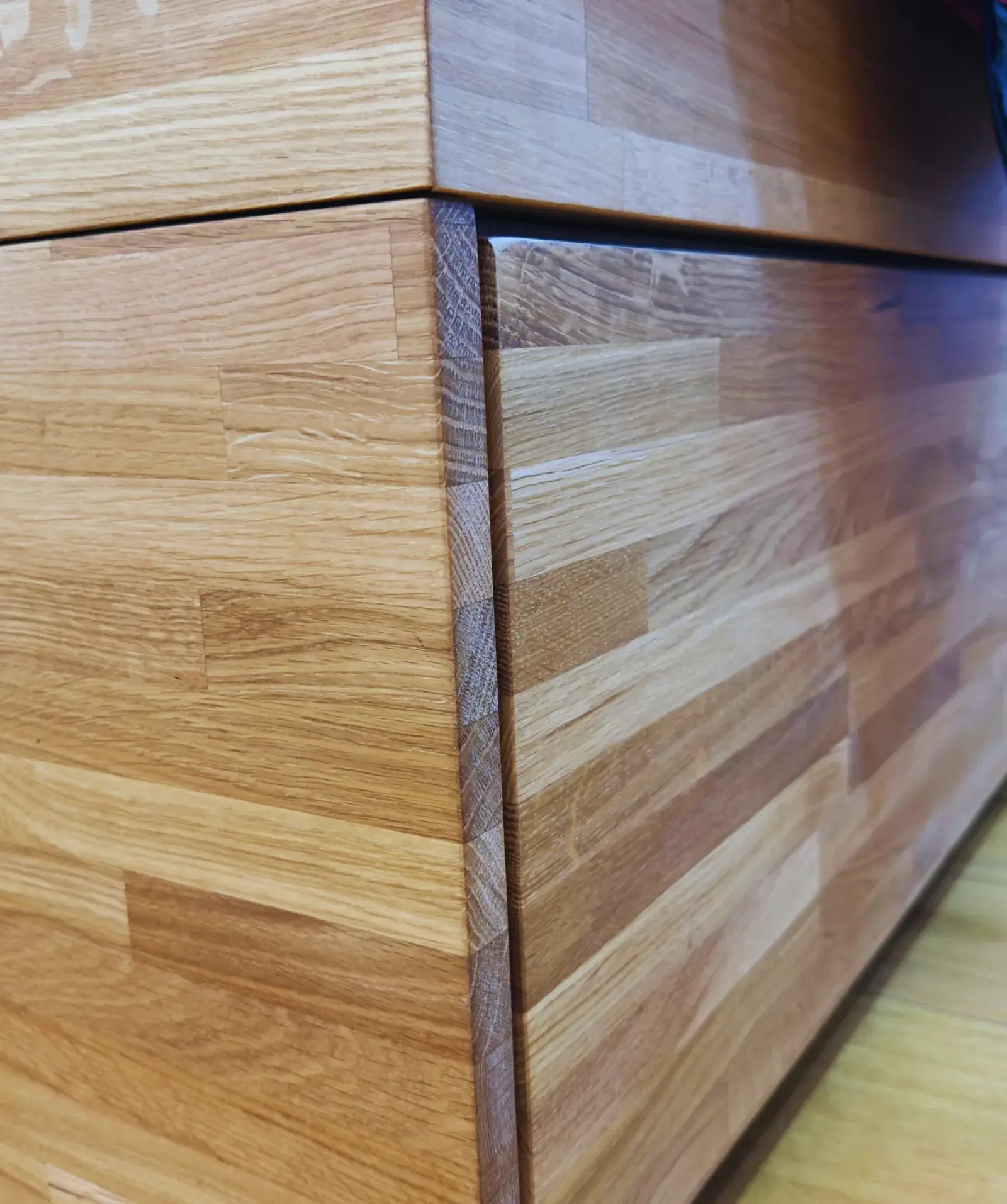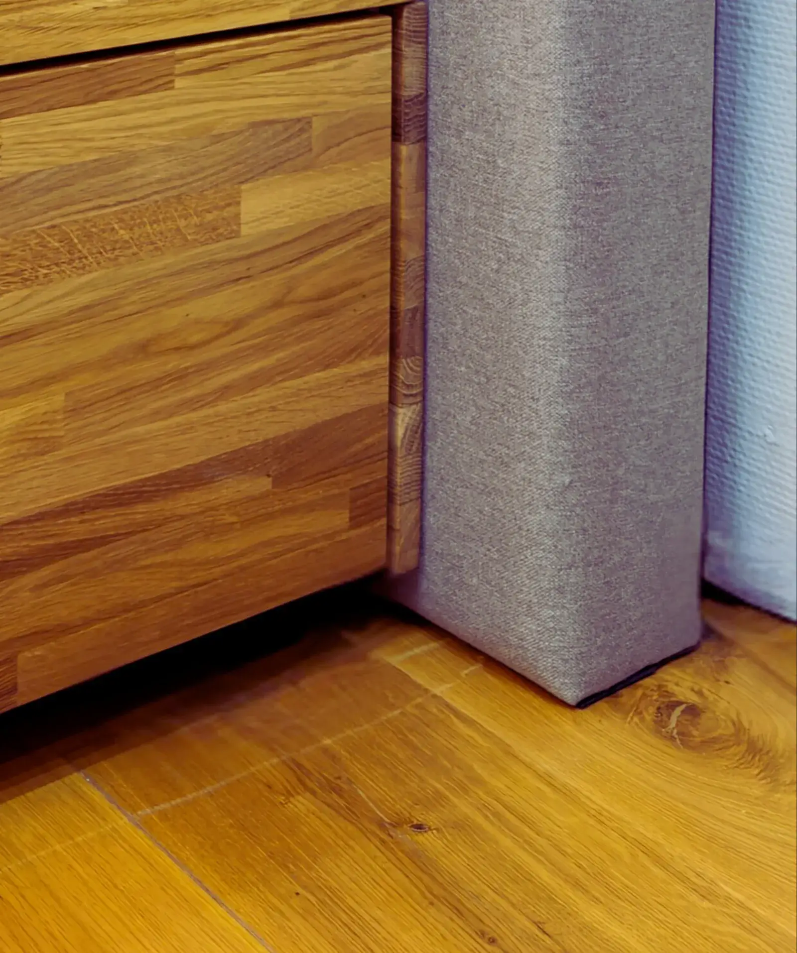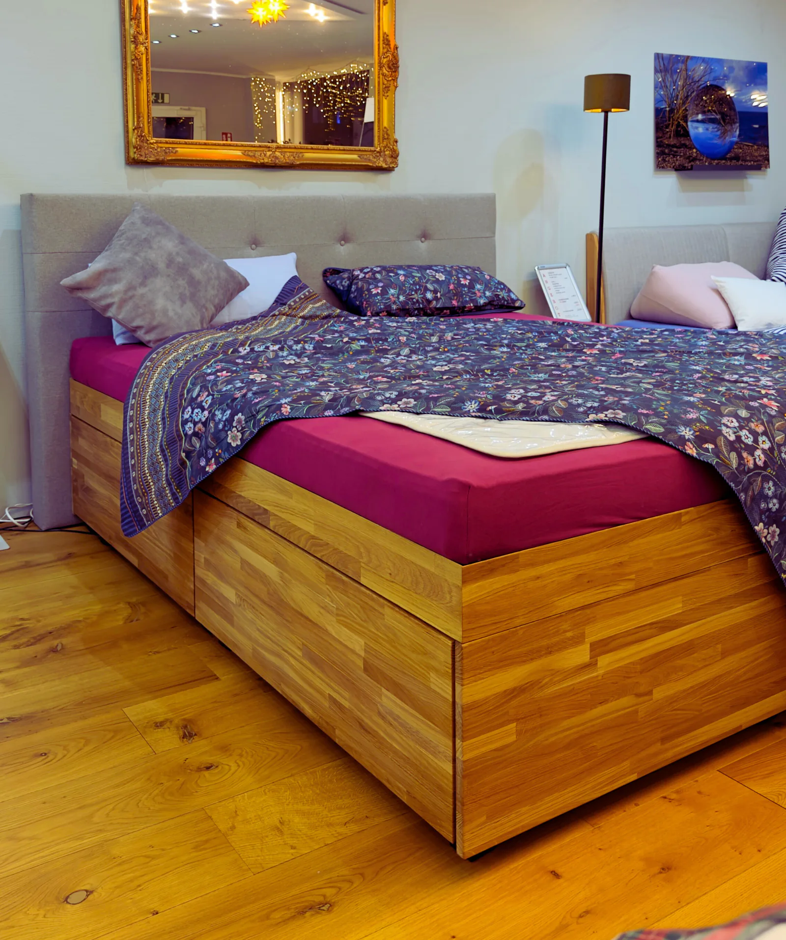 Dieses AQUARIBIK Massivholz Wasserbett 180×200 mit Stauraum ist ein gepflegtes Ausstellungsstück und verbindet hochwertiges Massivholz, praktischen Stauraum und ein vollständiges Wasserbett-System. Das Bettgestell aus Eiche massiv wirkt warm und zeitlos und fügt sich harmonisch in moderne wie klassische Schlafzimmer ein. Das gepolsterte graue Kopfteil lädt zum entspannten Anlehnen ein, während die vier bündig integrierten Boxteile mit Schubladen zusätzlichen Platz für Bettwäsche und Textilien bieten. Mit einer Boxhöhe von etwa 40 cm inklusive der 5 cm hohen Füße und einer Gesamthöhe von rund 63 cm entsteht eine komfortable Einstiegshöhe für den täglichen Gebrauch.Komplettes Softside Wasserbett Dual-System