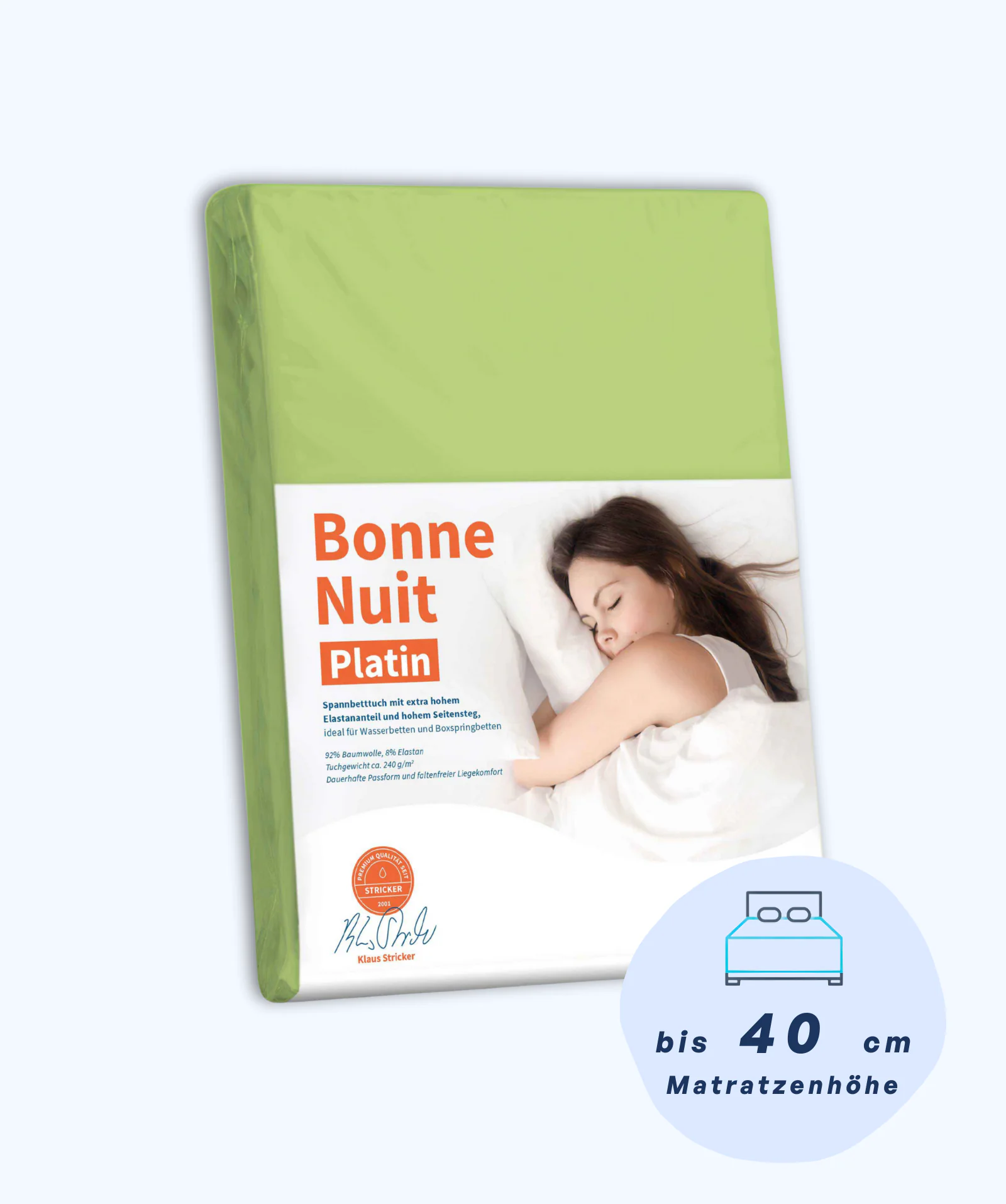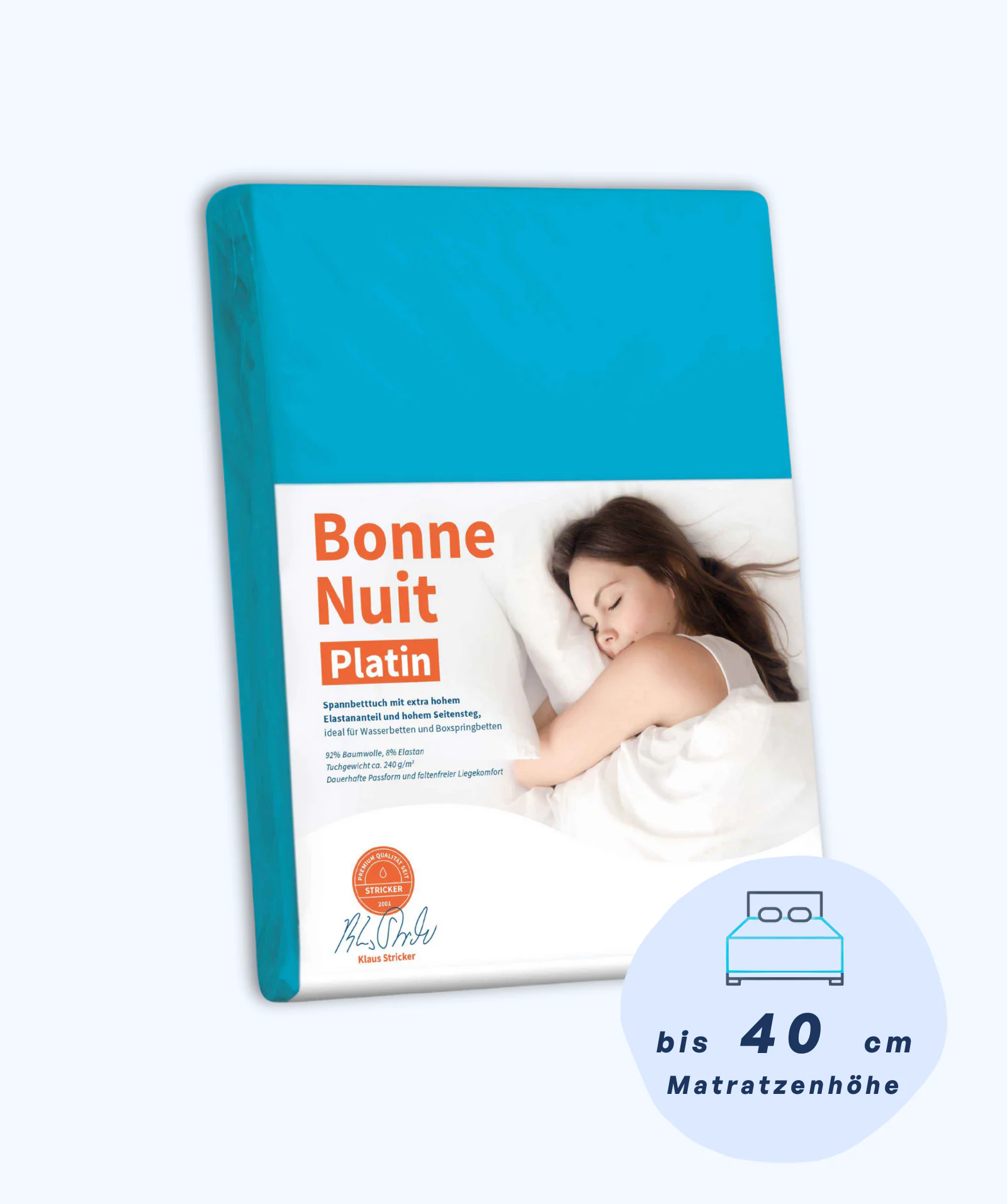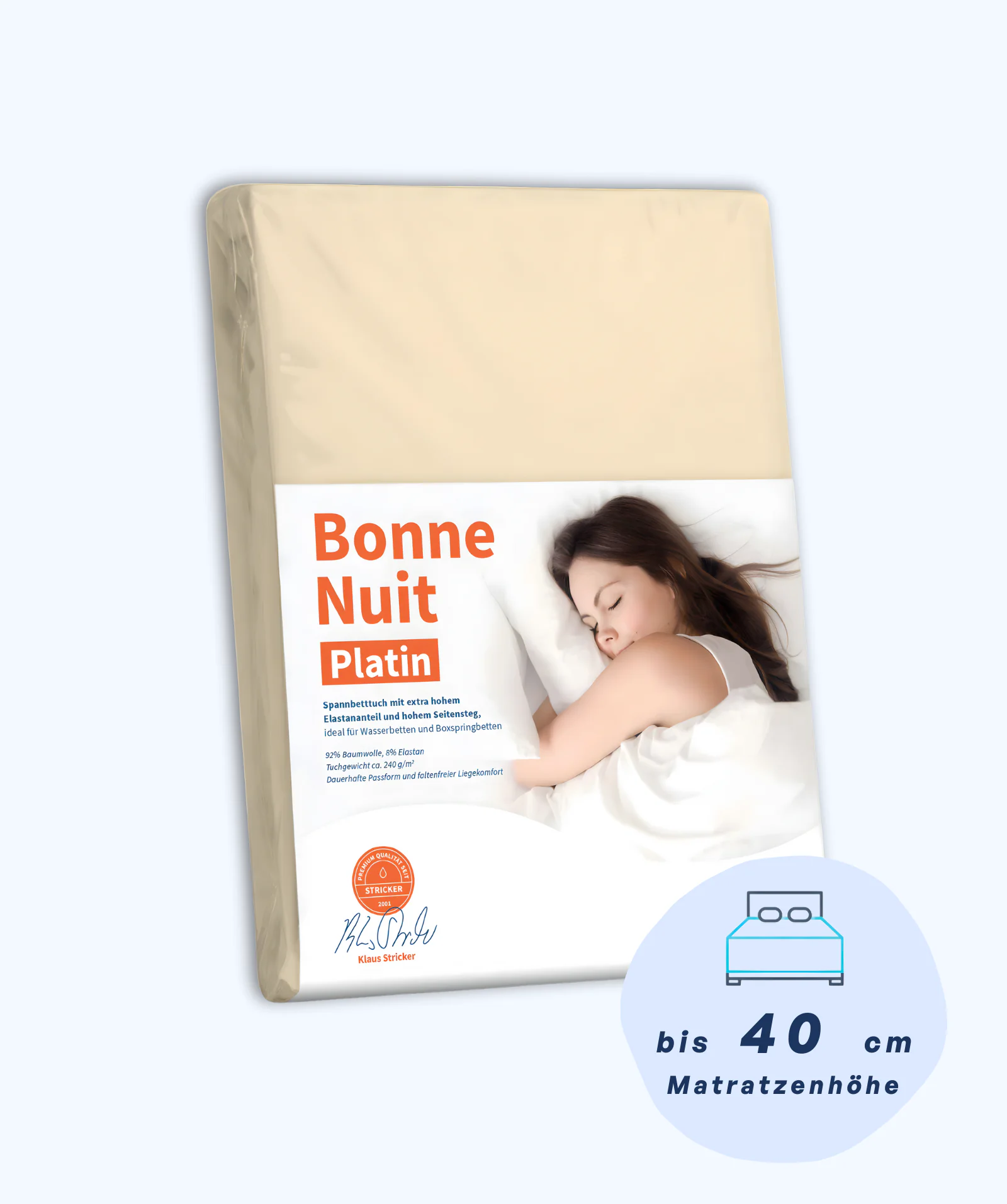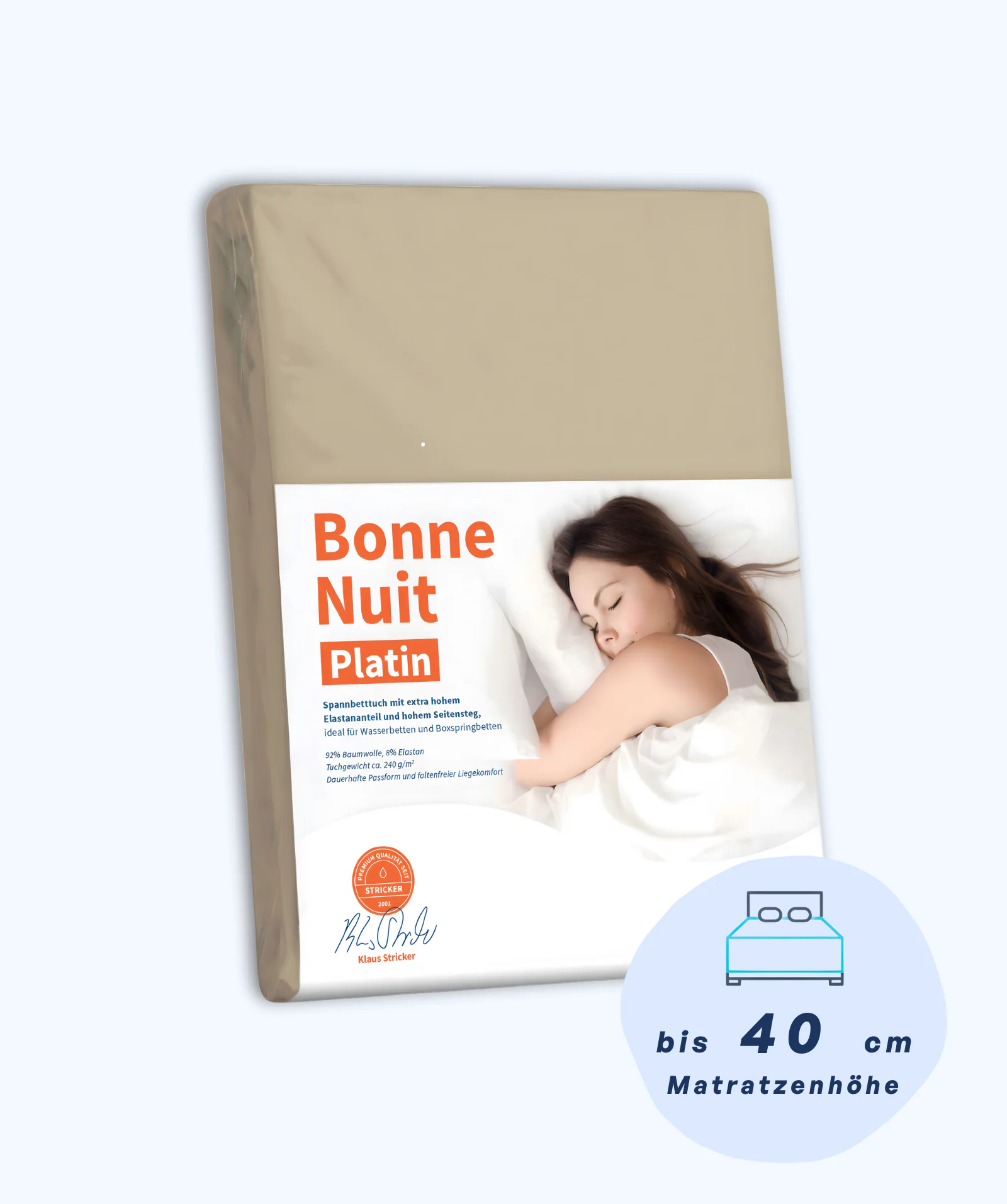 Premium Spannbettlaken Bonne Nuit Platin für Wasserbetten und Boxspringbetten bis 40 cm Matratzenhöhe. In 3 Größen und 44 Farben für Ihr Zuhause.