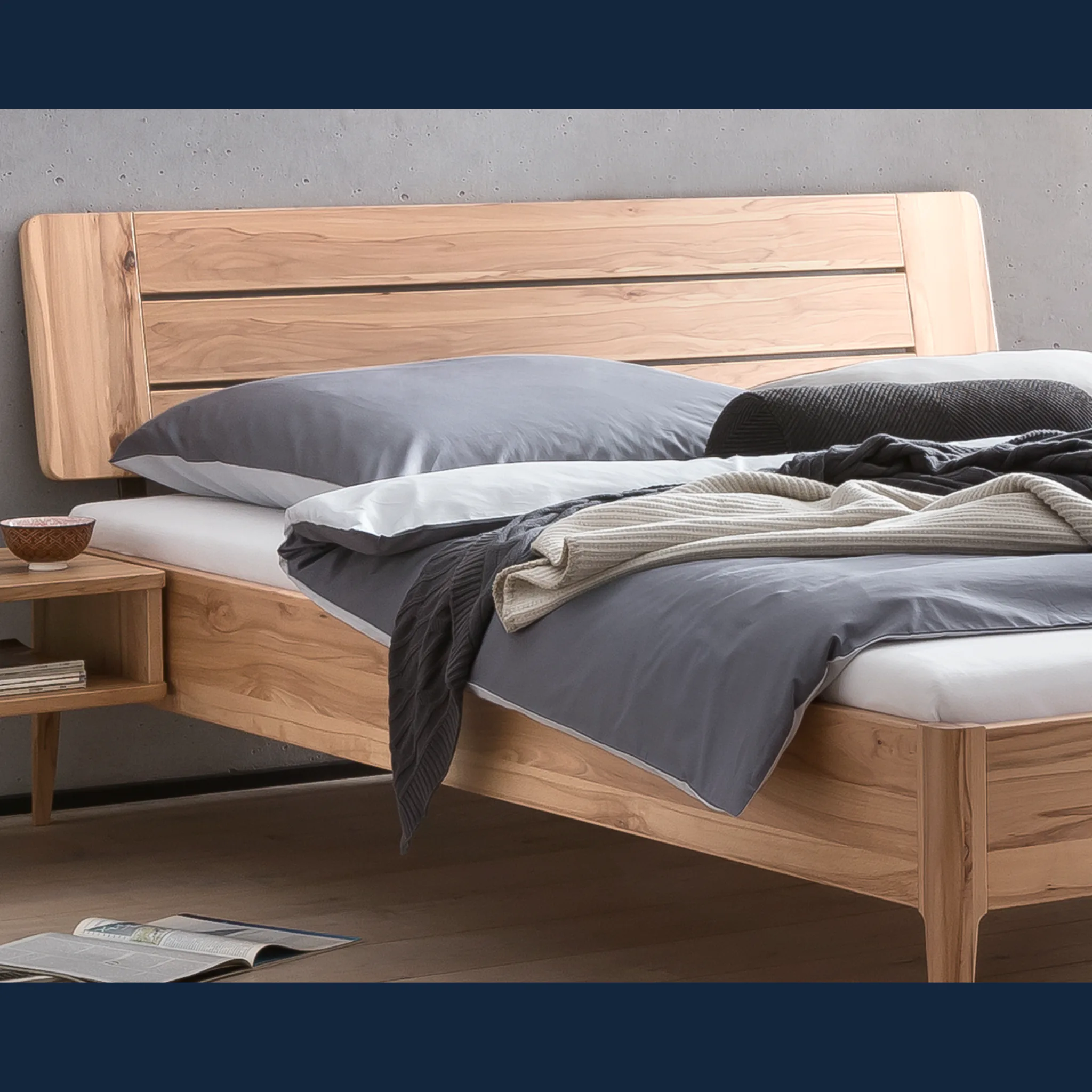 Massivholzbett mit filigraner Optik und drei Holzarten. Sanftes Holz-Kopfteil, variierbare Fußhöhe und Einlegetiefe. Erhältlich in 12 Größen und 5 Farben.