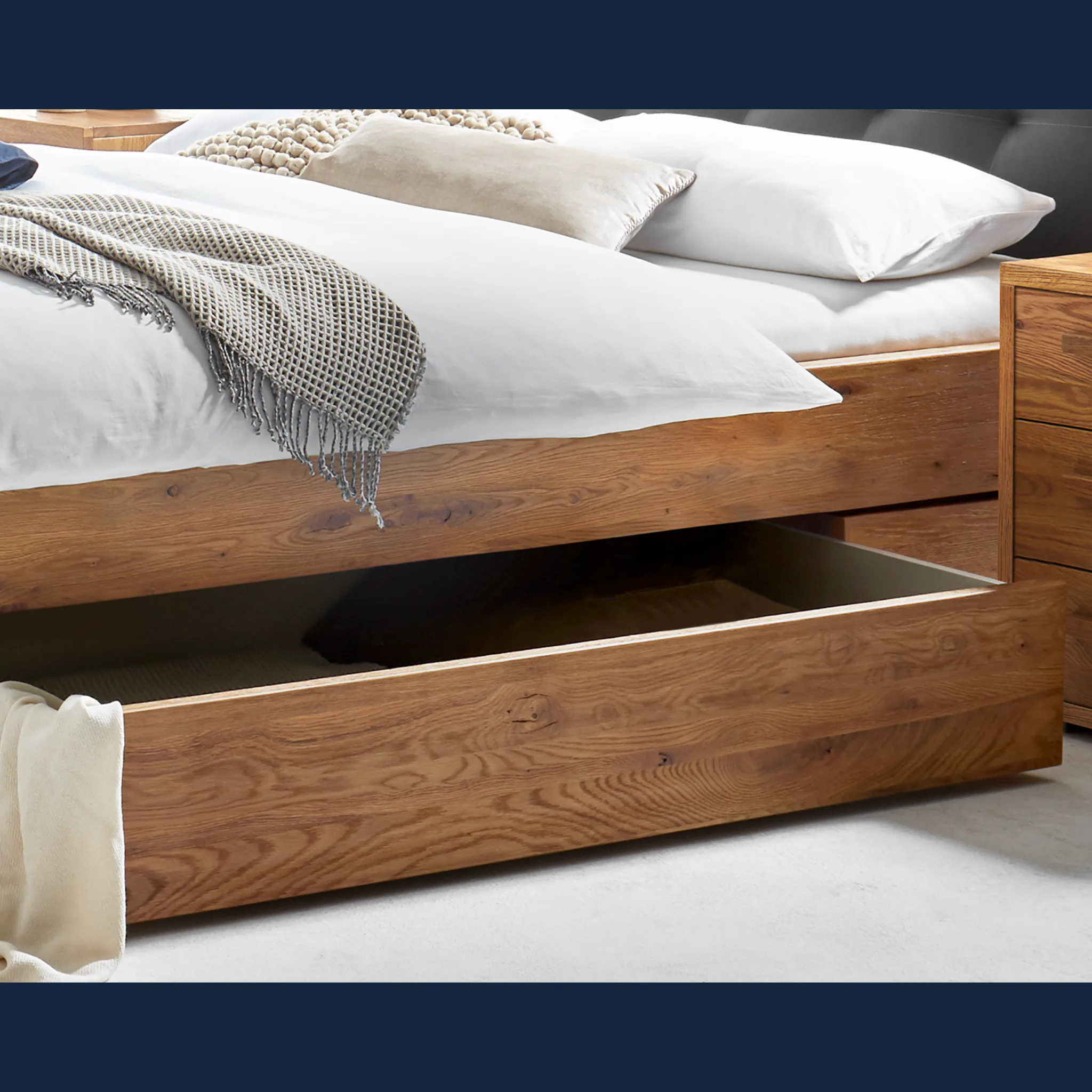 - Zwei große Bettkästen bieten praktischen Stauraum und Struktur.