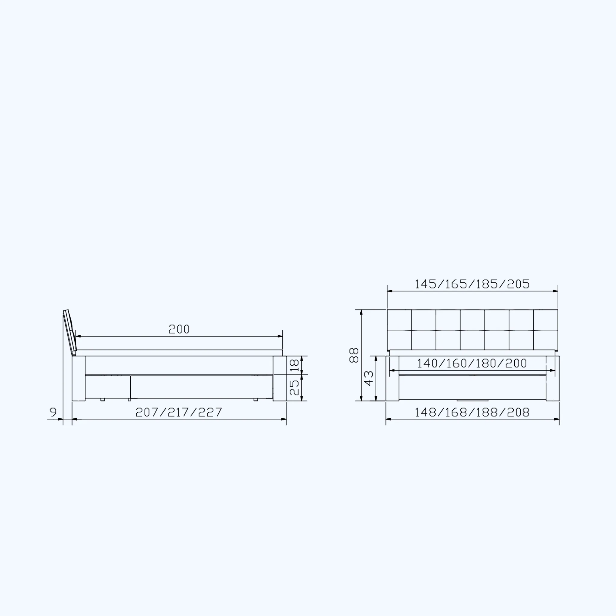 | Maße (Breite x Länge x Höhe) | 148x216x88 cm, 168x216x88 cm, 188x216x88 cm, 208x216x88 cm |
