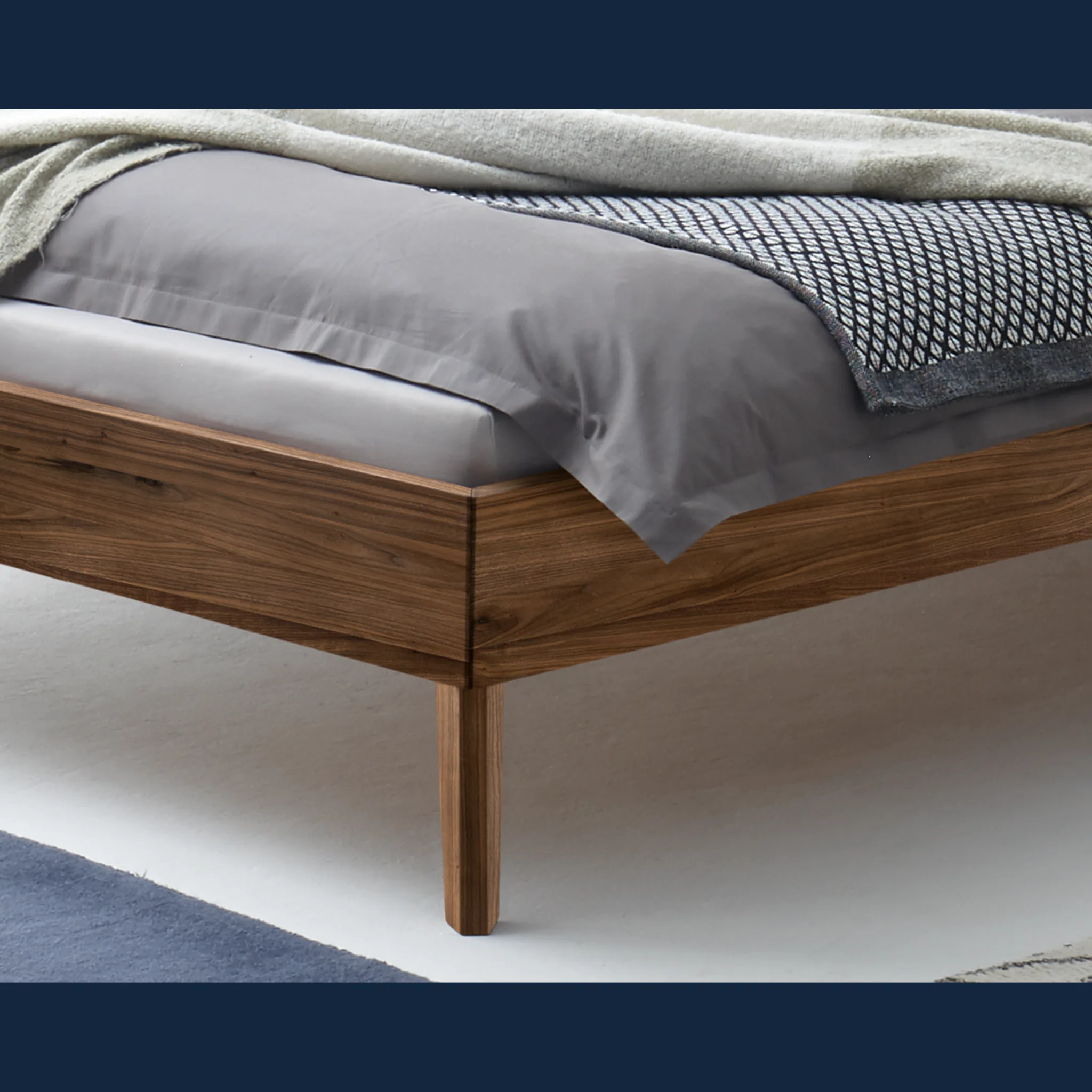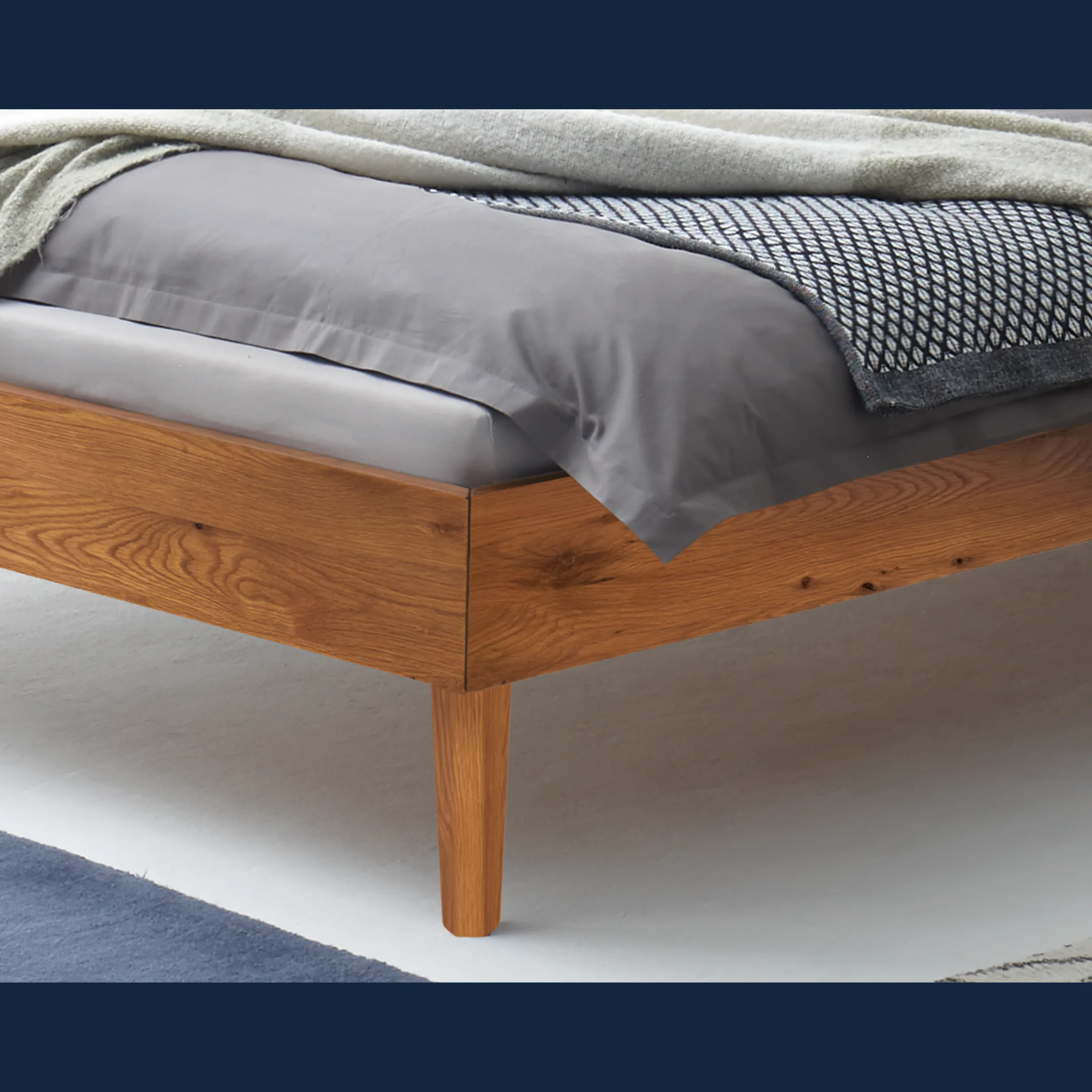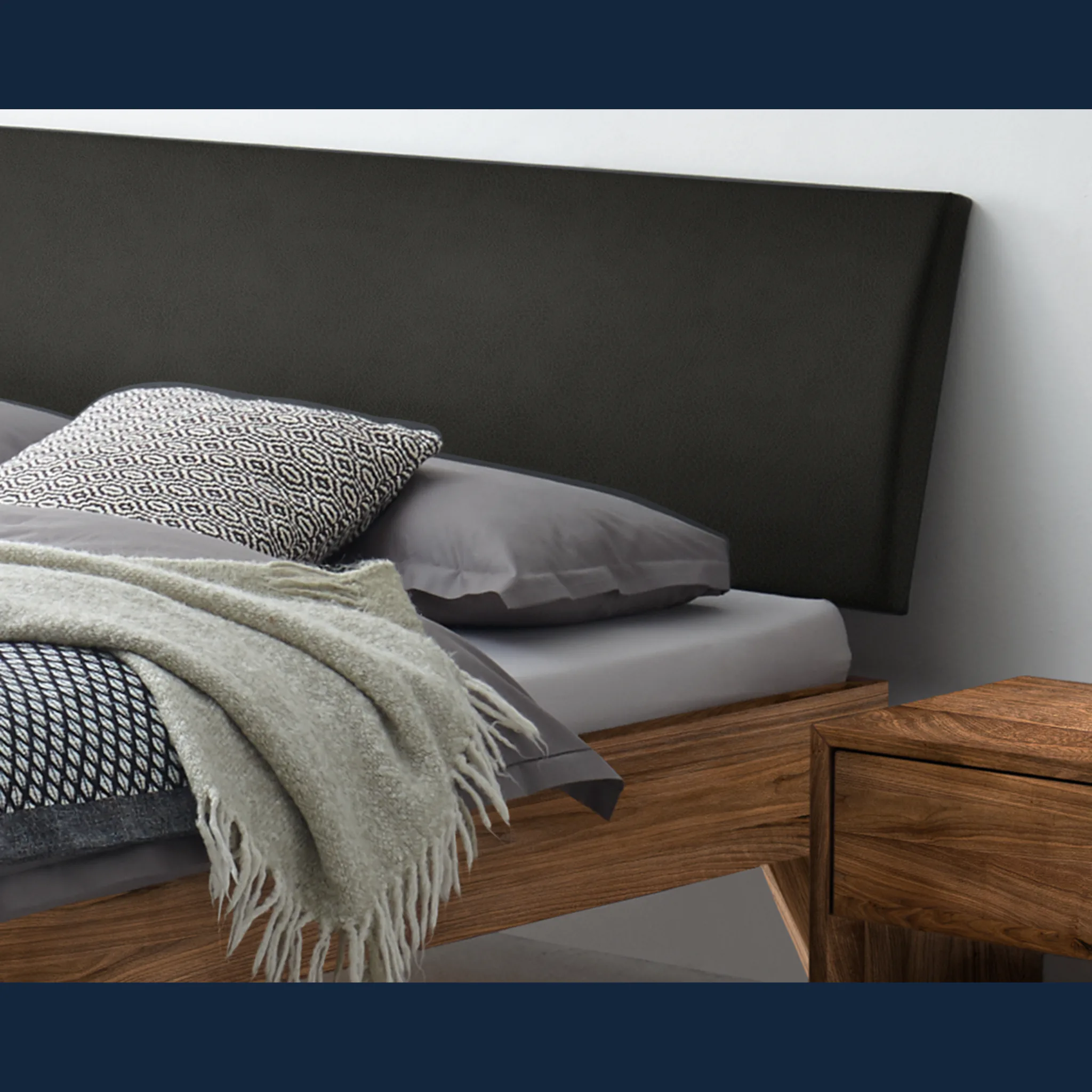Massivholzbett aus geöltem Nussbaum oder Wildeiche mit hochwertig verarbeitetem, pflegeleichtem Kunstleder-Kopfteil. Erhältlich in 8 Größen.
