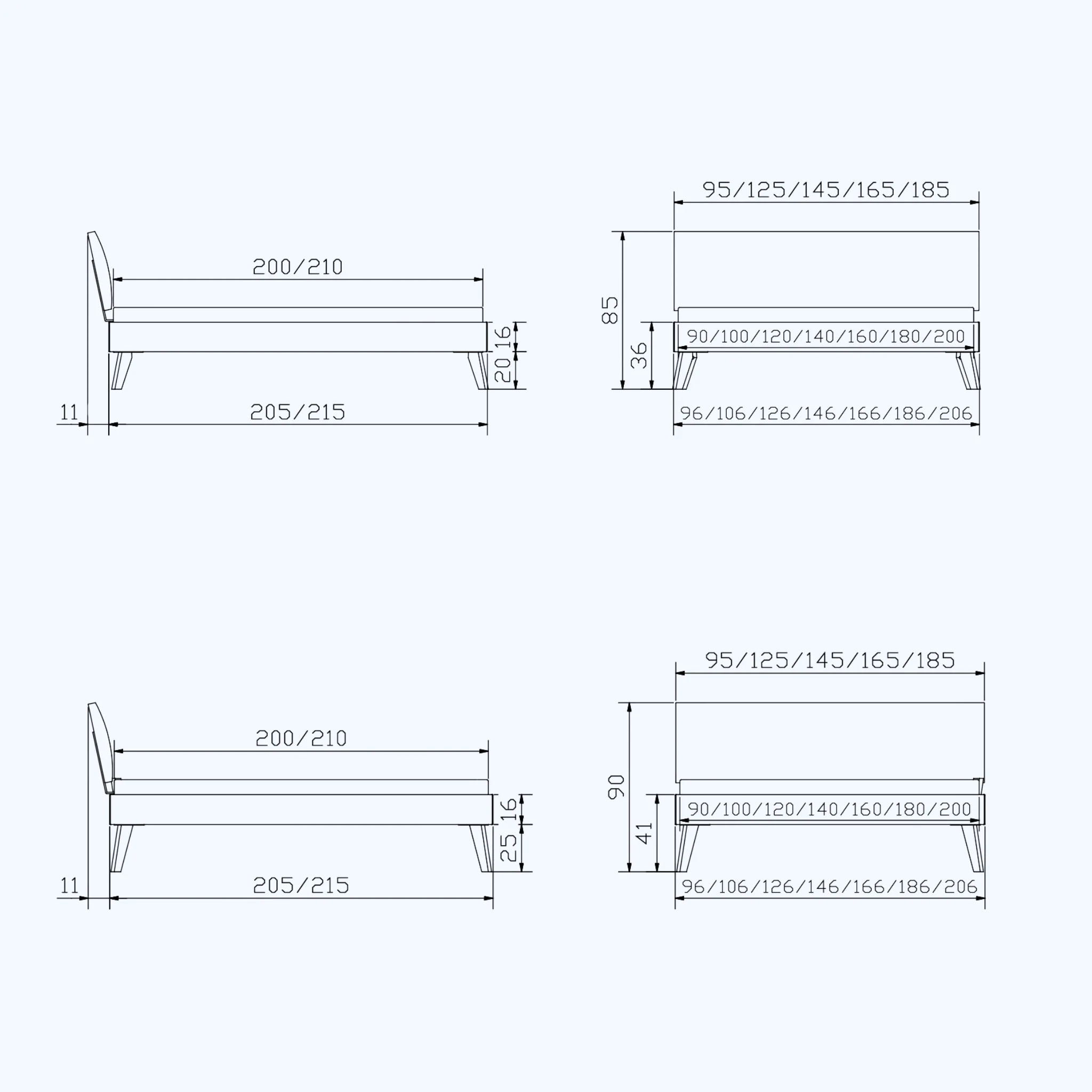 | Liegefläche | 100×200 cm, 100×210 cm, 120×200 cm, 120×210 cm, 140×200 cm, 140×210 cm, 160×200 cm, 160×210 cm, 180×200 cm, 180×210 cm, 200×200 cm, 200×210 cm, 90×200 cm, 90×210 cm |