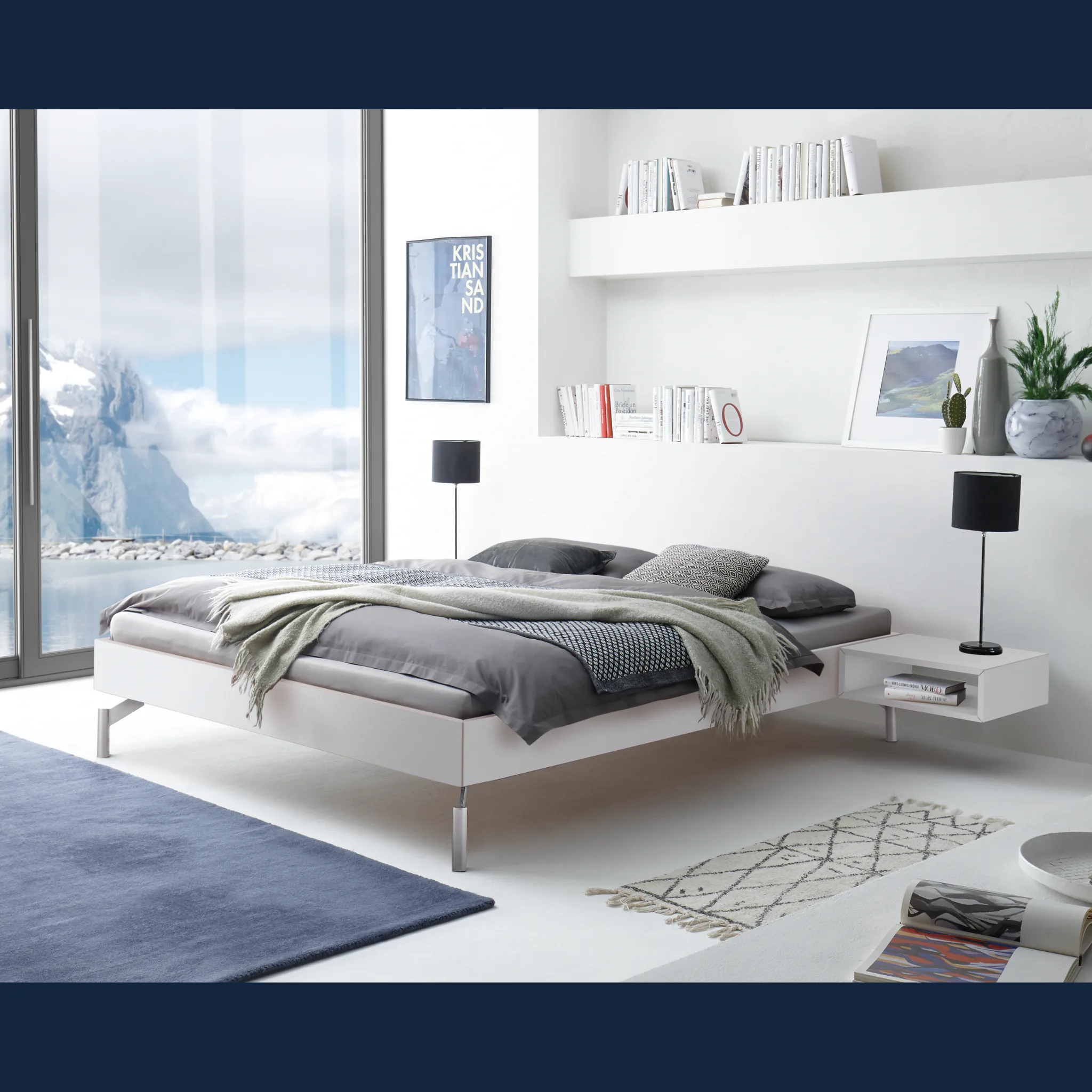 Elegantes Hasena Bett mit MDF in Weiss und filigranen pulverbeschichteten Stahlfüßen. Modernes Design mit schwebender Optik. Erhältlich in 7 Größen.