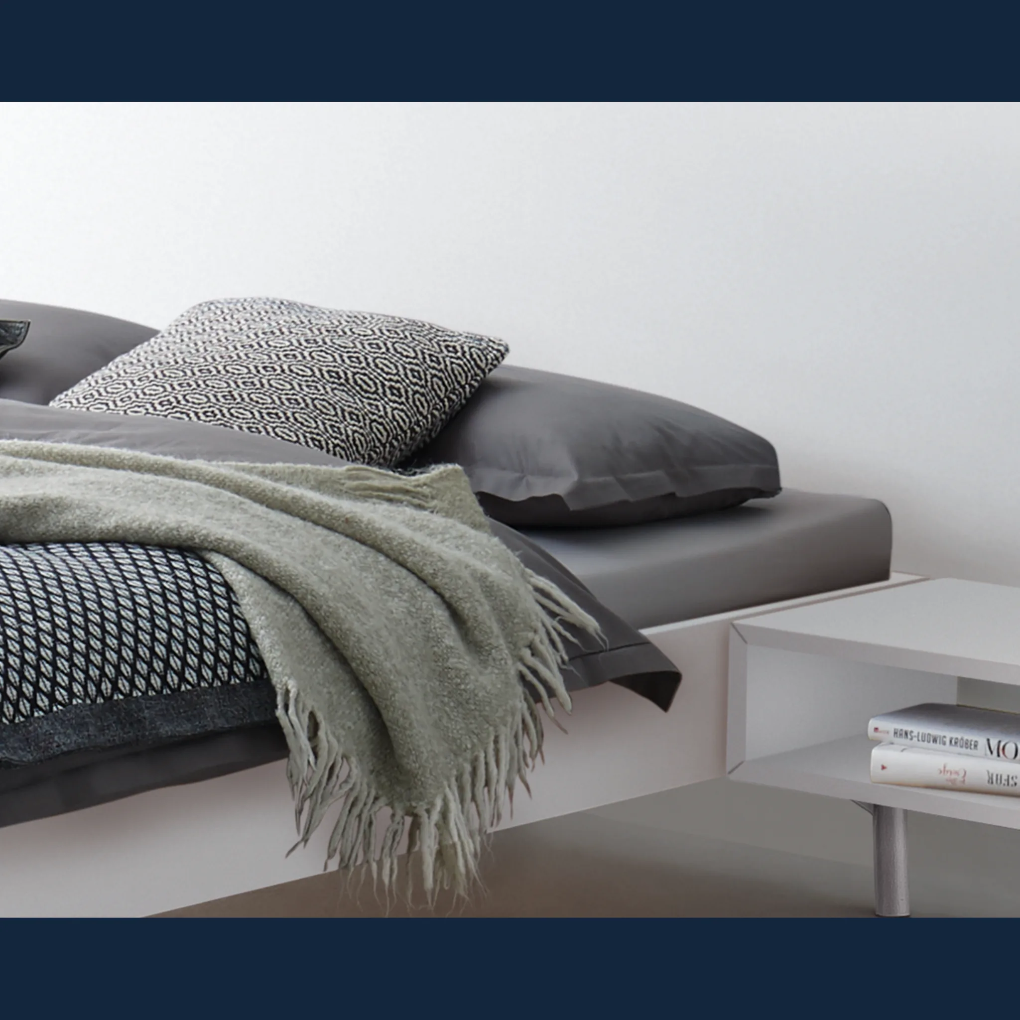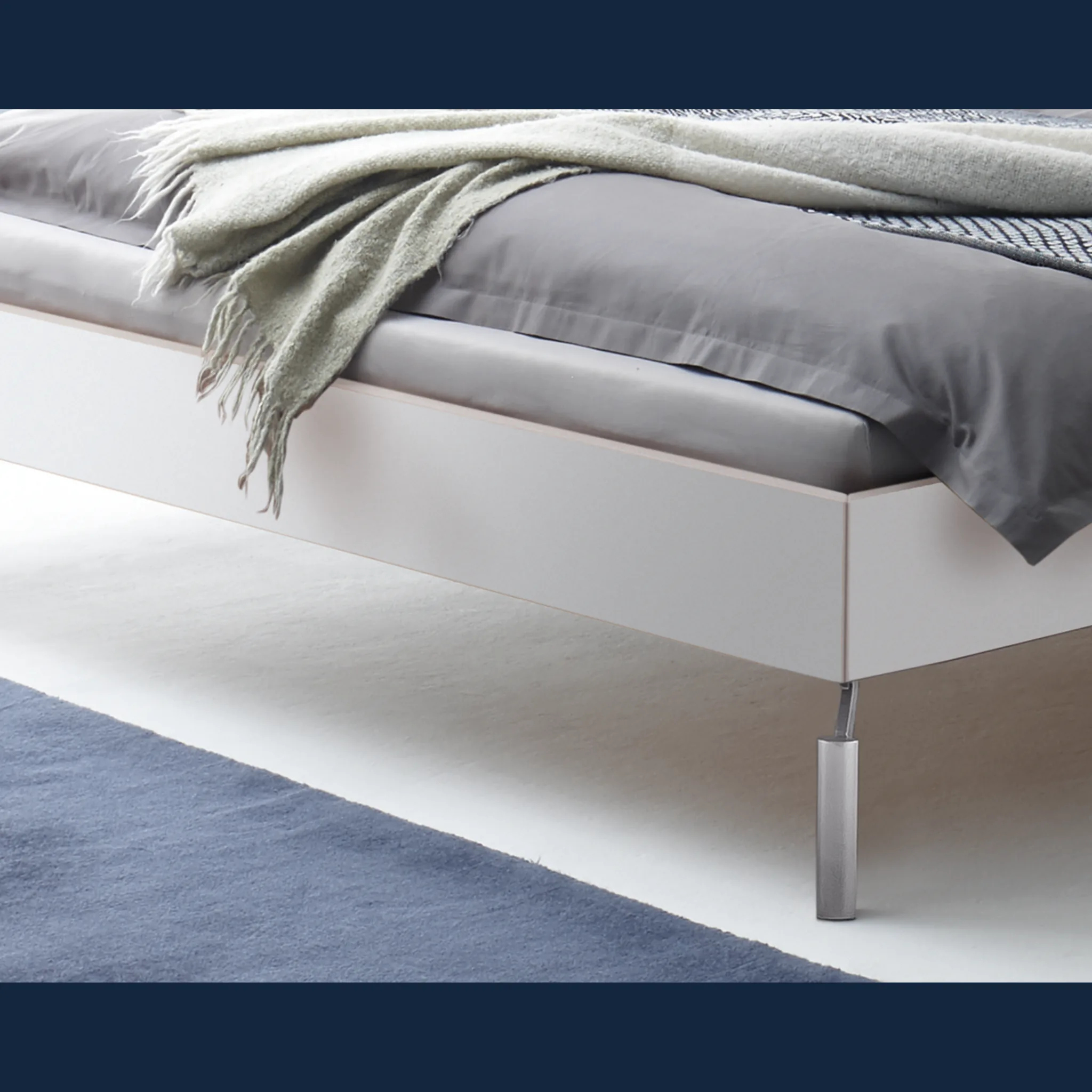 Der Bettrahmen besteht aus MDF weiss deckend, lackiert, das für seine glatte Oberfläche und hohe Beständigkeit geschätzt wird. Die pulverbeschichteten Füße aus Stahl in Alu-Optik ergänzen den modernen Charakter und betonen die schlichte Eleganz des Designs. Alle Verbindungen sind präzise gefertigt und gewährleisten dauerhafte Stabilität.
