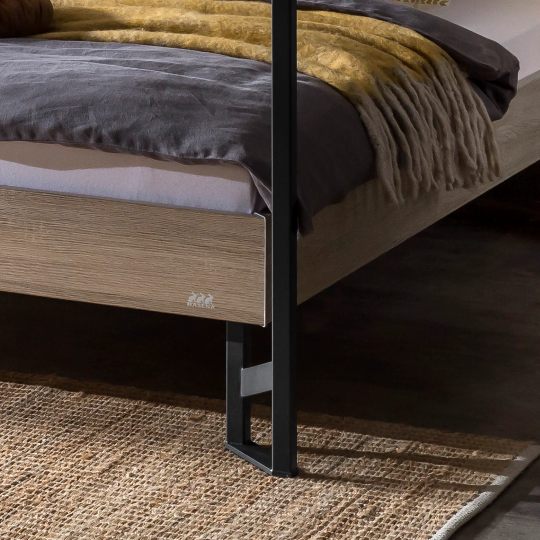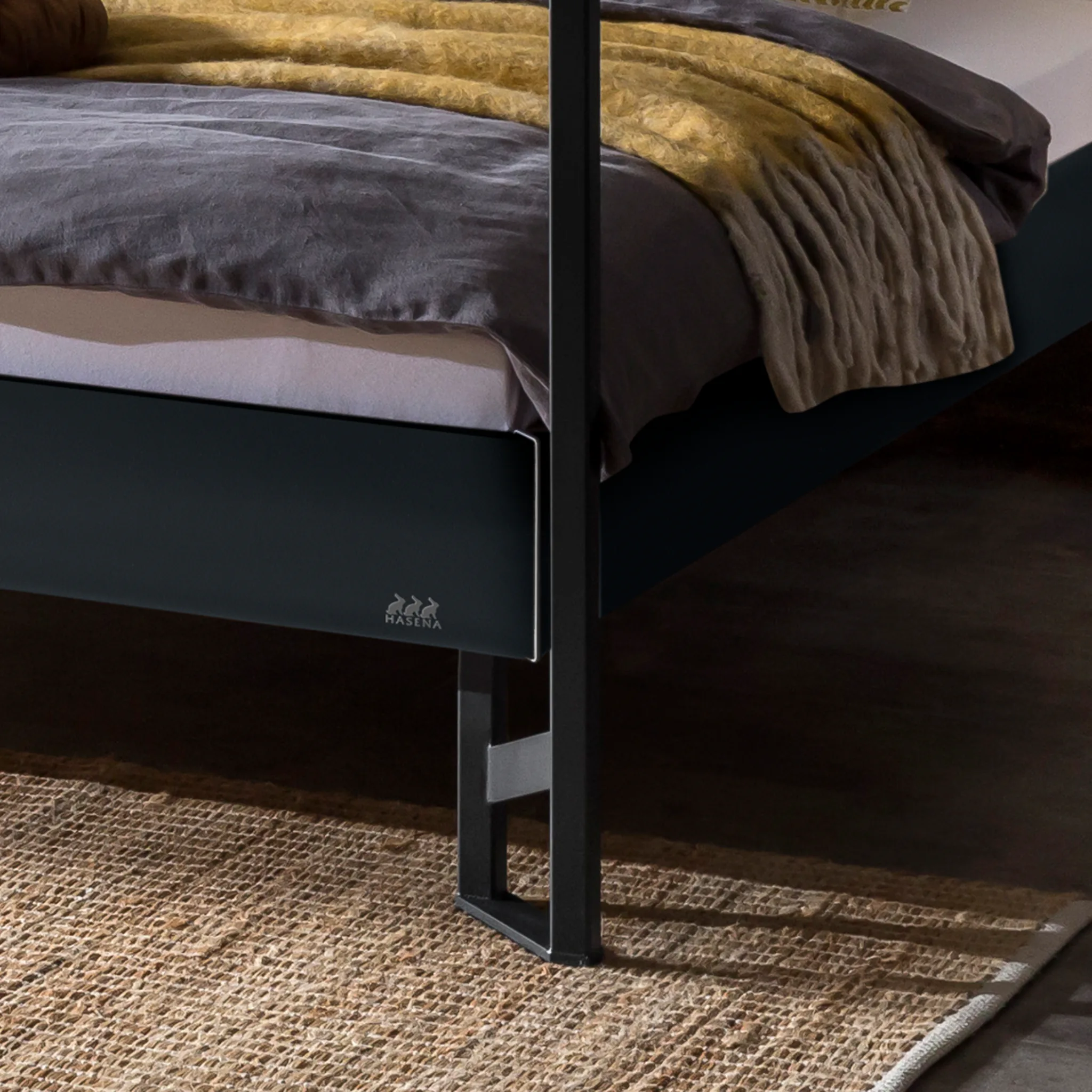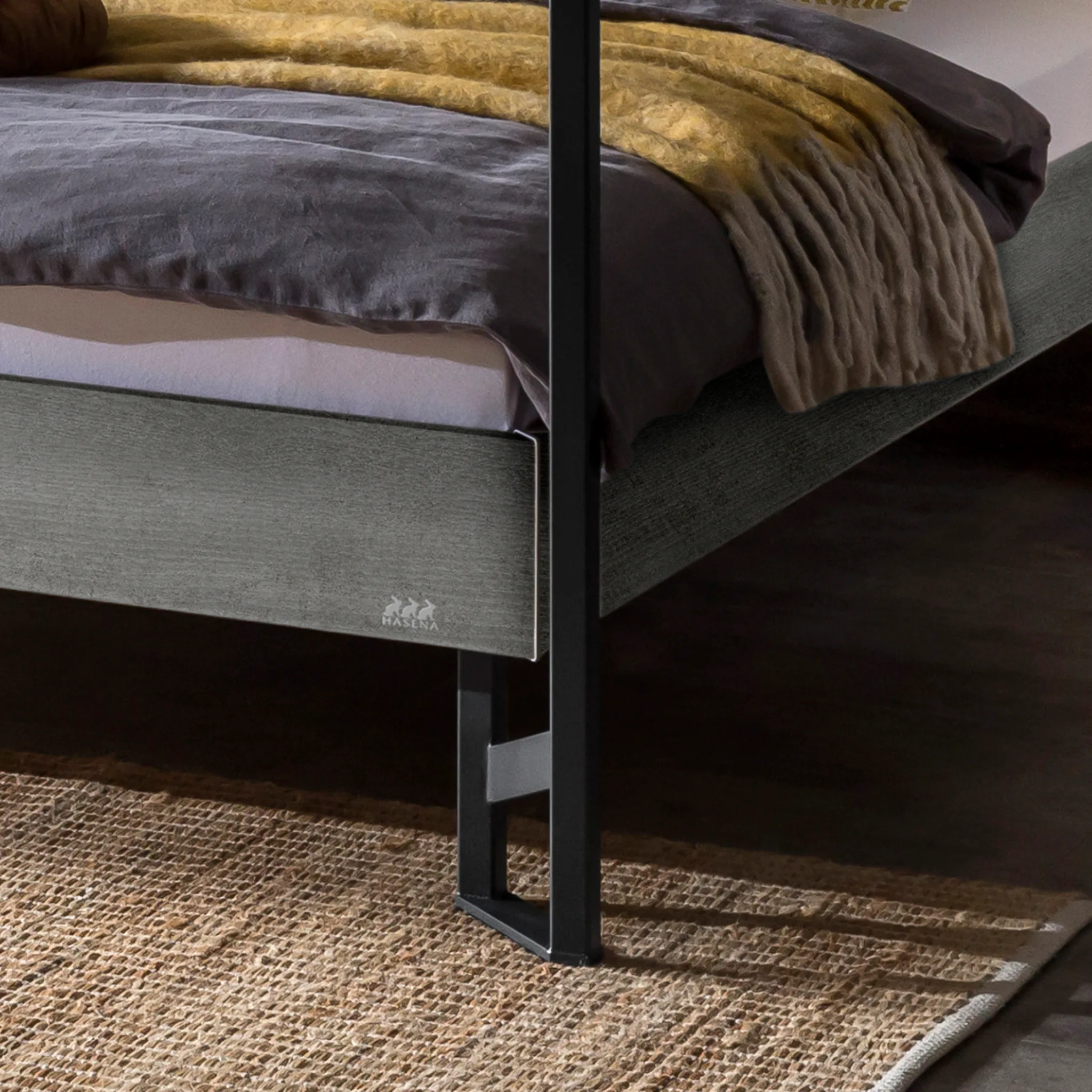 Industrial-inspiriertes Hasena Himmelbett aus hochwertig verarbeitetem MDF und pulverbeschichtetem Stahl – markant, stabil und pflegeleicht. Erhältlich in 3 Größen und 4 Farben.