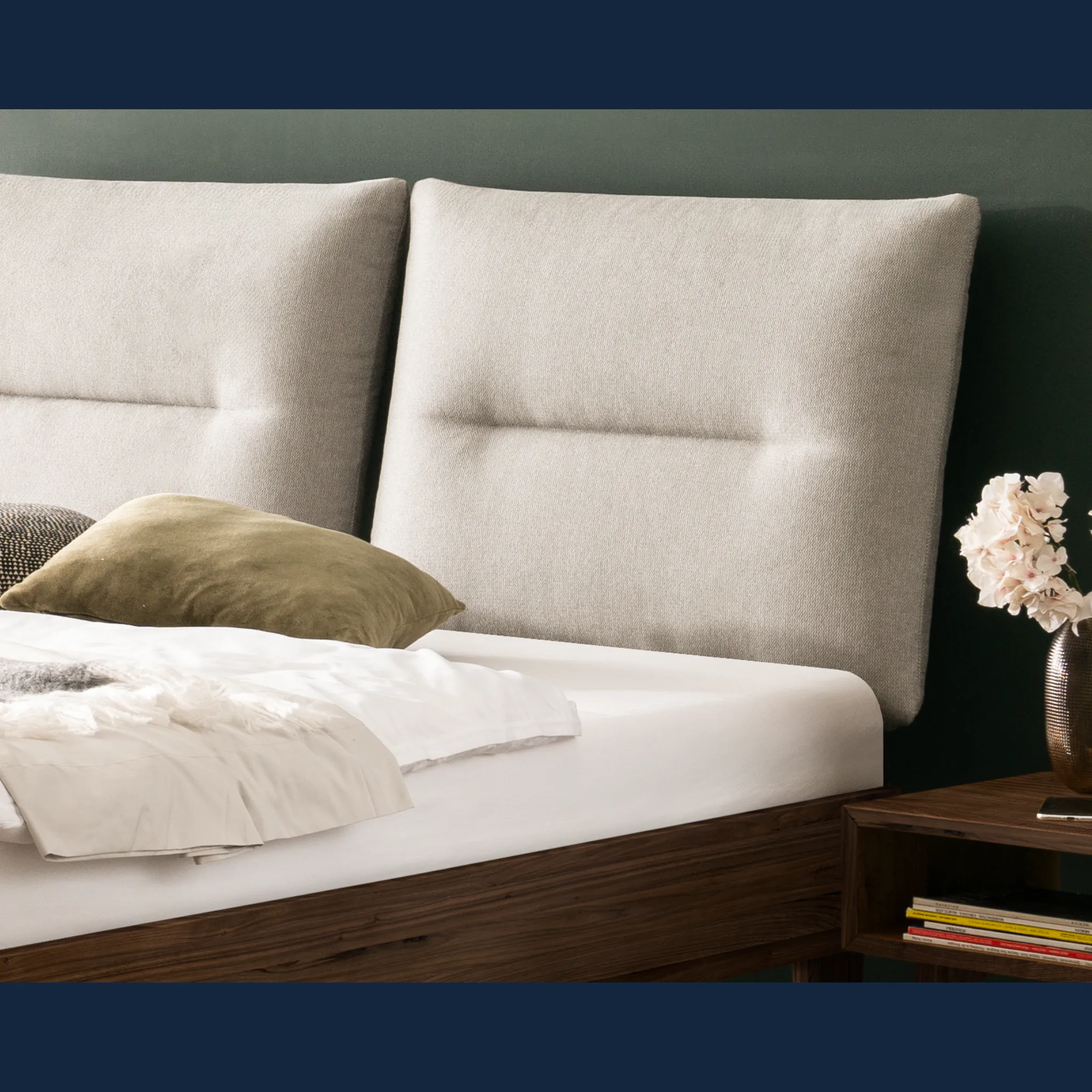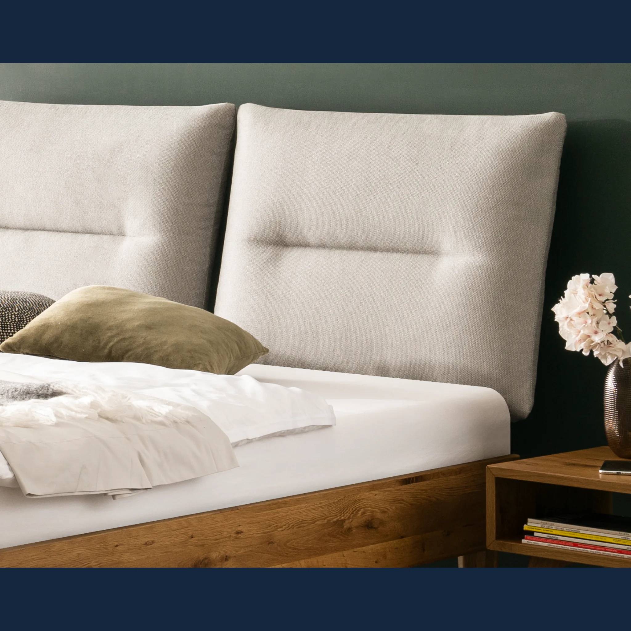 Gestalten Sie Ihren Abend in ruhiger Atmosphäre. Das Massivholzbett Hasena Emilia verbindet skandinavische Leichtigkeit mit verlässlicher Alltagstauglichkeit. Der Rahmen aus massivem Hartholz in Möbelqualität ist in Kernbuche, Wildeiche oder Nussbaum verfügbar und wirkt ruhig sowie beständig. Das geneigte Kopfteil trägt zwei weich gepolsterte Kissen mit Cyclo Bezug aus recyceltem PET, ein robuster, pflegeleichter Bezug mit angenehm textilem Griff. Schlanke, konische Holzfüße geben optische Leichtigkeit und lassen die Fläche darunter gut zugänglich. So entsteht ein freundlicher Mittelpunkt für erholsame Nächte.