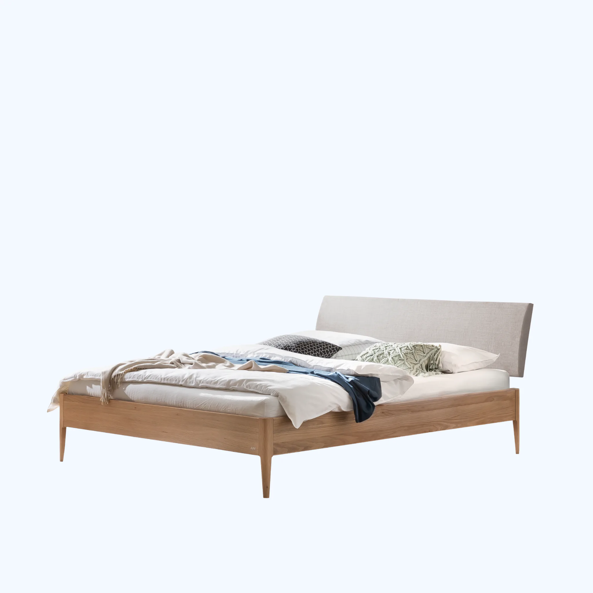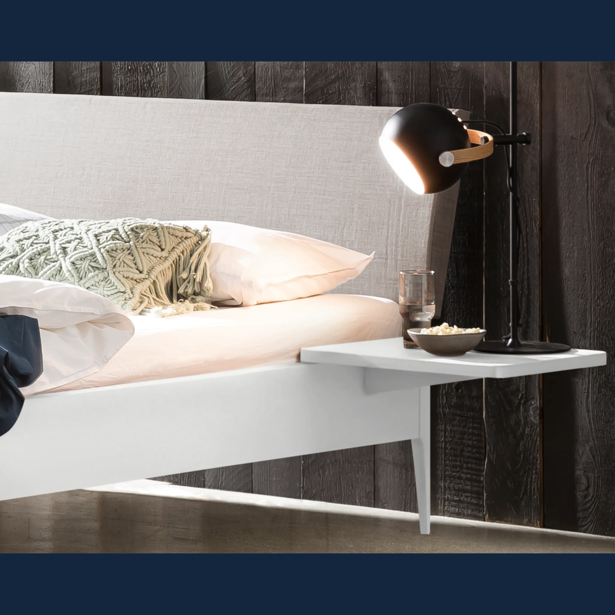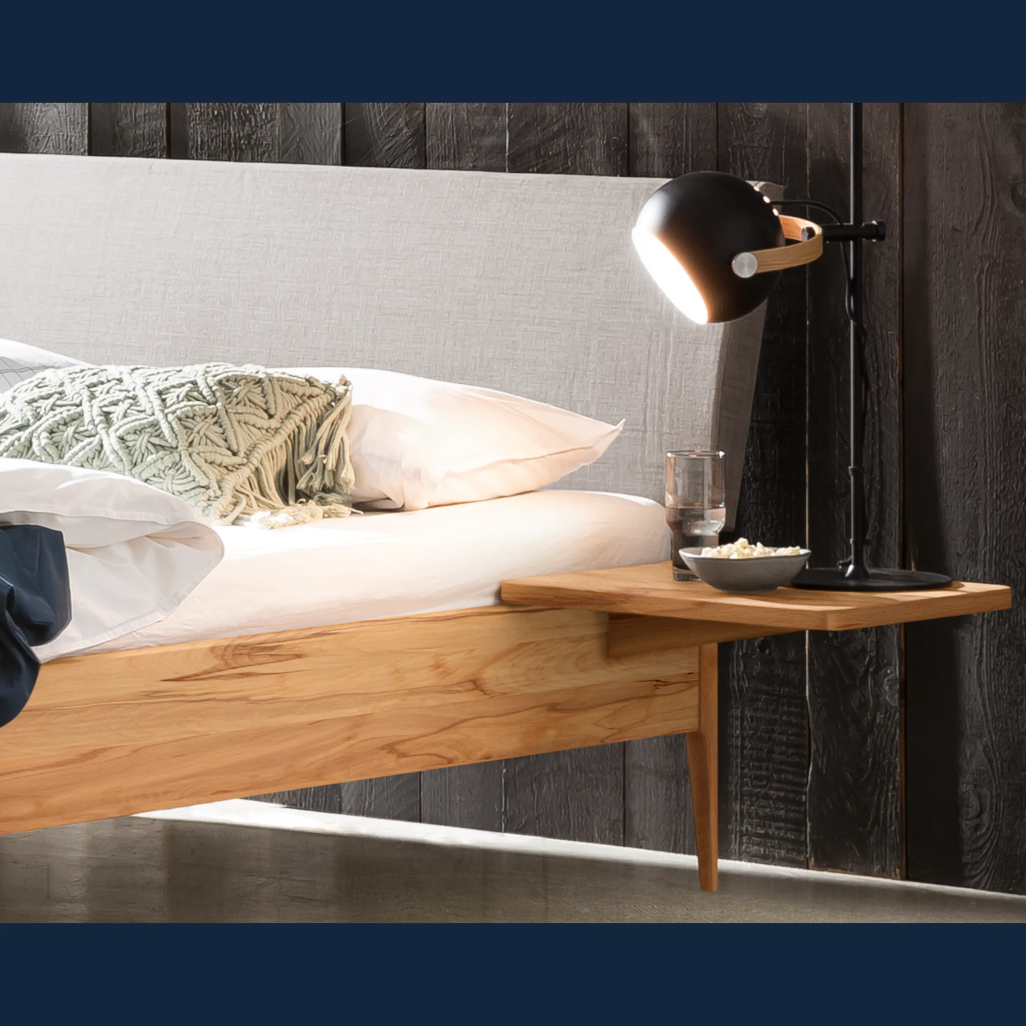 Erleben Sie wertige Haptik und klare Linien. Fanano zeigt eine modern-skandinavische Silhouette mit sanften Radien und schlanken, konischen Füßen. Der Rahmen entsteht aus massivem Hartholz in Möbelqualität und verleiht dem Bett spürbare Stabilität. Die textil gepolsterten Kissen im Bezug Pepe grey bieten angenehme Unterstützung beim Sitzen und Lesen. Geölte oder deckend lackierte Oberflächen bringen natürliche Wärme ins Schlafzimmer und lassen sich vielfältig kombinieren. So entsteht ein Bett, das Ruhe ausstrahlt und den Alltag zuverlässig begleitet.