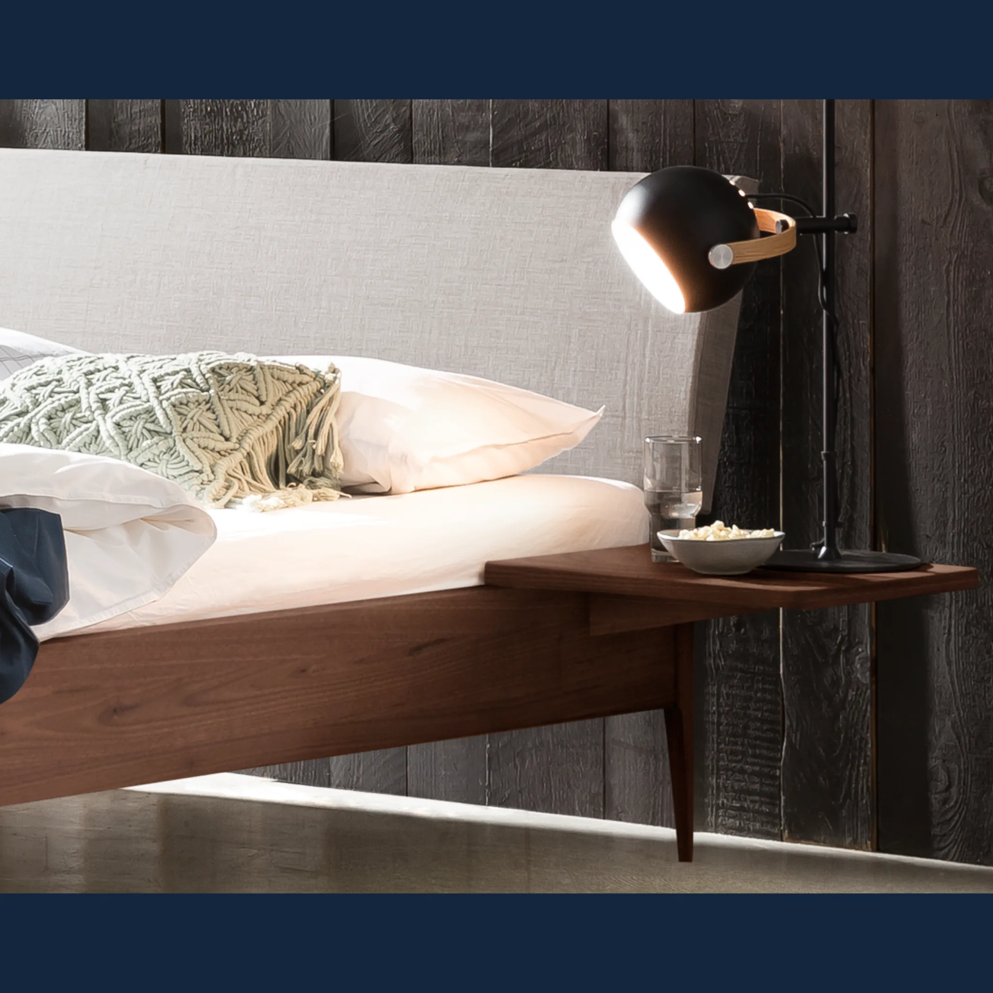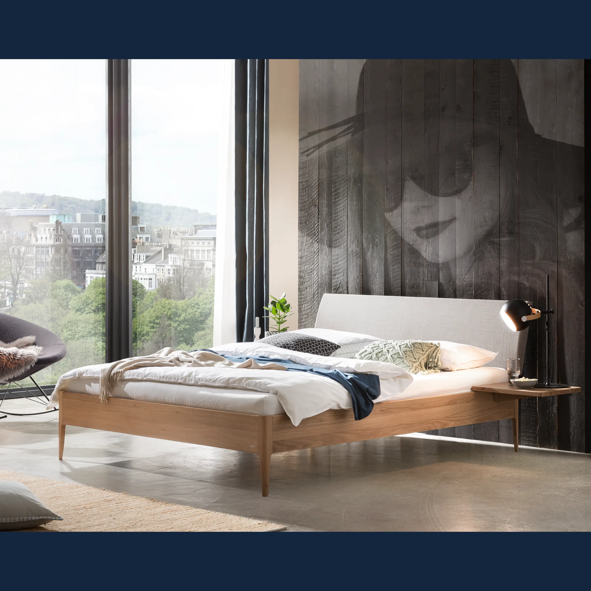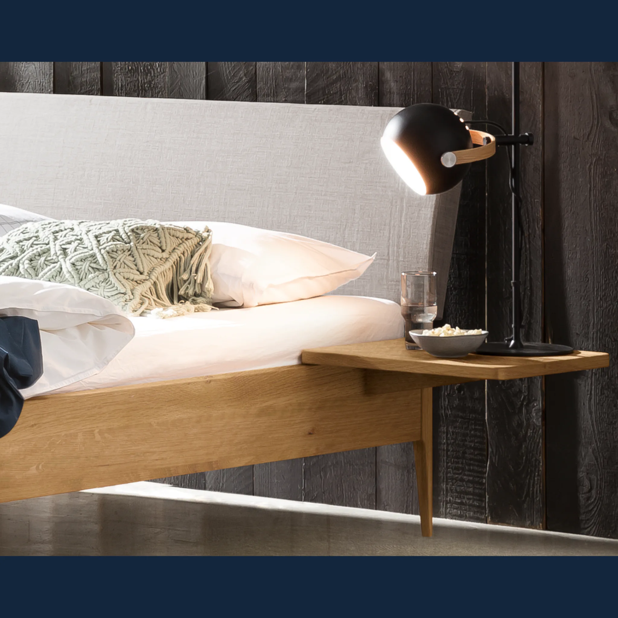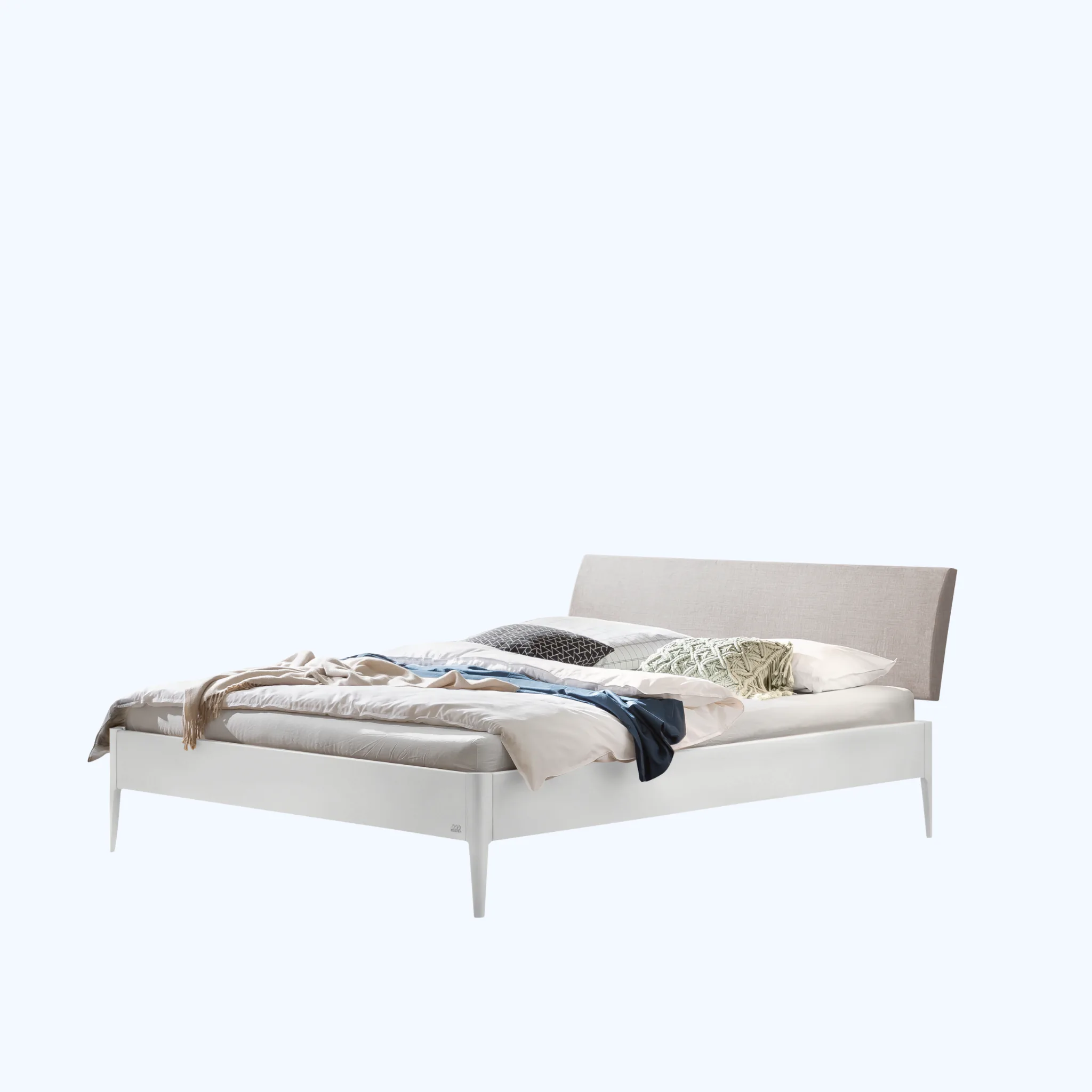 Erleben Sie wertige Haptik und klare Linien. Fanano zeigt eine modern-skandinavische Silhouette mit sanften Radien und schlanken, konischen Füßen. Der Rahmen entsteht aus massivem Hartholz in Möbelqualität und verleiht dem Bett spürbare Stabilität. Die textil gepolsterten Kissen im Bezug Pepe grey bieten angenehme Unterstützung beim Sitzen und Lesen. Geölte oder deckend lackierte Oberflächen bringen natürliche Wärme ins Schlafzimmer und lassen sich vielfältig kombinieren. So entsteht ein Bett, das Ruhe ausstrahlt und den Alltag zuverlässig begleitet.