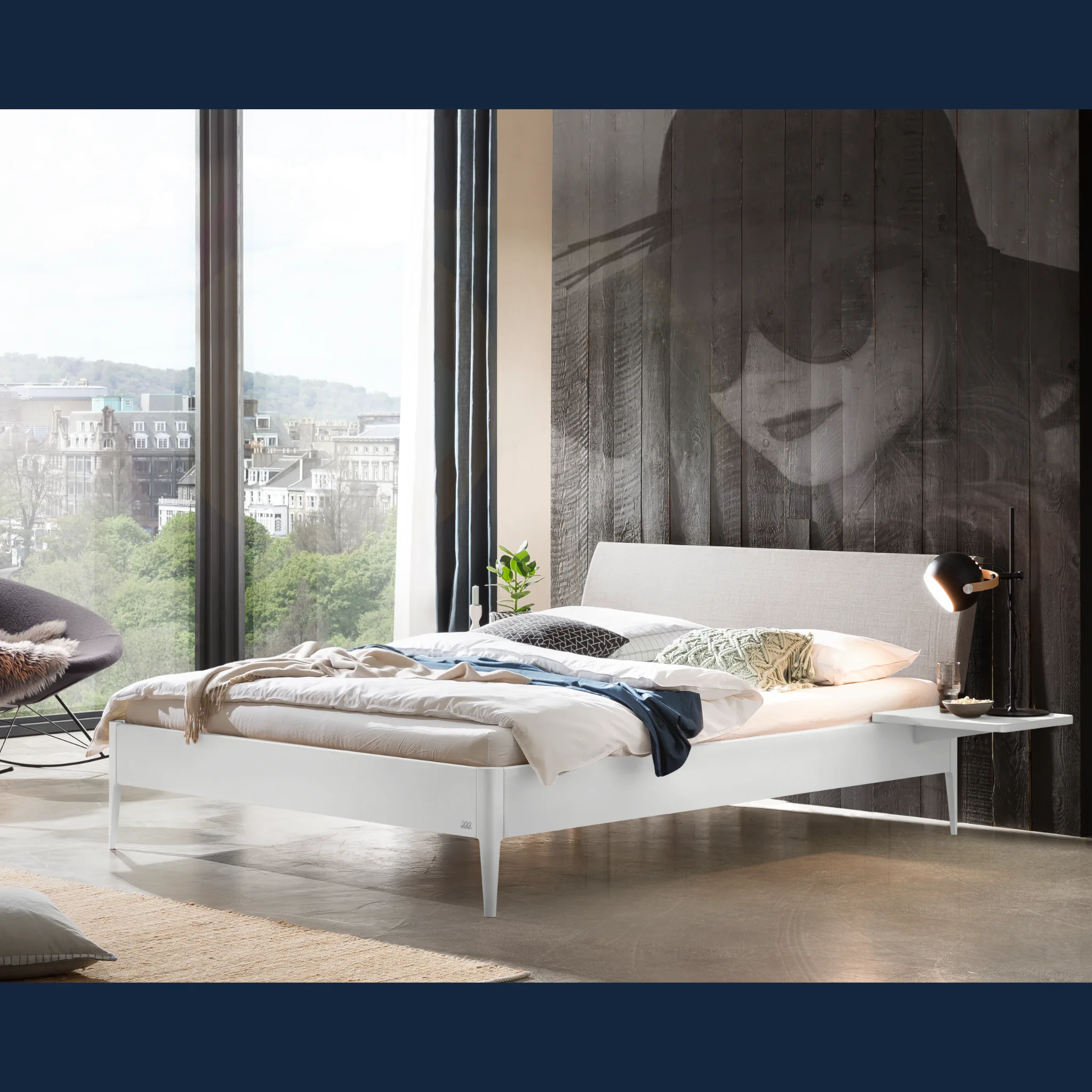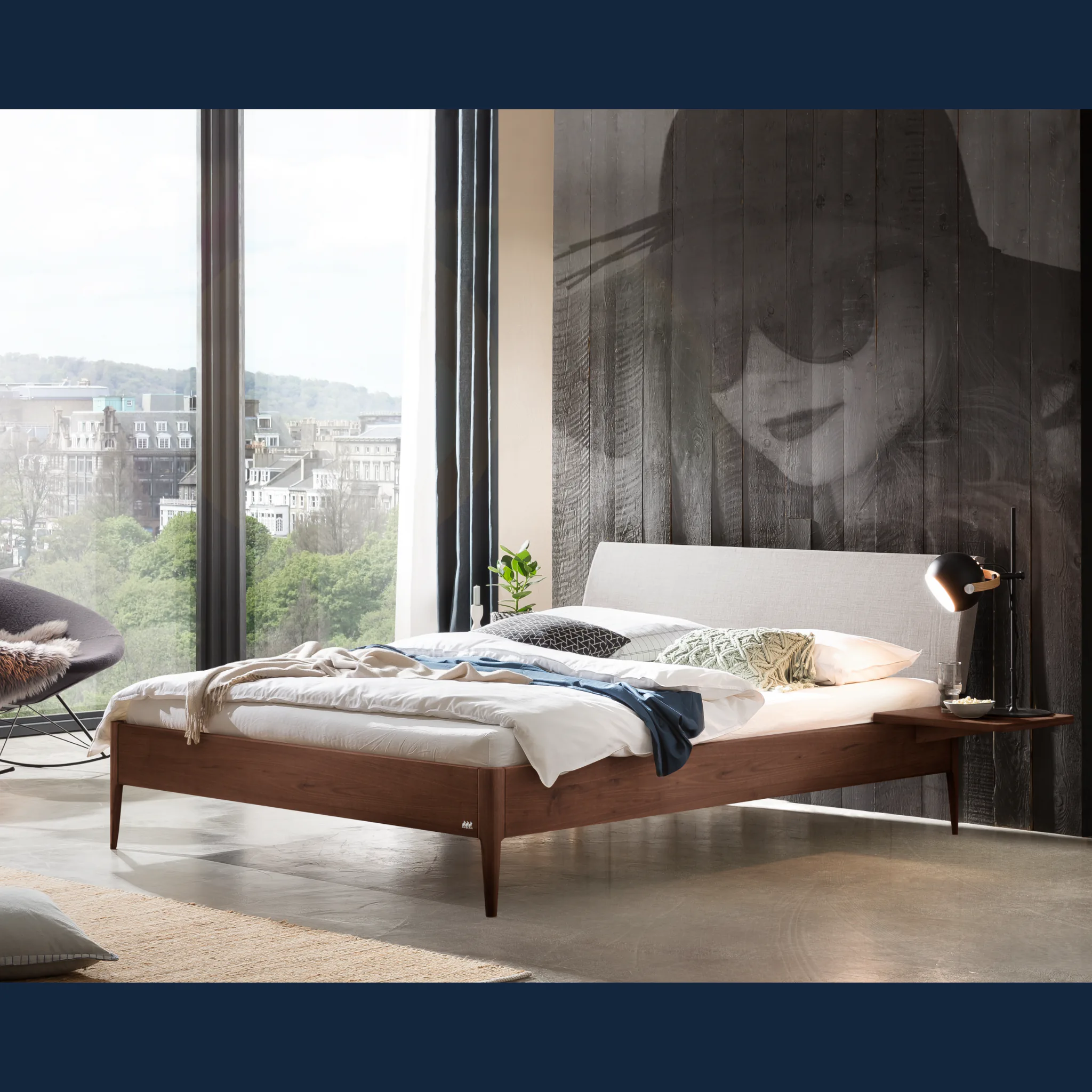Hasena Fanano elegantes Massivholzbett mit gepolstertem stoffbezogenem Kopfteil und feinen Holzfüßen. Einlegetiefe 18 cm. Erhältlich in 12 Größen und 5 Farben.