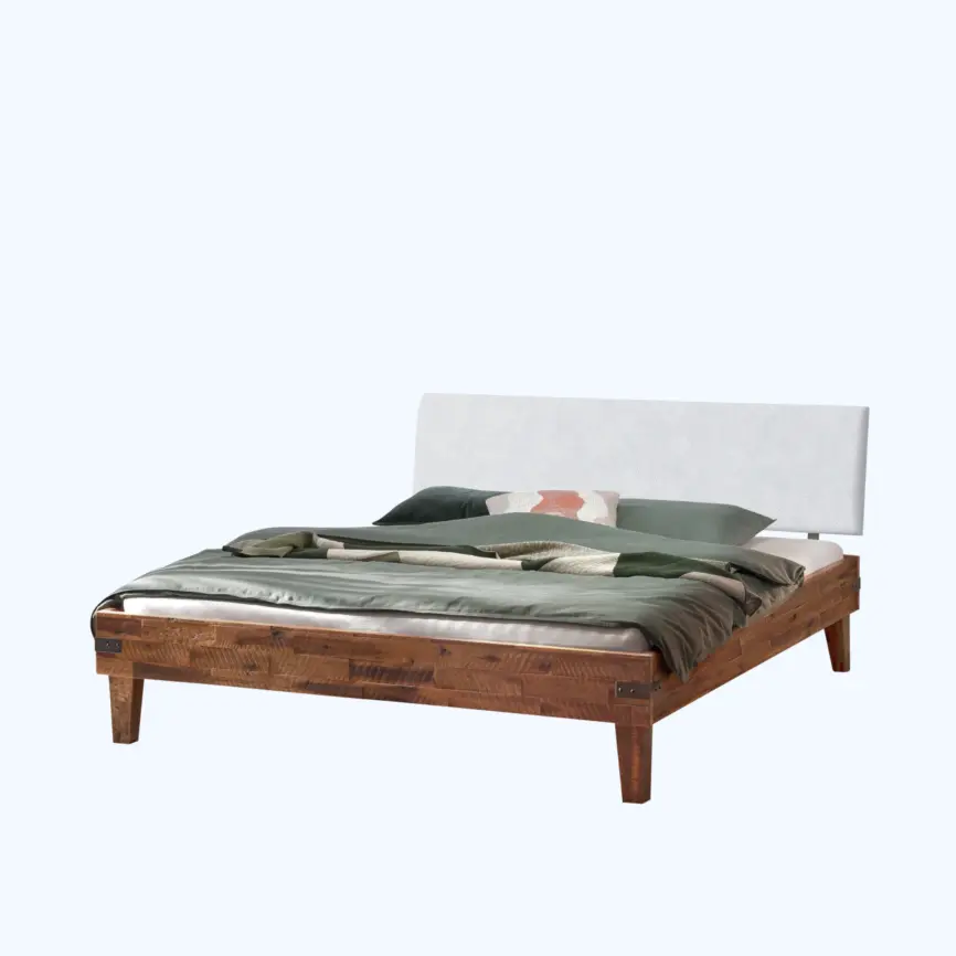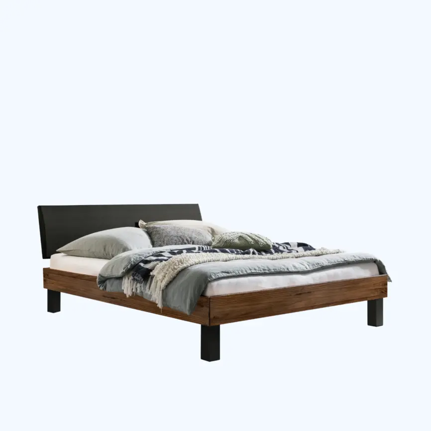 Das geschwungene Kopfteil und die weich abgerundeten Kanten des Rahmens unterstreichen den modernen Stil und setzen gleichzeitig handwerkliche Akzente. Die Kombination aus massivem Holz und dunklem Kunstleder verleiht dem Bett Tiefe und Struktur. Das Ergebnis ist ein Statement-Piece, das Wärme und Klarheit in Ihr Schlafzimmer bringt.Vorteile auf einen Blick