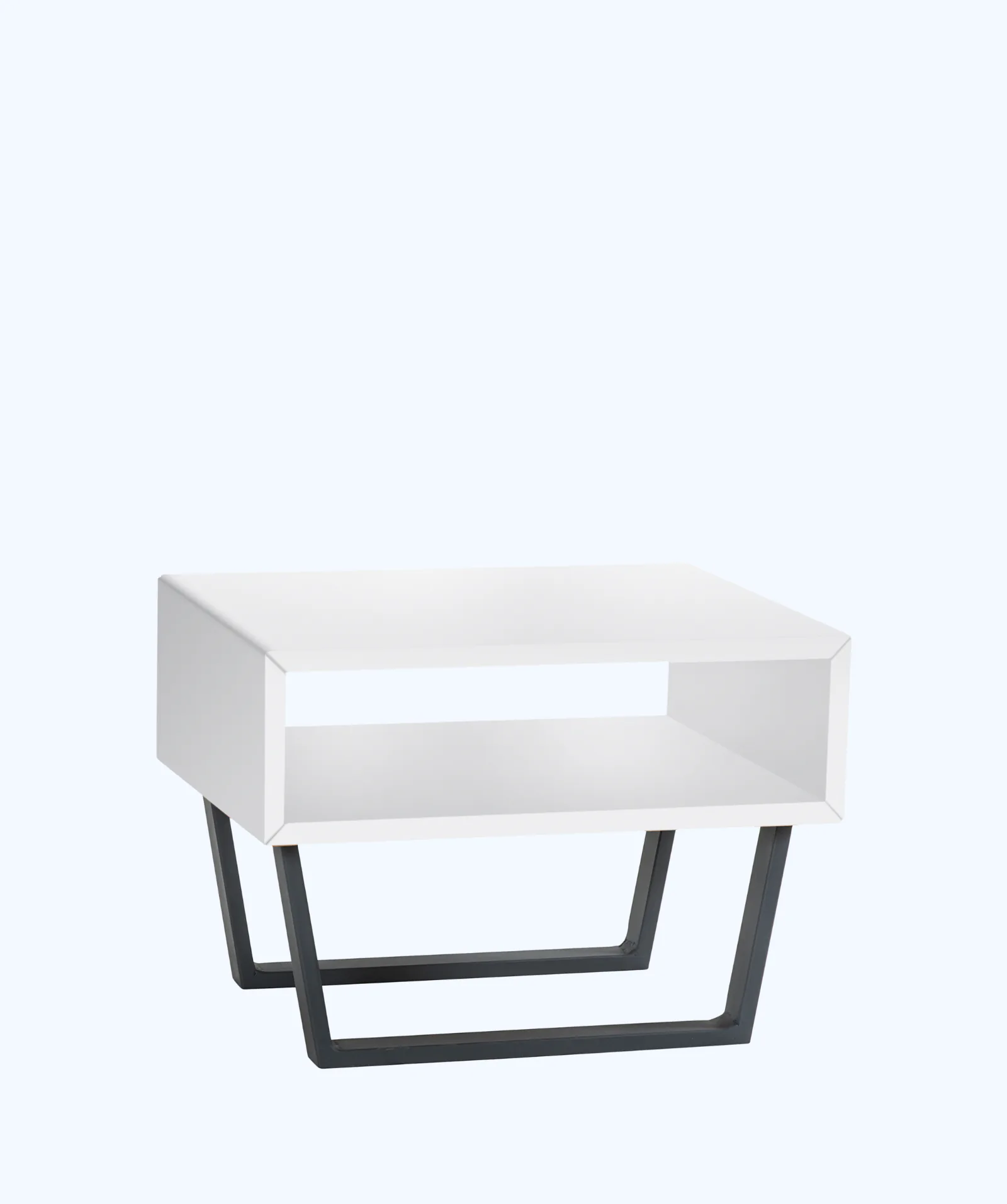 Stilvoller Nachttisch Jose im skandi-industrial Look mit offener Ablage. Massivholz oder MDF, Metallkufen in Anthrazit. Erhältlich in fünf Farben.