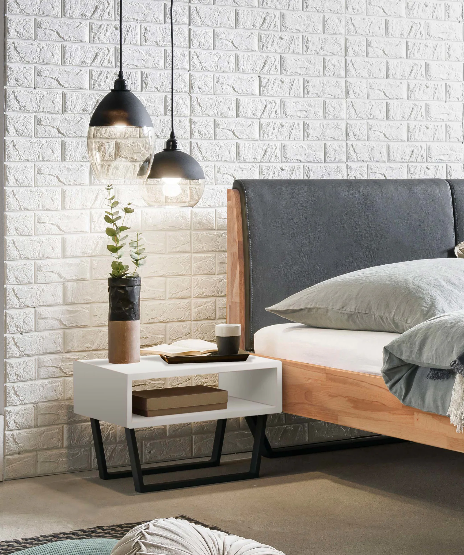 Klar, leicht, funktional: Der Nachttisch Jose bringt skandinavische Ruhe mit industriellem Akzent ans Bett. Offen gestaltete Ablagen halten Wichtiges griffbereit, das kufenartige Metallgestell in Anthrazit sorgt für einen stabilen Auftritt. Zur Wahl stehen MDF weiß lackiert sowie Massivholzvarianten wie Eiche bianco, Kernbuche, Nussbaum und Wildeiche; die geölten Oberflächen unterstreichen die natürliche Wirkung.