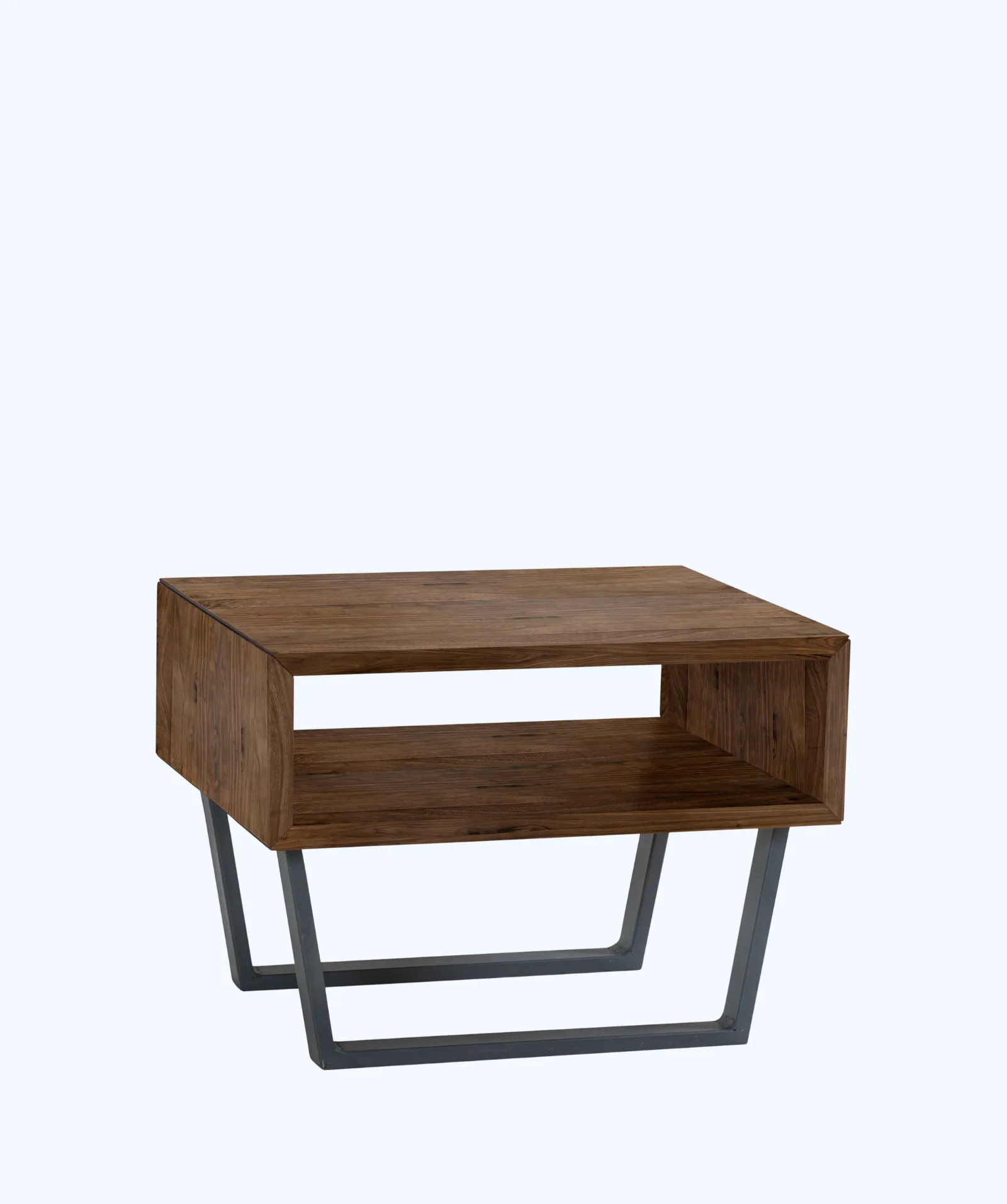Das skandinavisch-industrielle Design harmoniert mit Holz- und Polsterbetten. Die warmen Holzfarben setzen ruhige Akzente, das dunkle Metall bringt grafische Klarheit. Kompakte Maße von 50×41×36 cm erleichtern die Platzierung; das Innenfach misst 46×41×12 cm für Lesestoff und Accessoires.