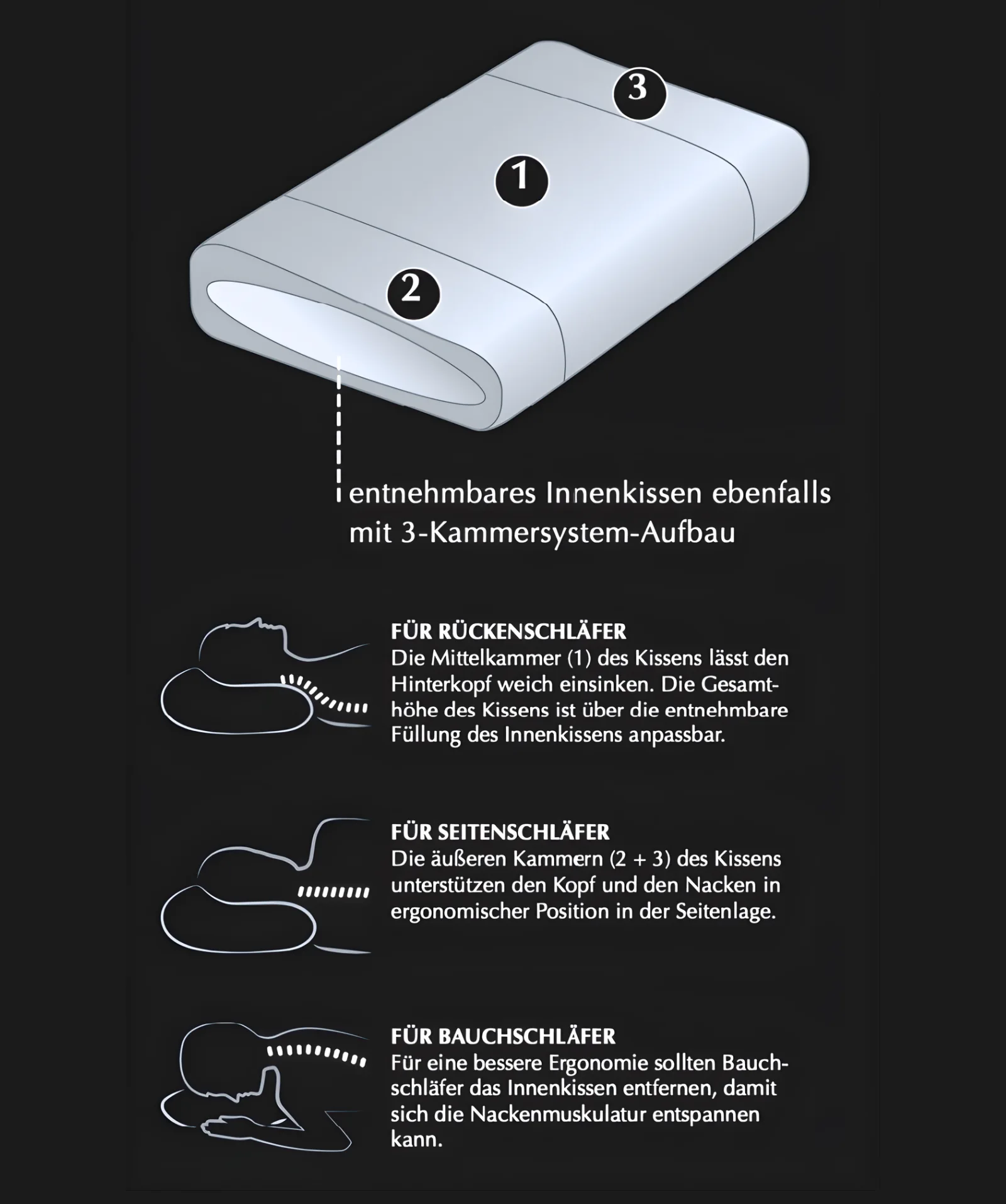 - Sanft gebettet einschlafen: Der mehrkammerige Aufbau mit zusätzlichem Innenkissen nimmt Kopf und Nacken weich auf, sodass Sie bequem in Rücken-, Seiten- oder Bauchlage zur Ruhe kommen und dauerhaft ein stimmiges Liegegefühl behalten.
