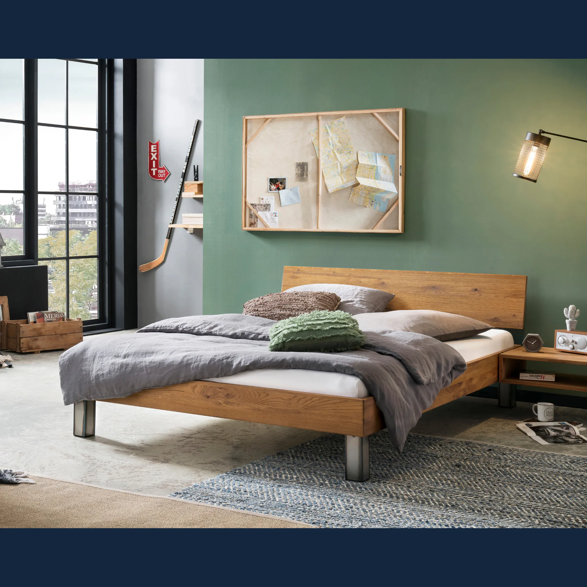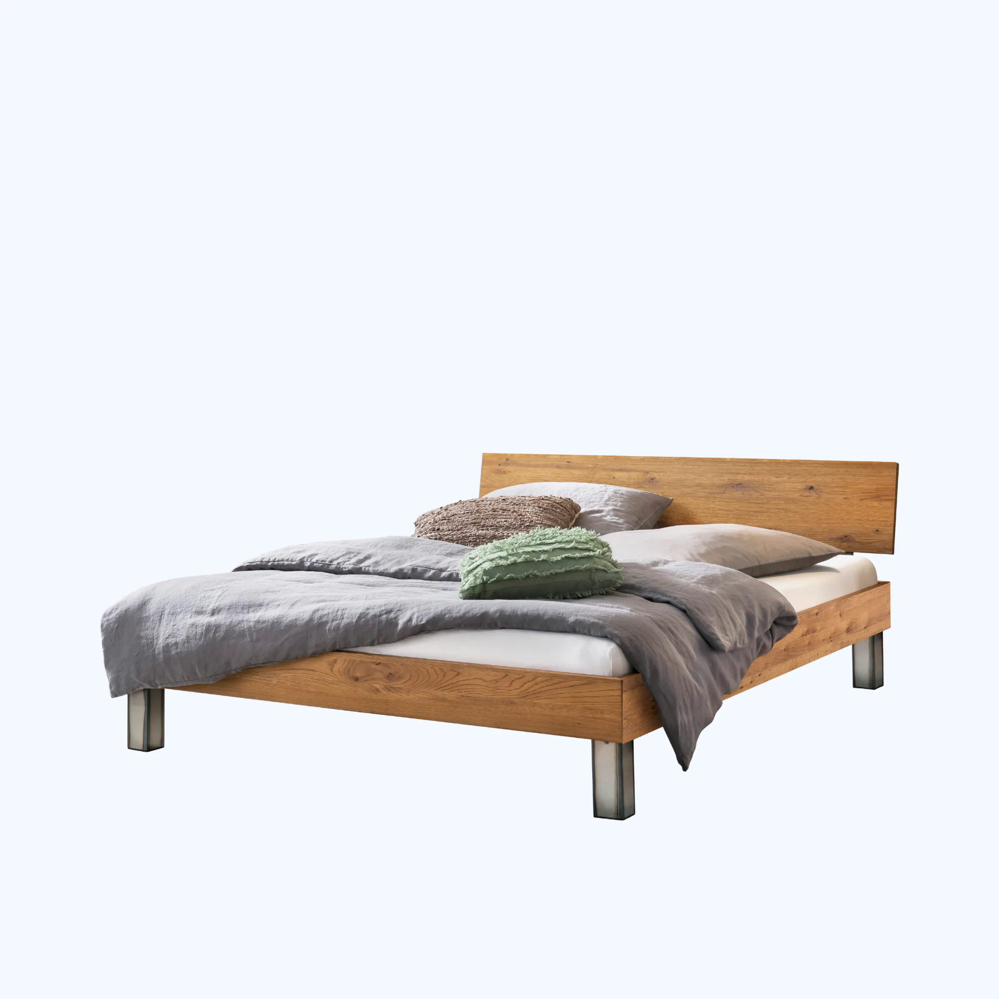 Hasena Lodi puristisches Massivholzbett aus Eiche mit stabilen Metallfüßen und geölter Oberfläche. Einlegetiefe ca. 16 cm. Erhältlich in 14 Größen und 2 Farben.