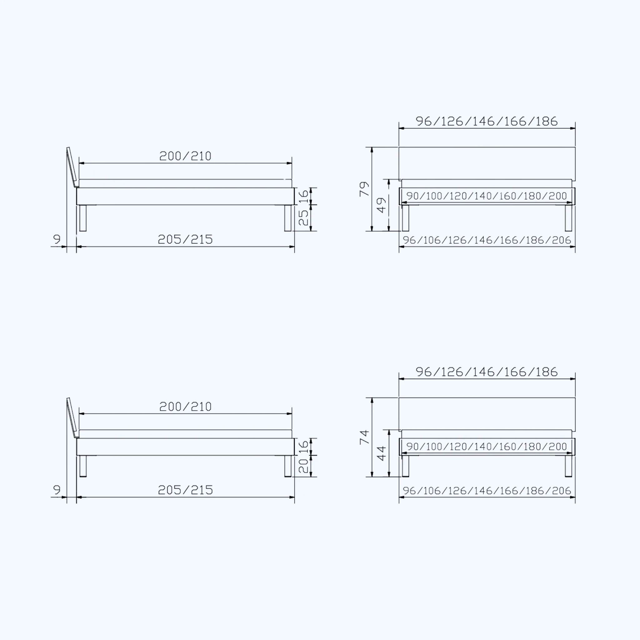 | Maße (Breite x Länge x Höhe) | 106x214x74 cm, 106x214x79 cm, 106x224x74 cm, 106x224x79 cm, 126x214x74 cm, 126x214x79 cm, 126x224x74 cm, 126x224x79 cm, 146x214x74 cm, 146x214x79 cm, 146x224x74 cm, 146x224x79 cm, 166x214x74 cm, 166x214x79 cm, 166x224x74 cm, 166x224x79 cm, 186x214x74 cm, 186x214x79 cm, 186x224x74 cm, 186x224x79 cm, 206x214x74 cm, 206x214x79 cm, 206x224x74 cm, 206x224x79 cm, 96x214x74 cm, 96x214x79 cm, 96x224x74 cm, 96x224x79 cm |