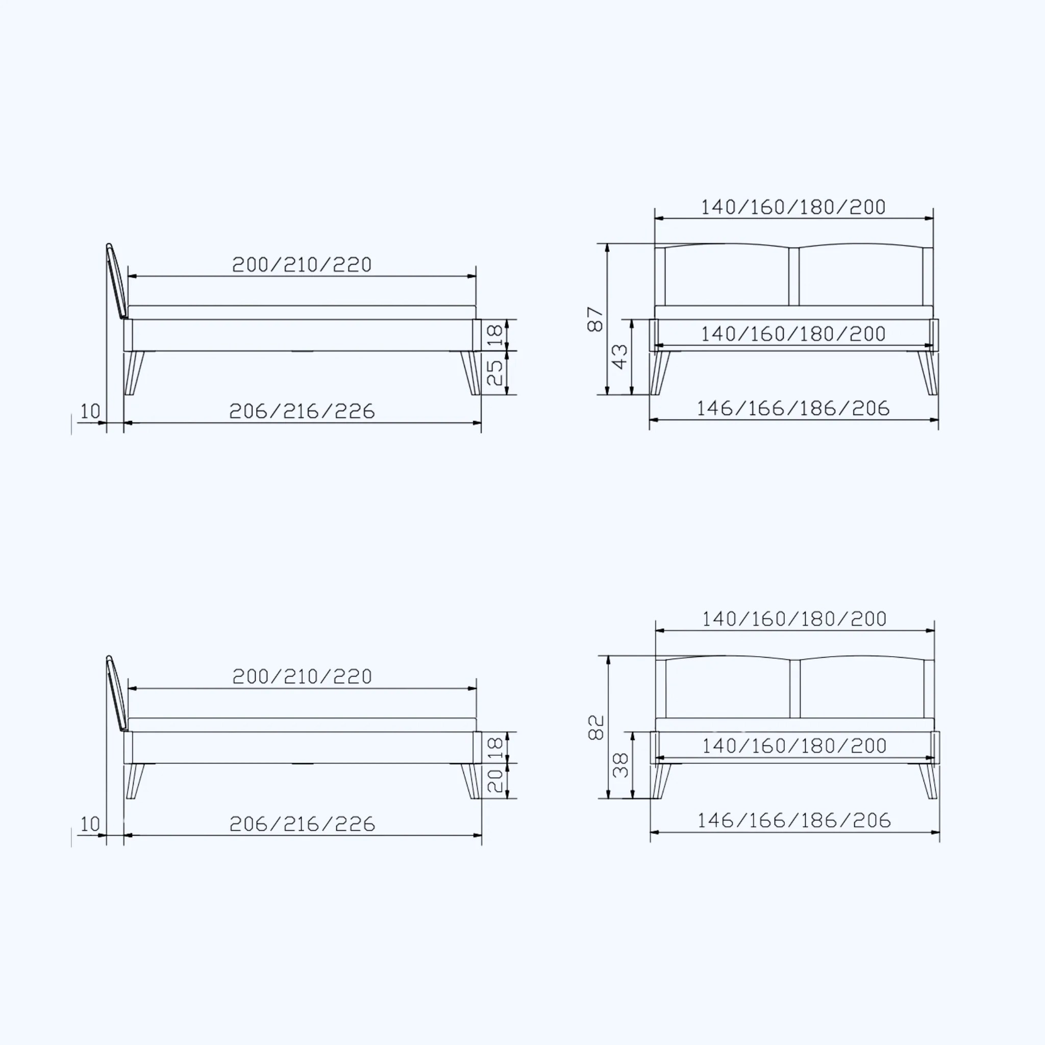 | Liegefläche | 140×200 cm, 140×210 cm, 140×220 cm, 160×200 cm, 160×210 cm, 160×220 cm, 180×200 cm, 180×210 cm, 180×220 cm, 200×200 cm, 200×210 cm, 200×220 cm |