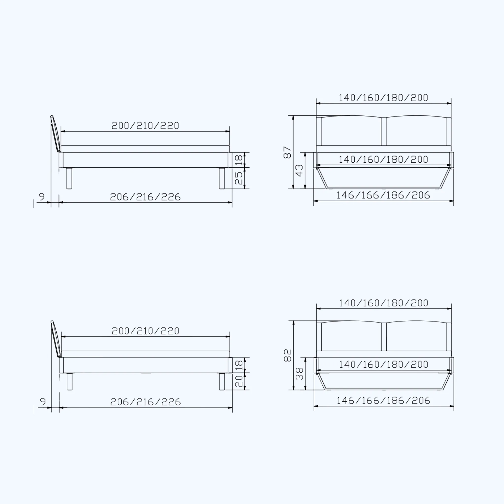 | Maße (Breite x Länge x Höhe) | 146x216x82 cm, 146x216x87 cm, 146x226x82 cm, 146x226x87 cm, 146x236x82 cm, 146x236x87 cm, 166x216x82 cm, 166x216x87 cm, 166x226x82 cm, 166x226x87 cm, 166x236x82 cm, 166x236x87 cm, 186x216x82 cm, 186x216x87 cm, 186x226x82 cm, 186x226x87 cm, 186x236x82 cm, 186x236x87 cm, 206x216x82 cm, 206x216x87 cm, 206x226x82 cm, 206x226x87 cm, 206x236x82 cm, 206x236x87 cm |