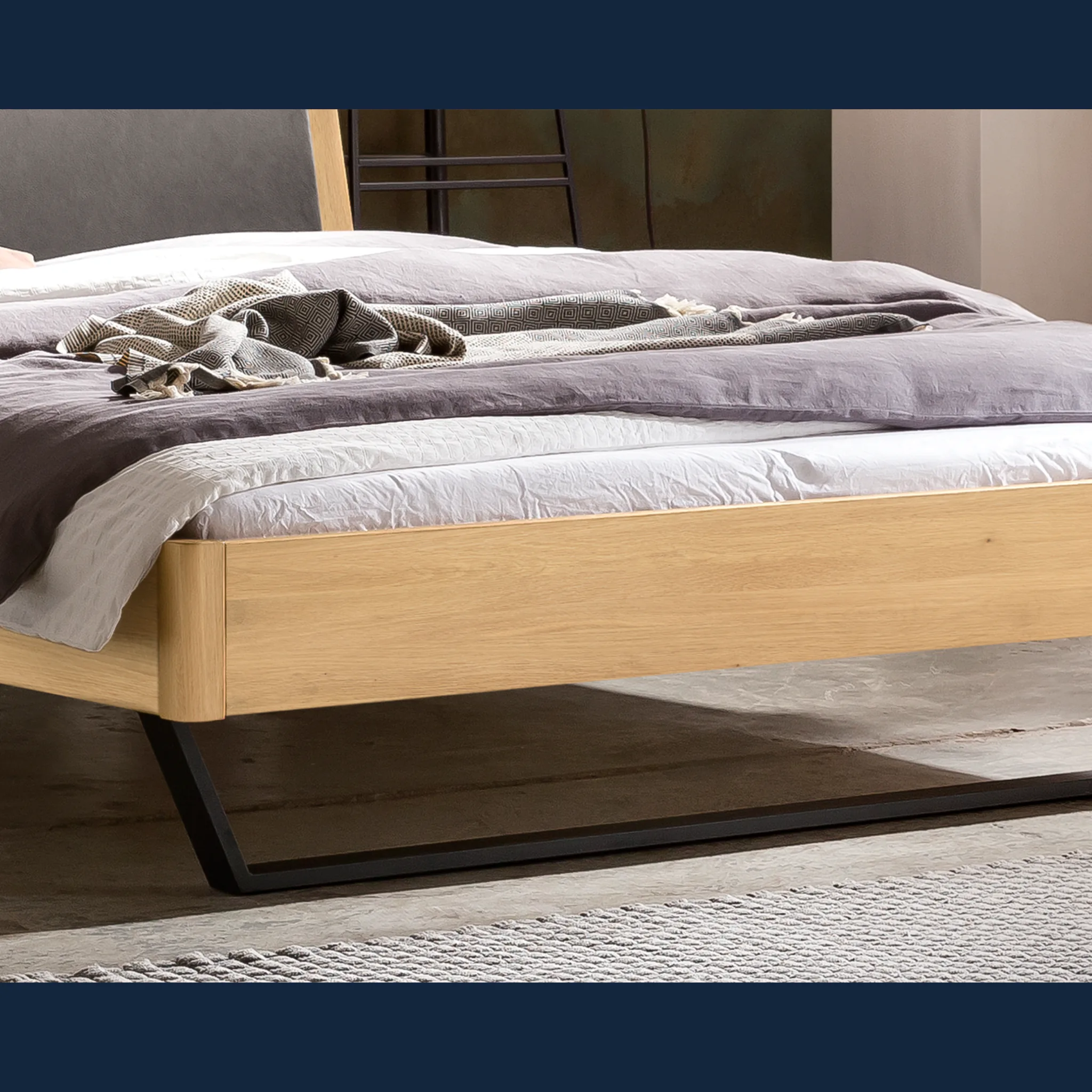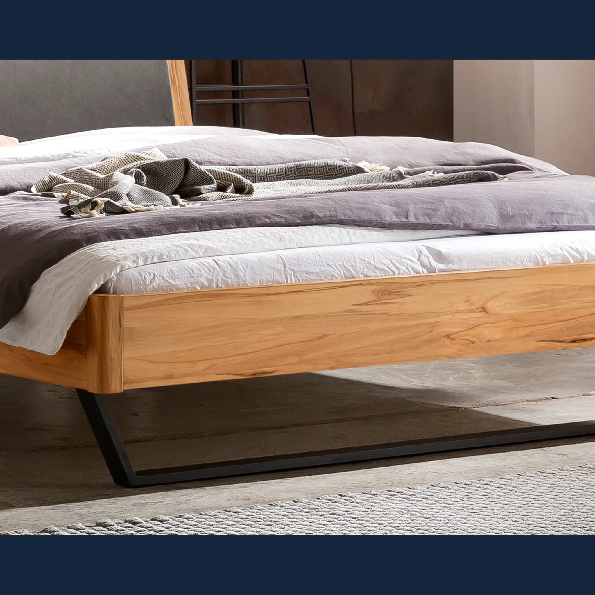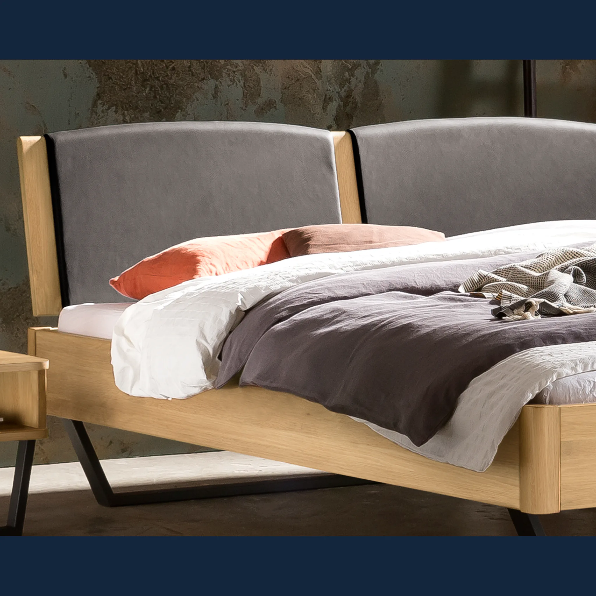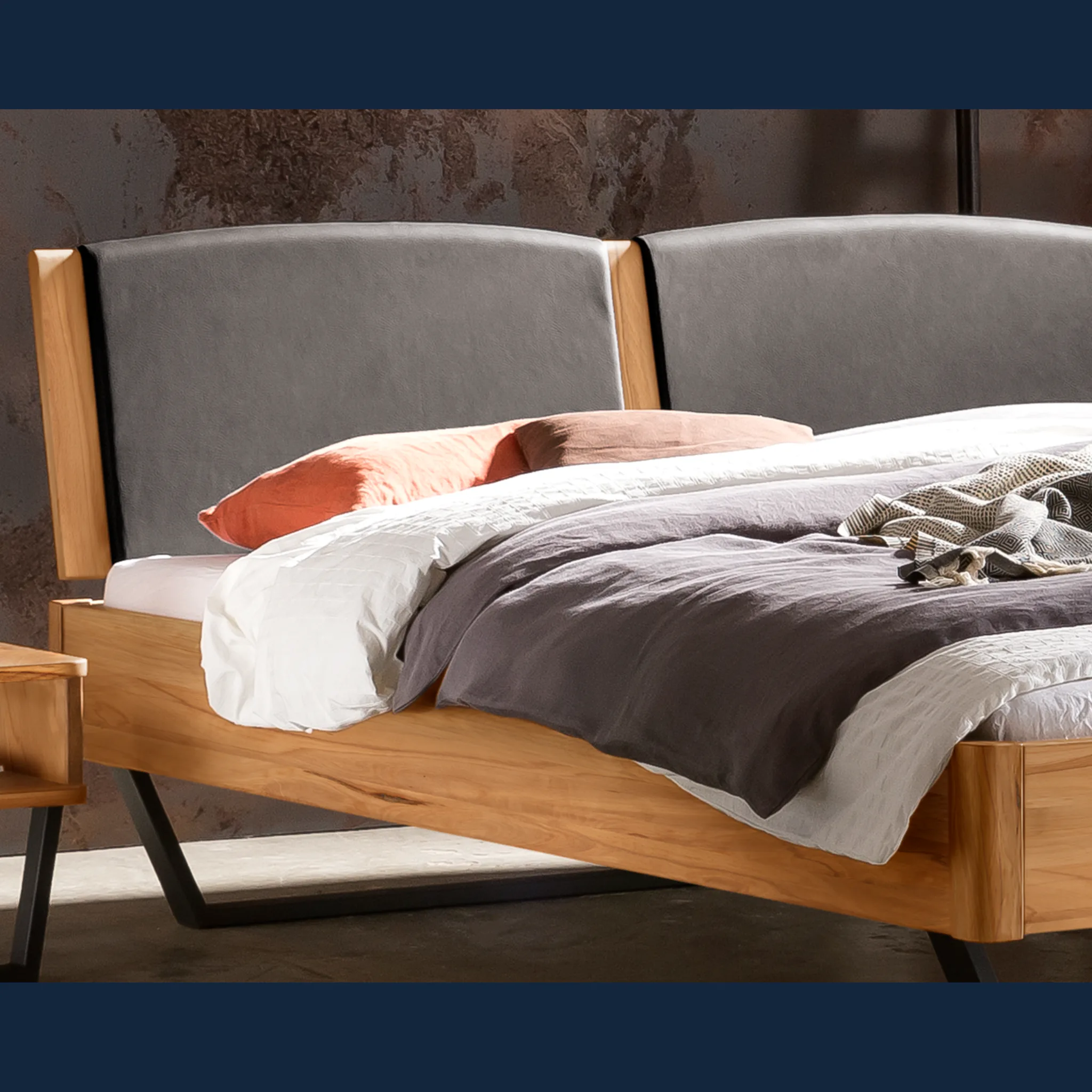 Massivholzbett Hasena Marola mit gepolstertem Kunstleder-Kopfteil und stabilen Stahlkufen – Ruhe und Stil für Ihr Schlafzimmer. Verfügbar in 12 Größen & 4 Farben.