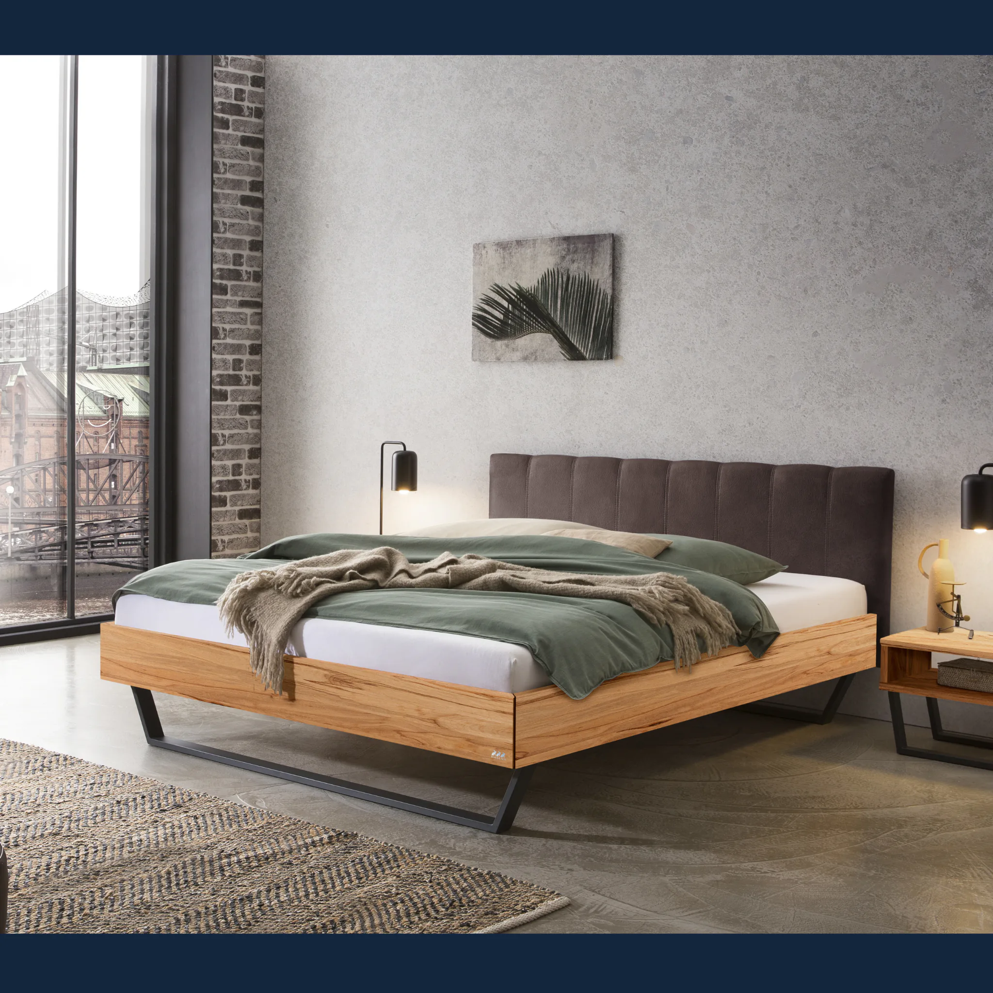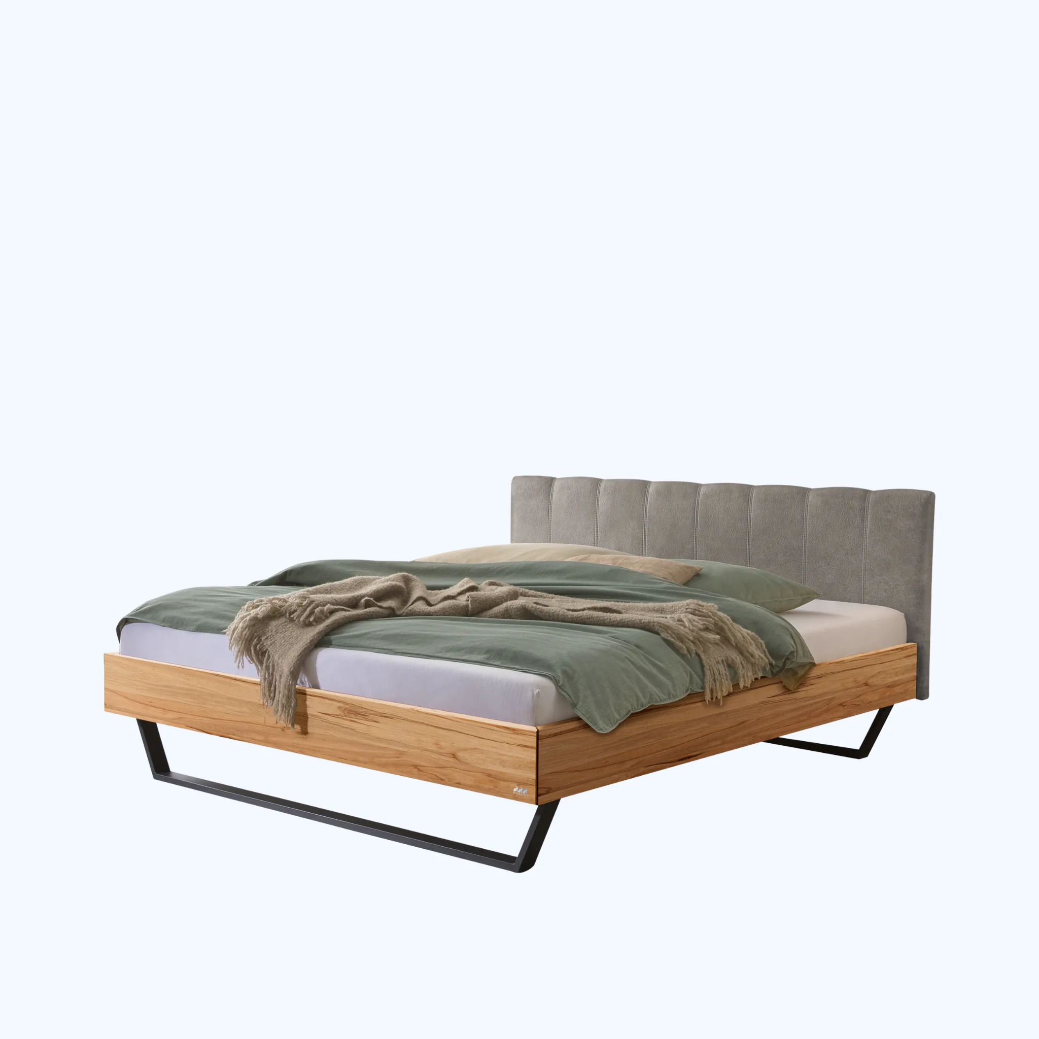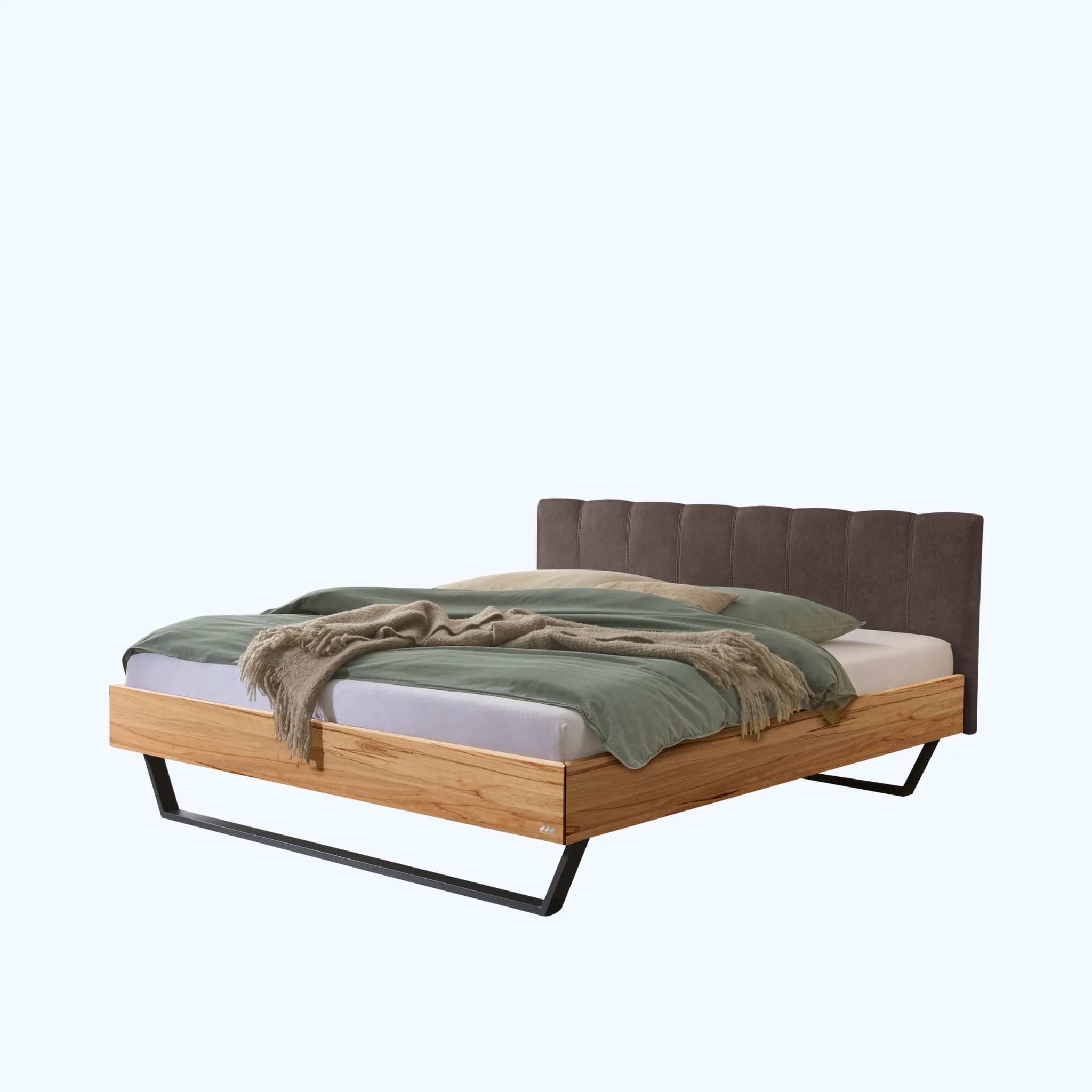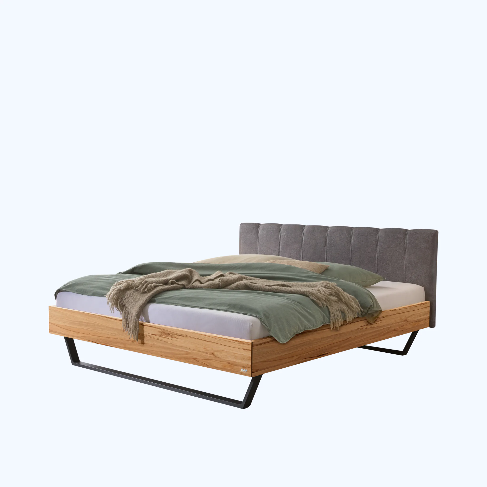 Urbanes Massivholzbett Hasena Enrico mit stoffbezogenem Kopfteil und V-Metallkufen. Einlegetiefe 18 cm. Holzrahmen geölt. Erhältlich in 3 Größen und 3 Farben.