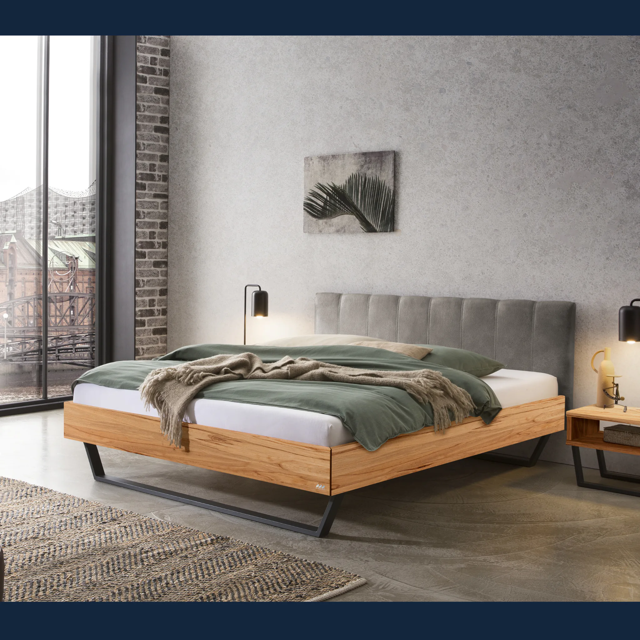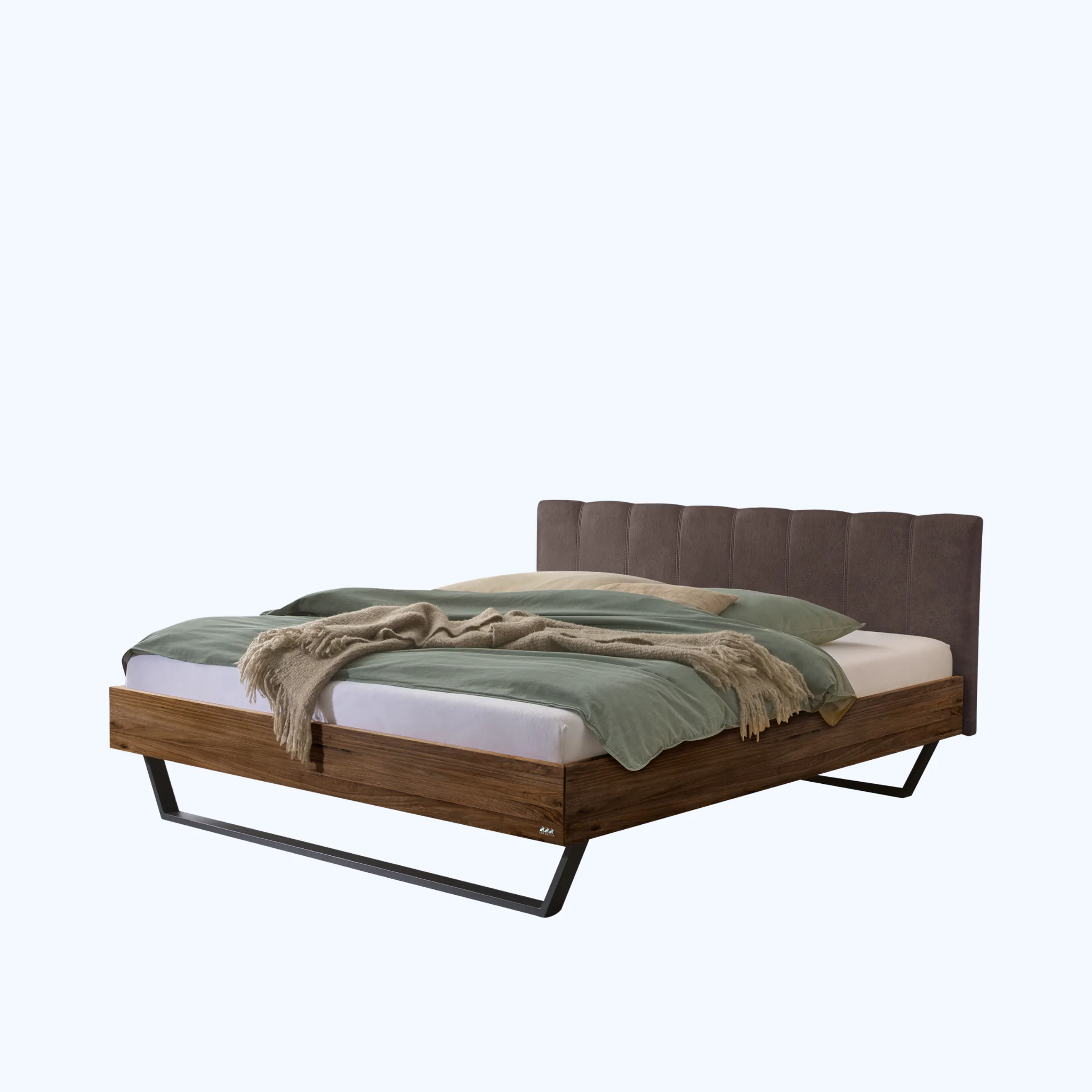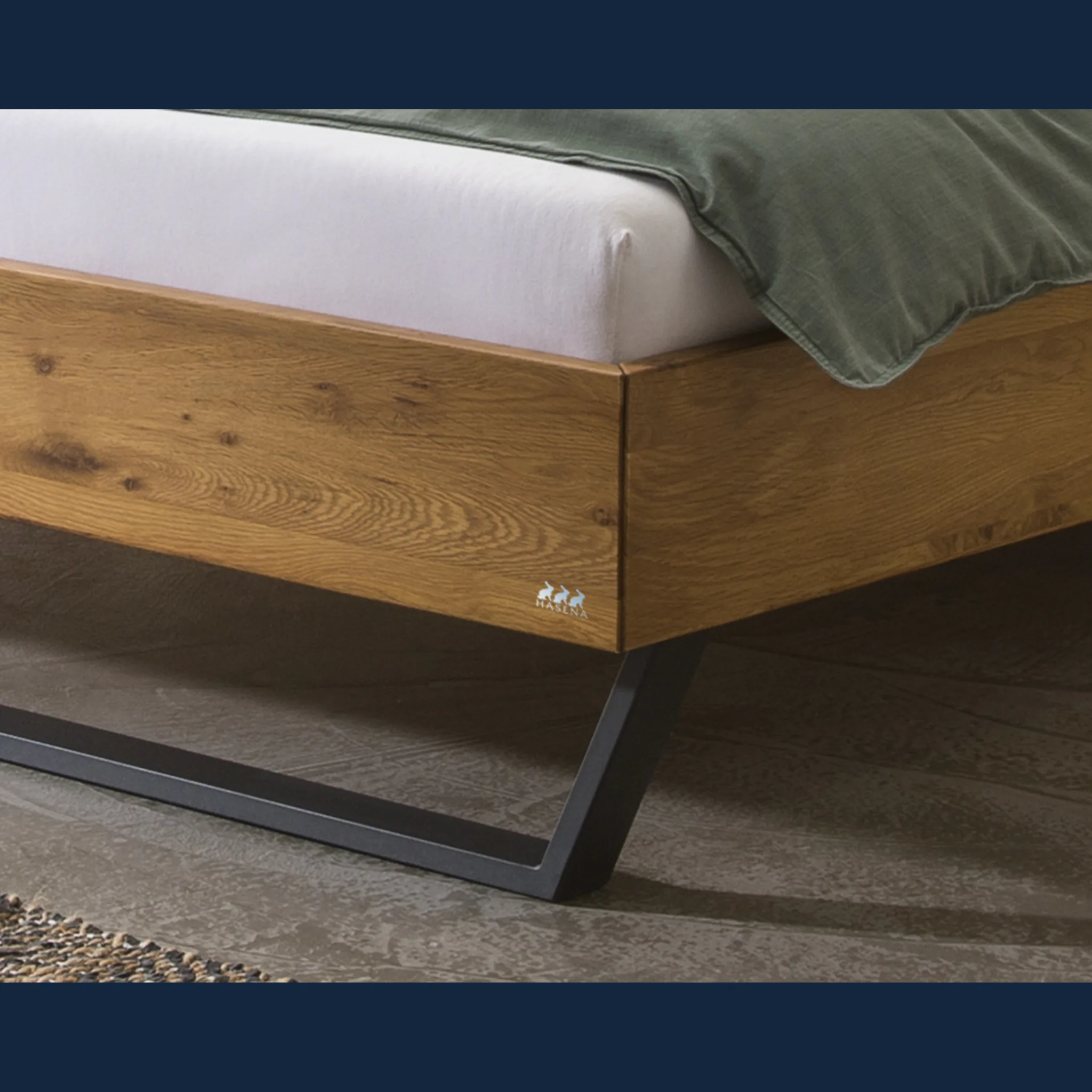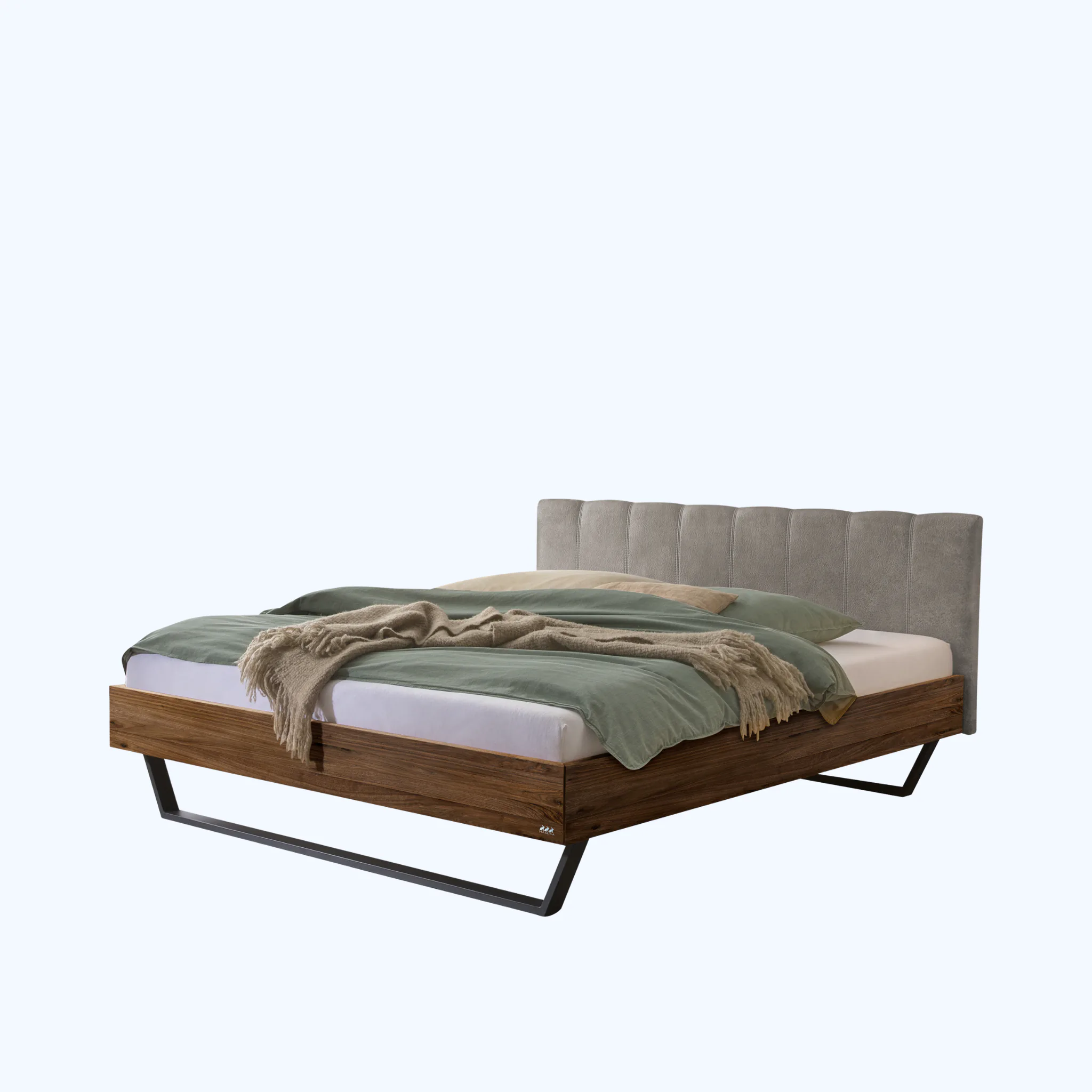 Urbanes Massivholzbett Hasena Enrico mit stoffbezogenem Kopfteil und V-Metallkufen. Einlegetiefe 18 cm. Holzrahmen geölt. Erhältlich in 3 Größen und 3 Farben.