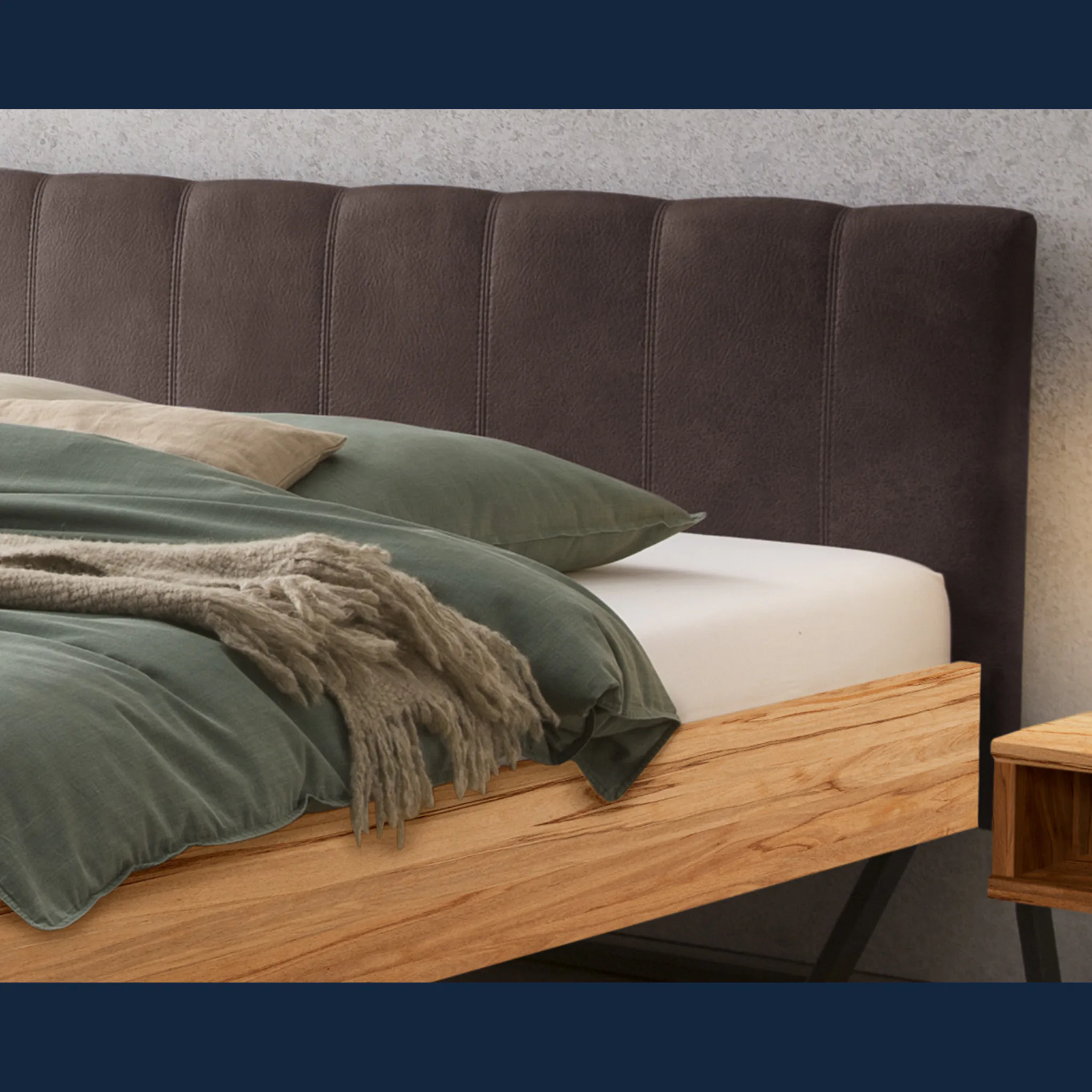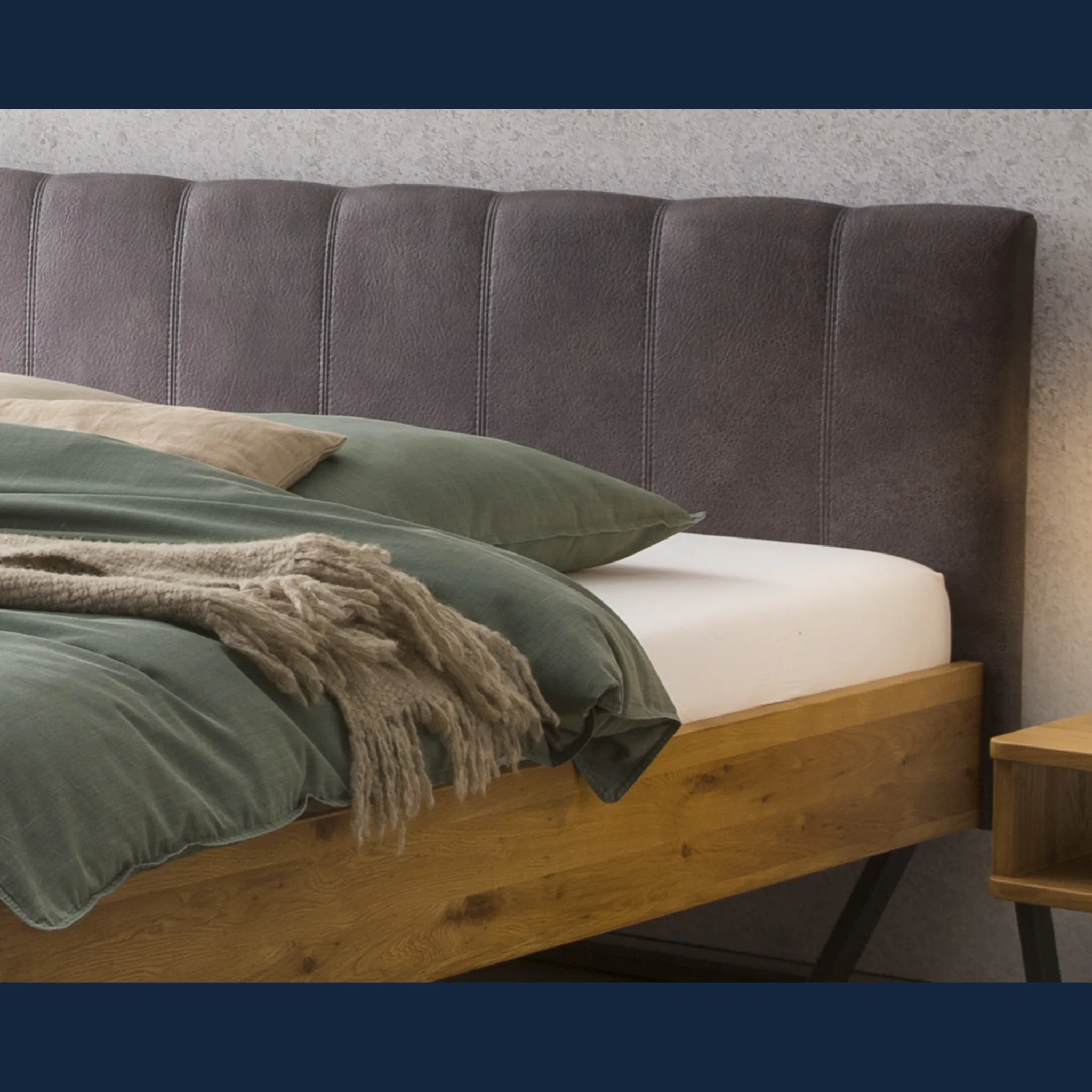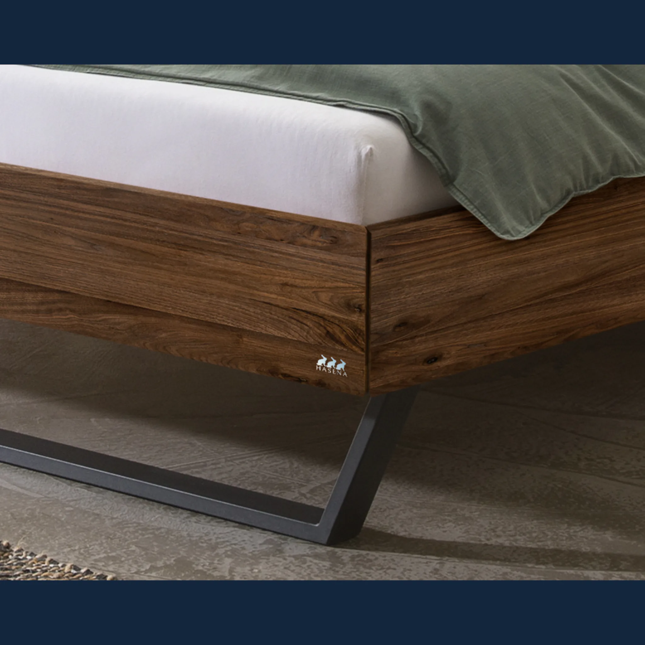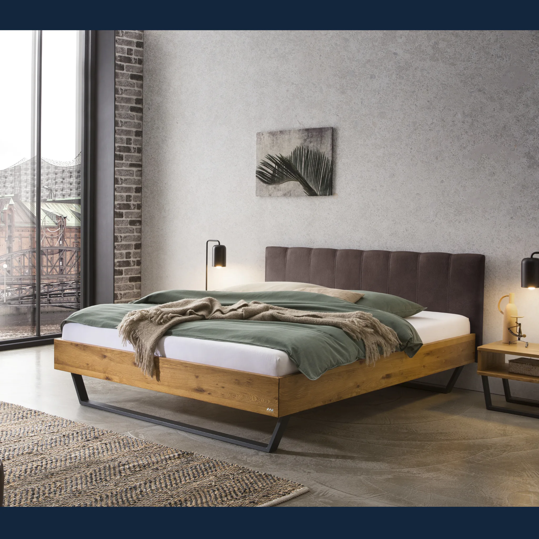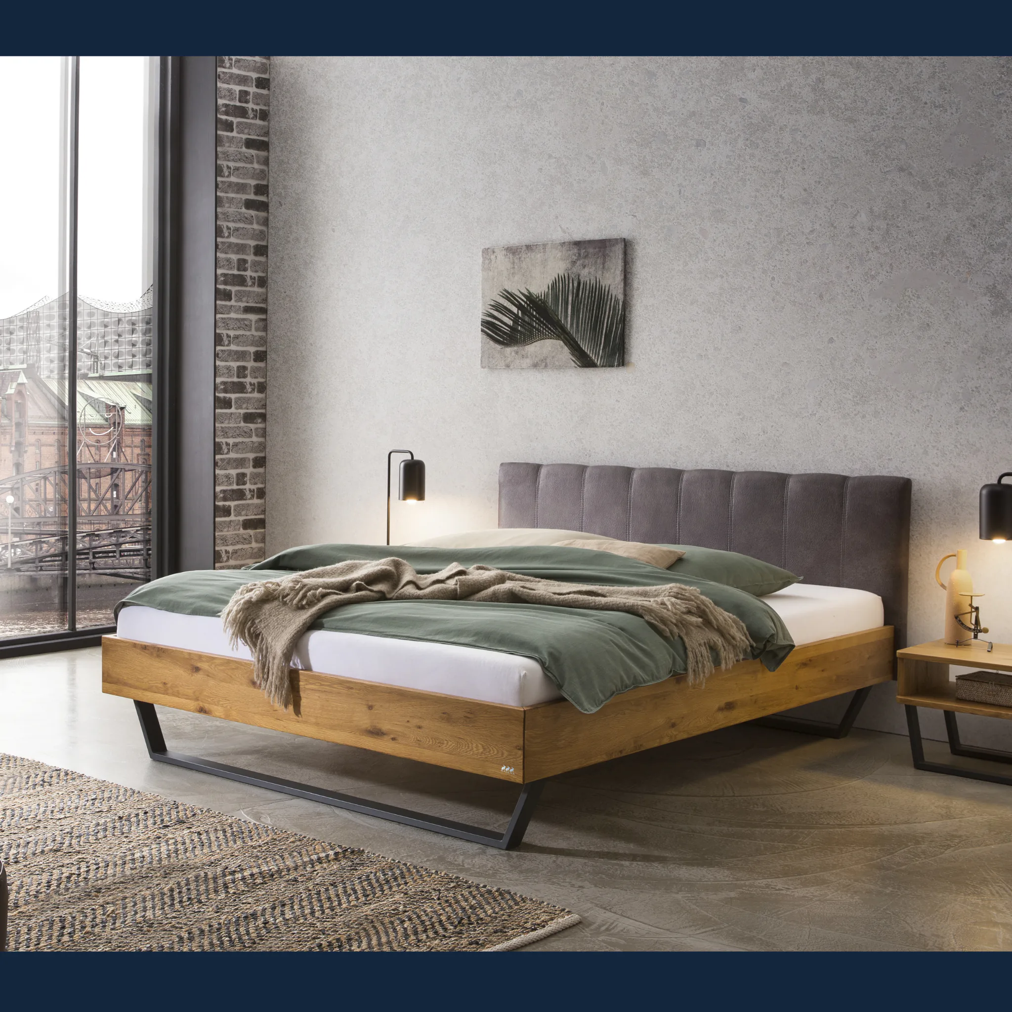 Urbanes Massivholzbett Hasena Enrico mit stoffbezogenem Kopfteil und V-Metallkufen. Einlegetiefe 18 cm. Holzrahmen geölt. Erhältlich in 3 Größen und 3 Farben.