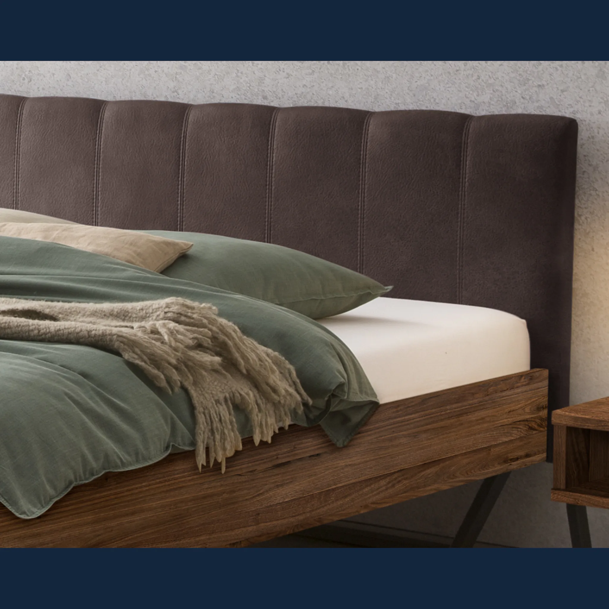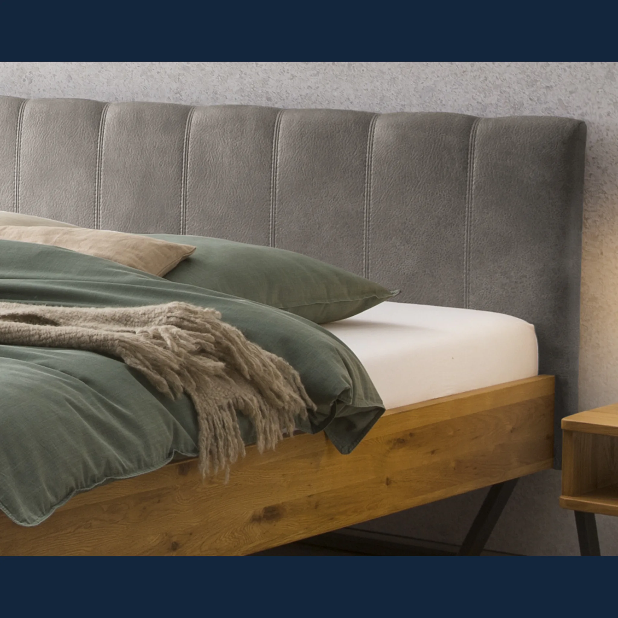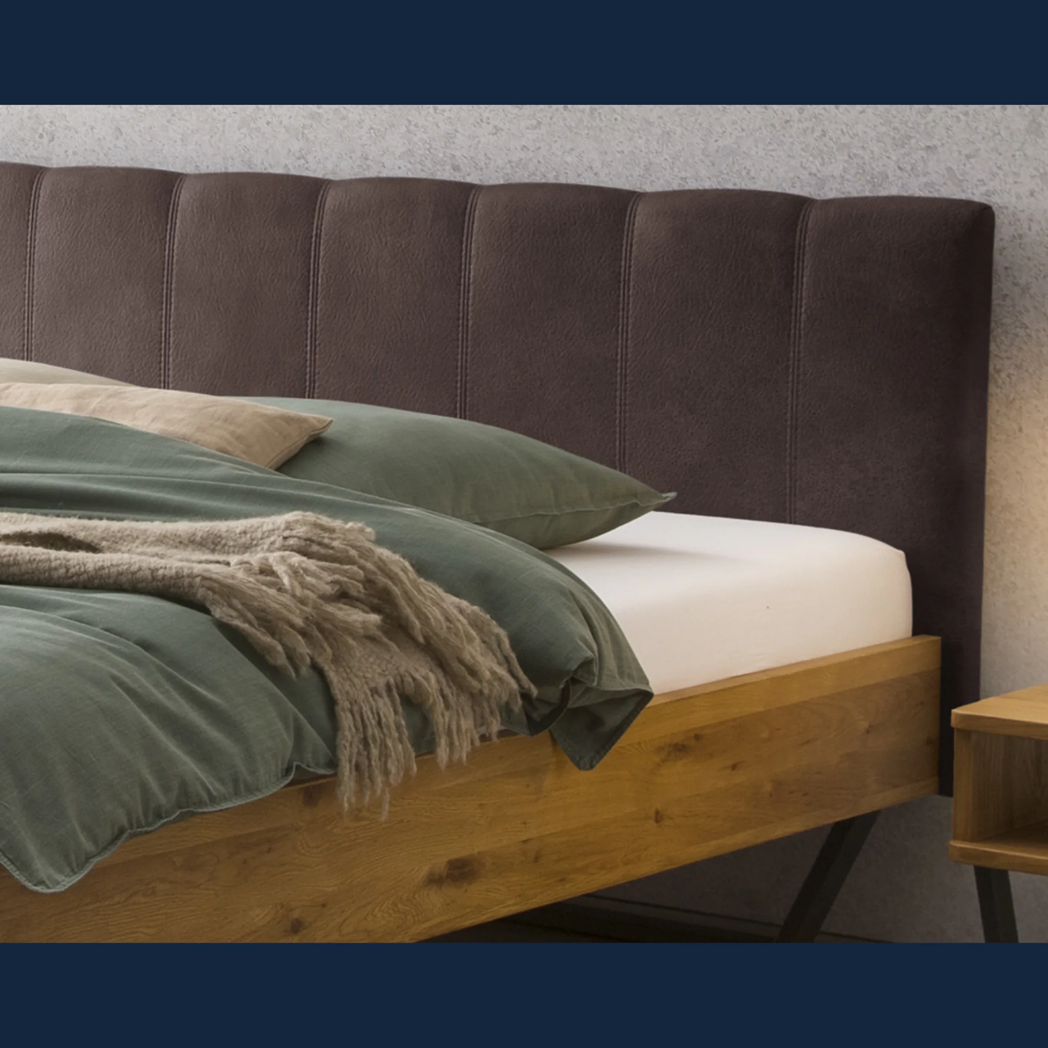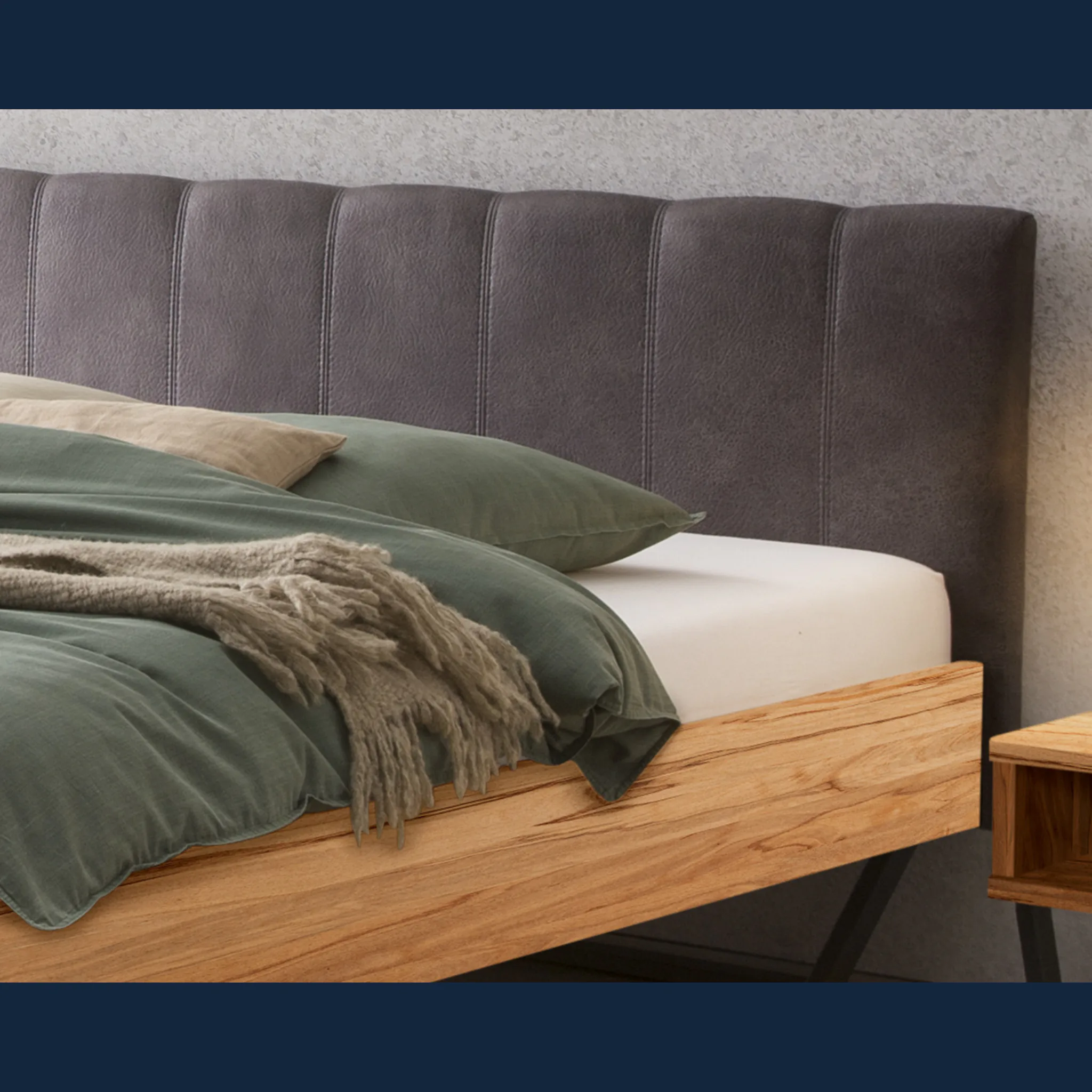 Urbanes Massivholzbett Hasena Enrico mit stoffbezogenem Kopfteil und V-Metallkufen. Einlegetiefe 18 cm. Holzrahmen geölt. Erhältlich in 3 Größen und 3 Farben.