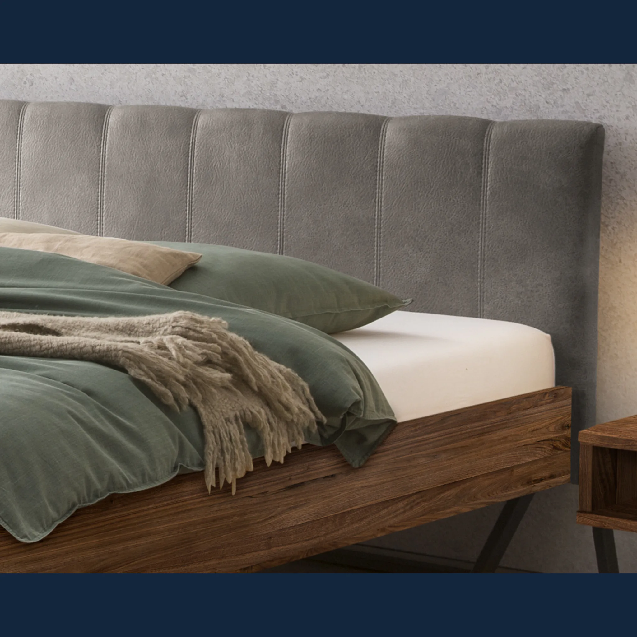 Erleben Sie wertige Haptik und klare Linien. Massivholzbett Hasena Enrico vereint ruhige Formgebung mit einem urbanen Industrial Akzent. Der Rahmen aus massivem Hartholz in Möbelqualität zeigt eine feine Maserung und wirkt warm. Das weich gepolsterte Kopfteil im robusten, pflegeleichten Stoffbezug Buffalo setzt eine textile Note. V-förmige Kufen aus pulverbeschichtetem Qualitätsstahl tragen die Konstruktion souverän und geben dem Bett eine schwebende Leichtigkeit. So entsteht ein Mittelpunkt im Schlafzimmer, der Ordnung fördert und beständige Begleitung im Alltag bietet.Massivholzbett Hasena Enrico – Vorteile im Überblick