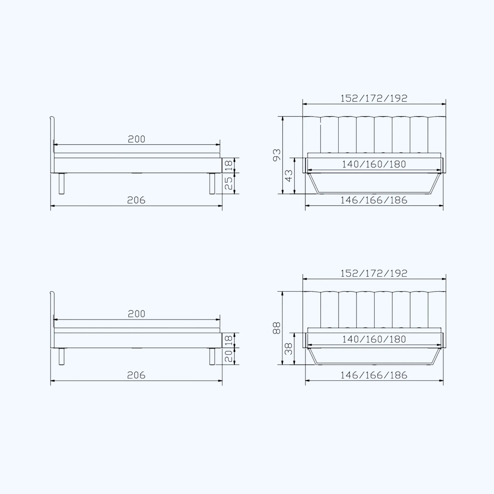 | Maße (Breite x Länge x Höhe) | 152x206x88 cm, 152x206x93 cm, 172x206x88 cm, 172x206x93 cm, 192x206x88 cm, 192x206x93 cm |