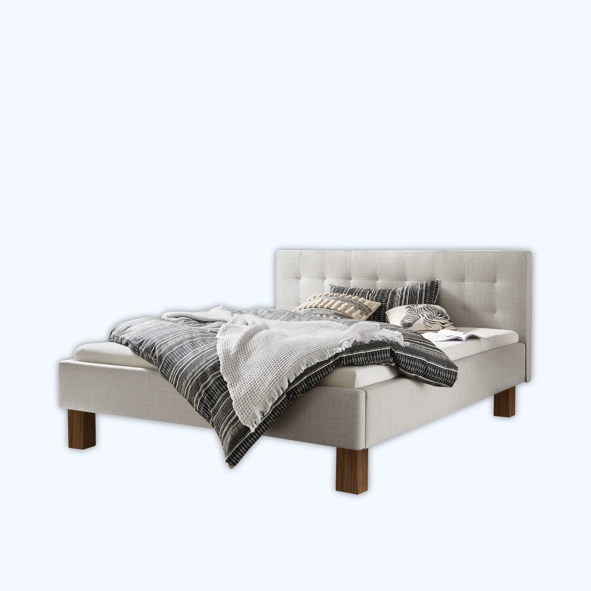 Elegantes Polsterbett mit gepolstertem Kopfteil und solider Ausführung. Massivholzfüße in wählbarer Höhe und Farbe für harmonische Raumgestaltung.