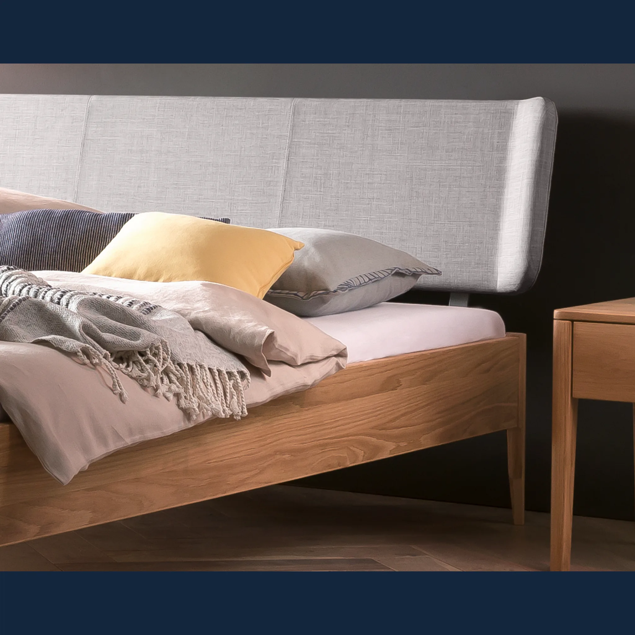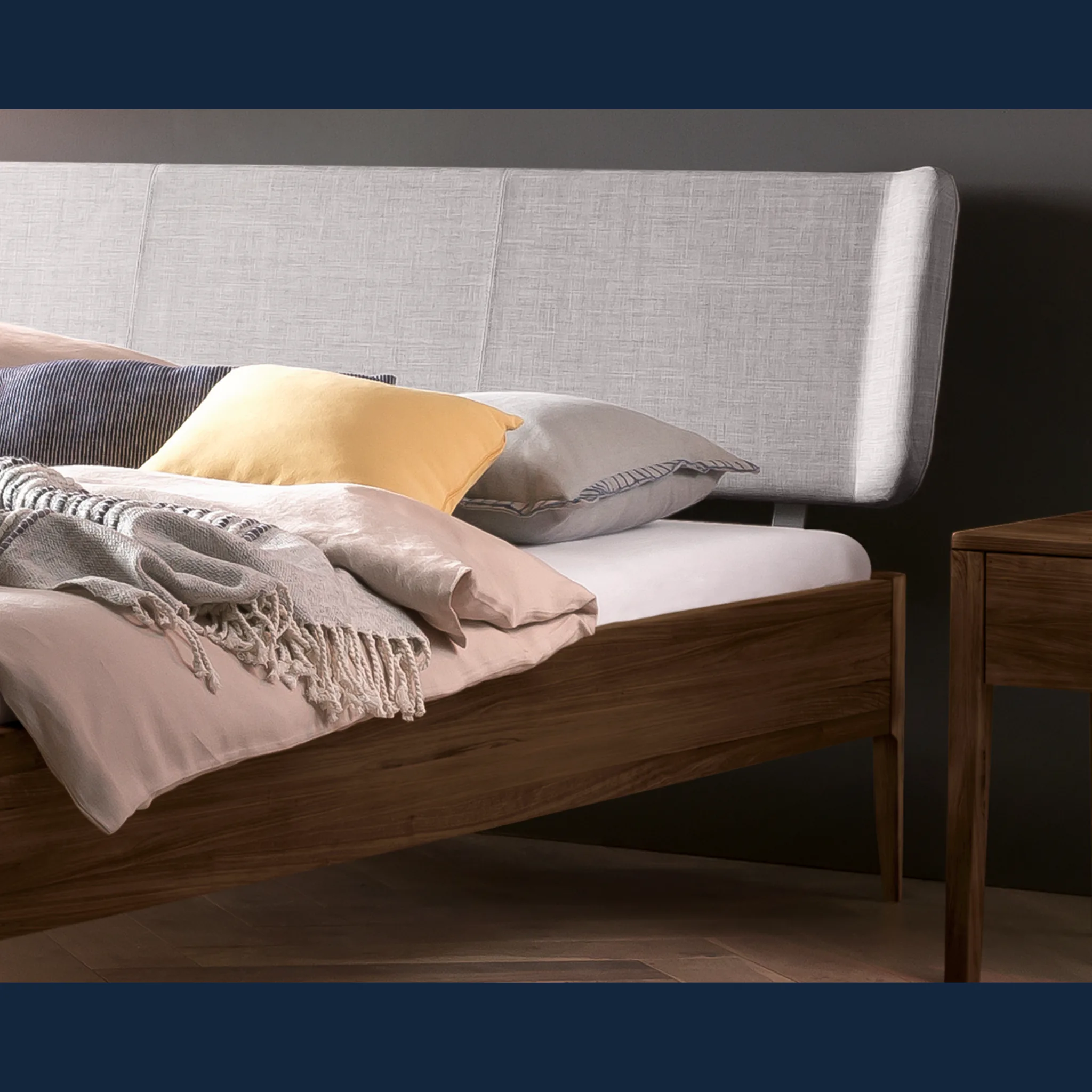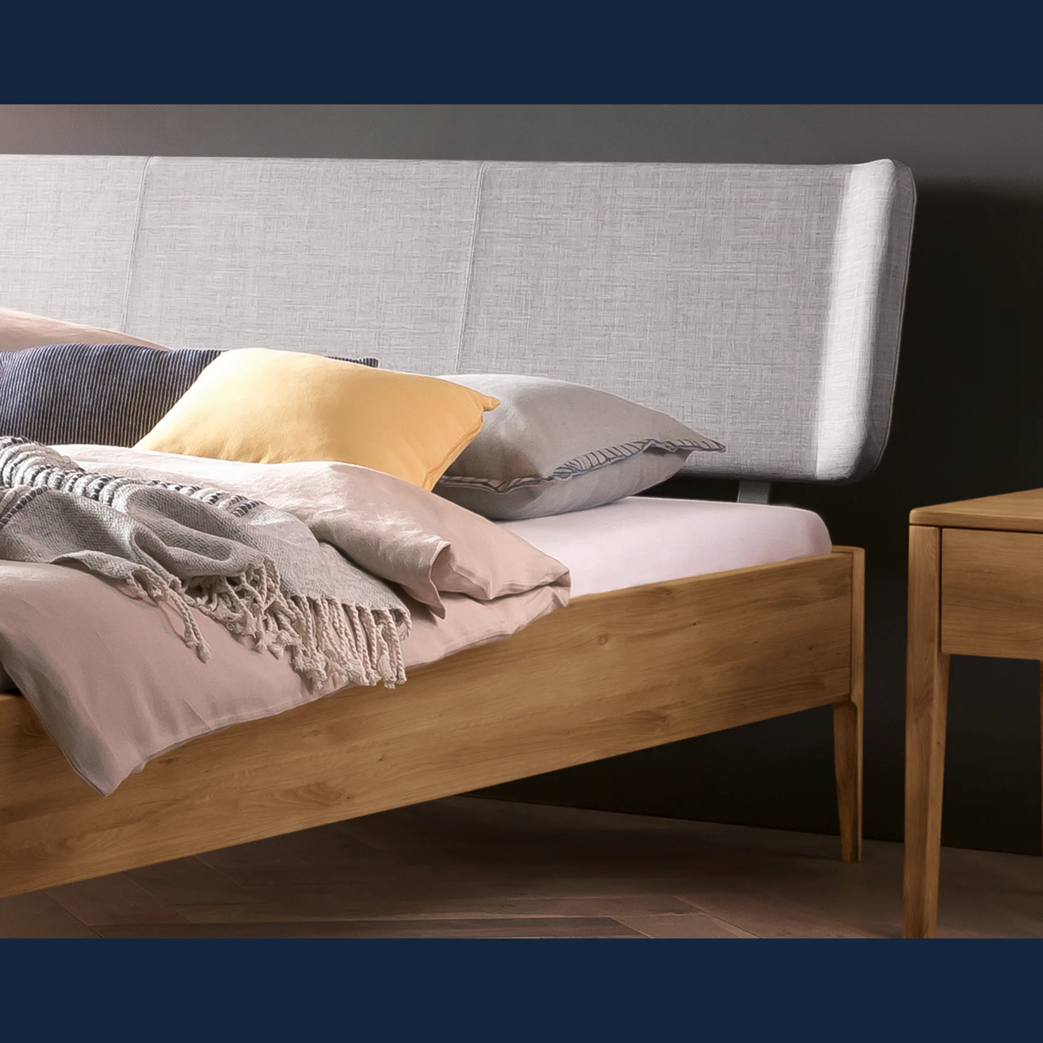 Erleben Sie wertige Haptik und klare Linien. Das Design folgt einer modern-skandinavischen Handschrift mit ruhigen Proportionen und schlanken, konischen Füßen. Der Rahmen entsteht aus massivem Hartholz in Möbelqualität und bildet eine dauerhafte Basis. Das weich gepolsterte Kopfteil ist mit einem robusten, pflegeleichten Bezug aus Stoff versehen und stützt angenehm beim Lesen. Geölte oder deckend lackierte Holzoberflächen setzen dezente, natürliche Akzente im Schlafzimmer und lassen sich gut kombinieren.