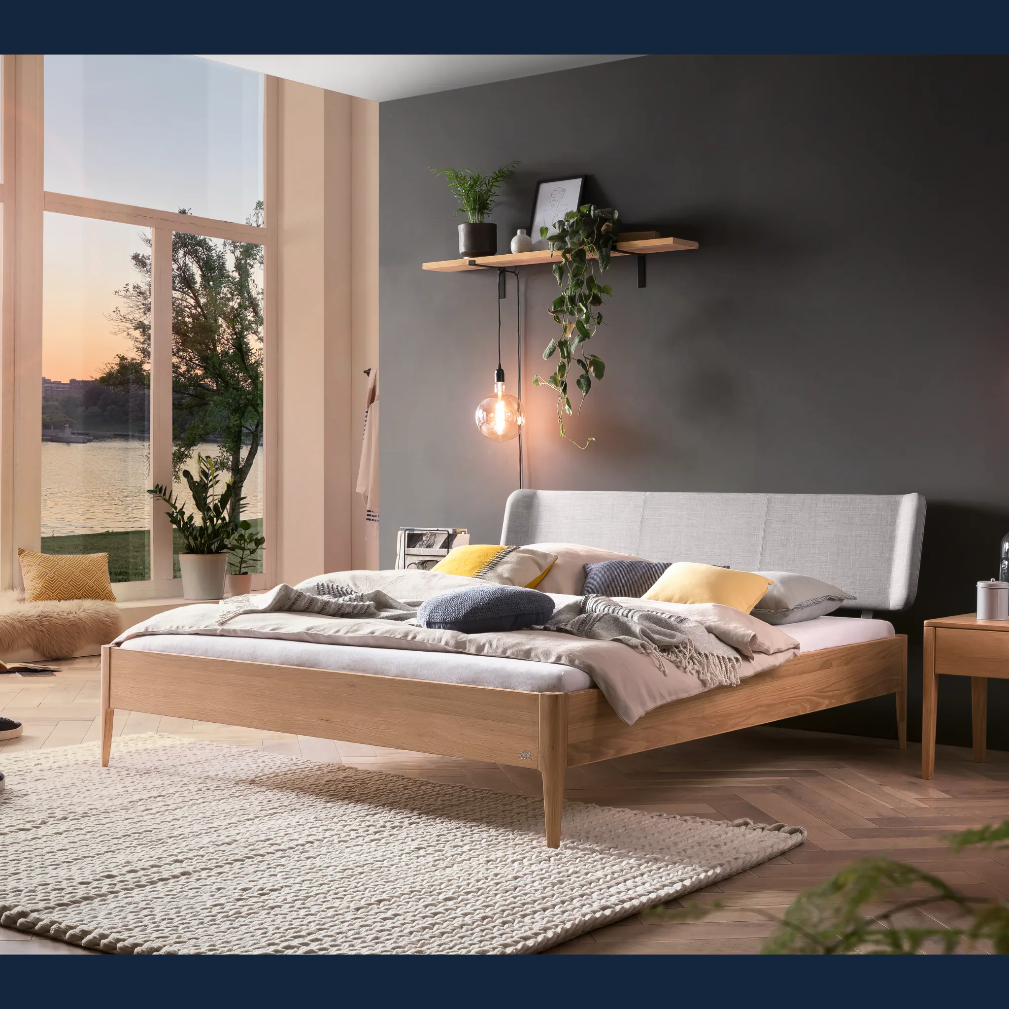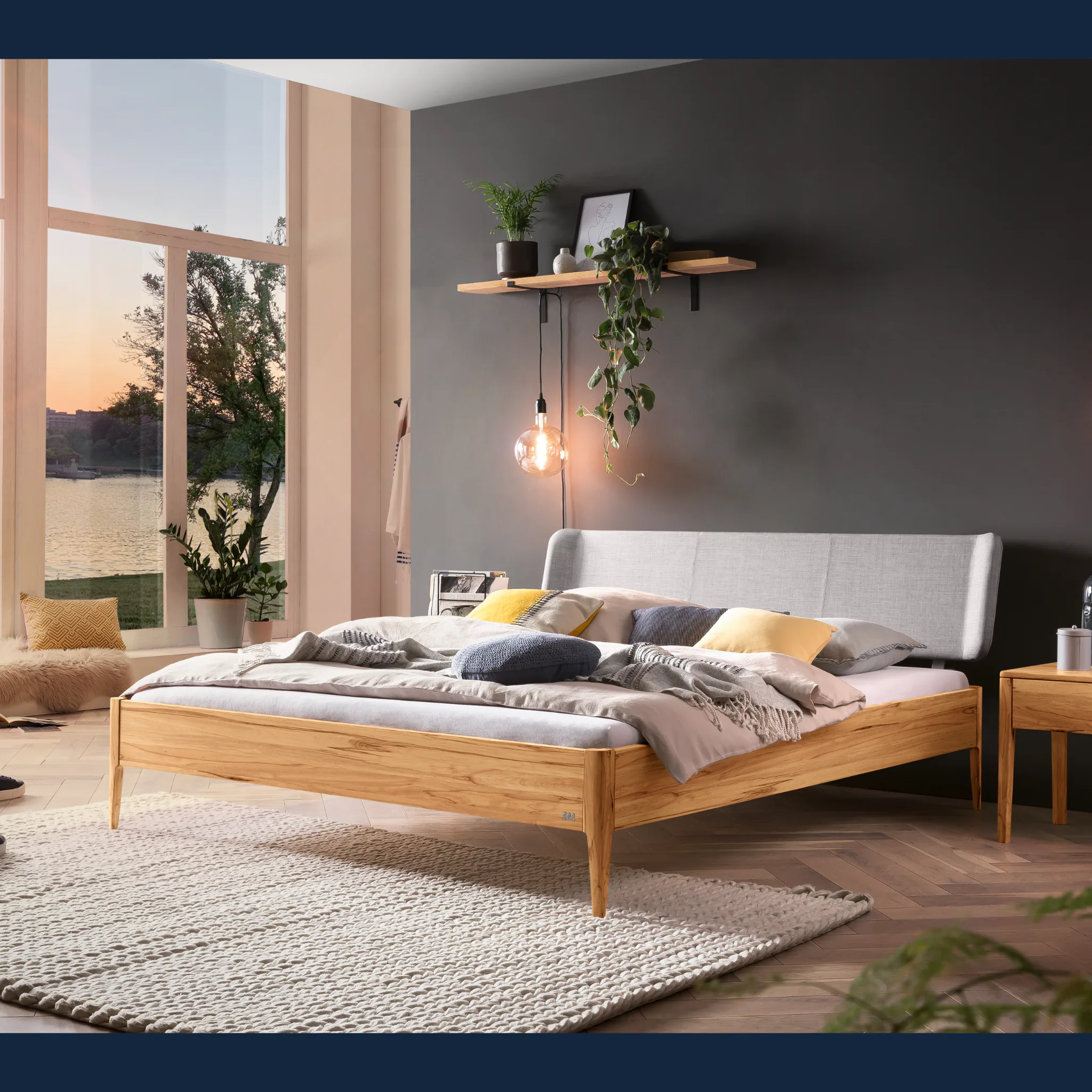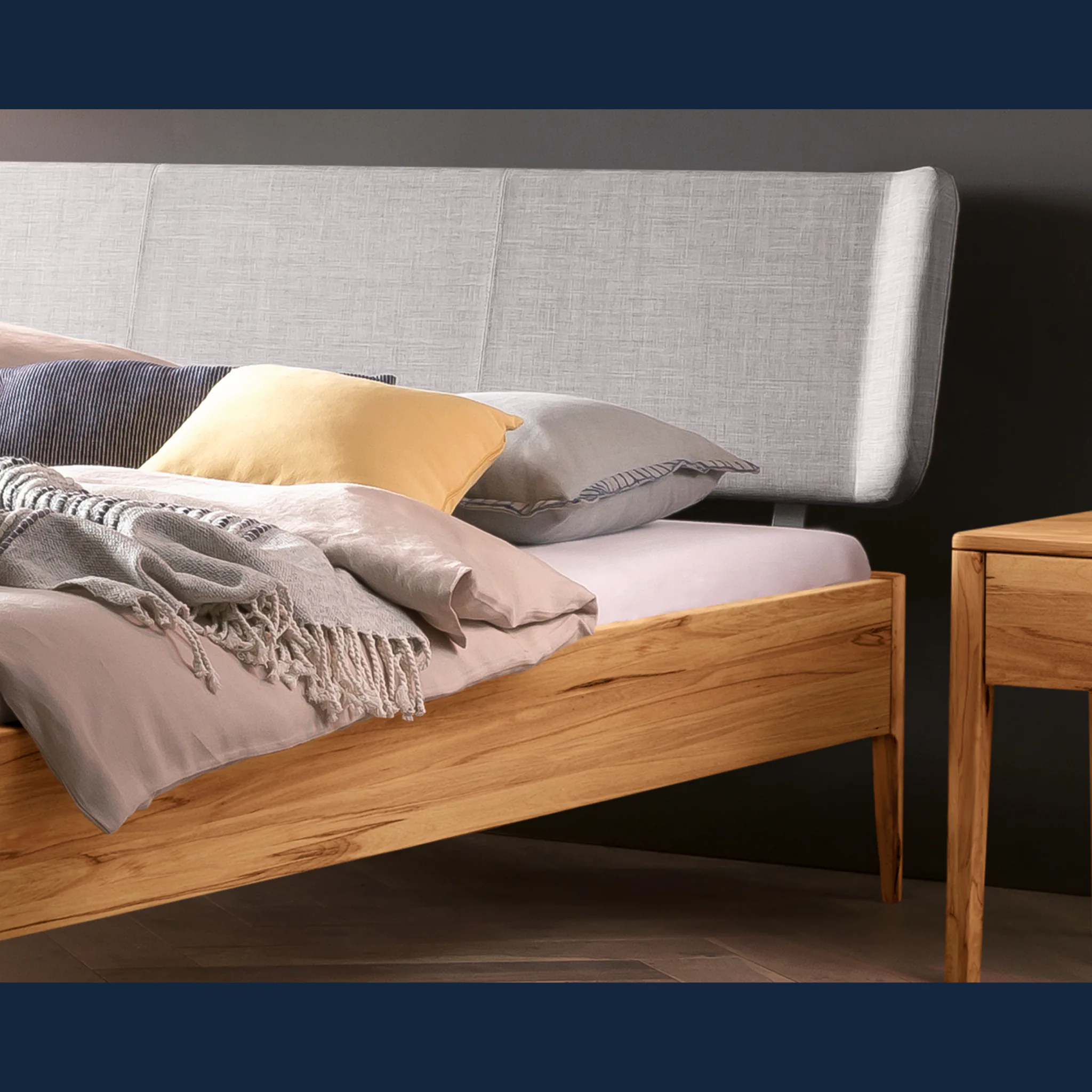 Erleben Sie wertige Haptik und klare Linien. Das Design folgt einer modern-skandinavischen Handschrift mit ruhigen Proportionen und schlanken, konischen Füßen. Der Rahmen entsteht aus massivem Hartholz in Möbelqualität und bildet eine dauerhafte Basis. Das weich gepolsterte Kopfteil ist mit einem robusten, pflegeleichten Bezug aus Stoff versehen und stützt angenehm beim Lesen. Geölte oder deckend lackierte Holzoberflächen setzen dezente, natürliche Akzente im Schlafzimmer und lassen sich gut kombinieren.