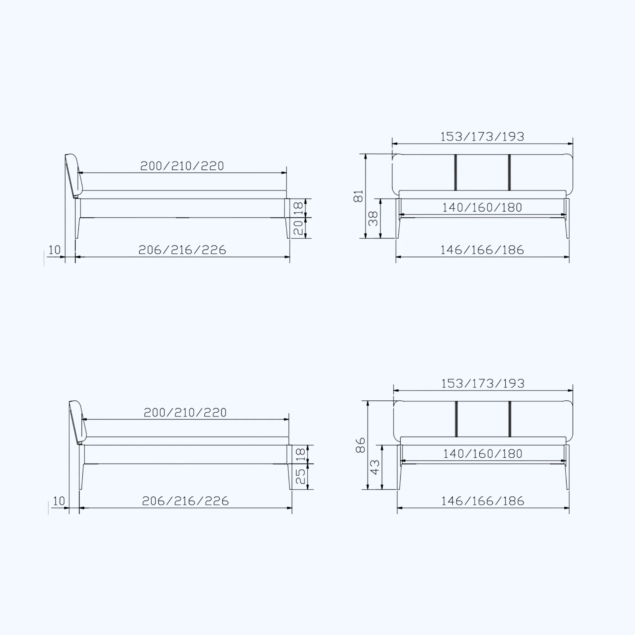 | Maße (Breite x Länge x Höhe) | 153x216x81 cm, 153x216x86 cm, 153x226x81 cm, 153x226x86 cm, 153x236x81 cm, 153x236x86 cm, 173x216x81 cm, 173x216x86 cm, 173x226x81 cm, 173x226x86 cm, 173x236x81 cm, 173x236x86 cm, 193x216x81 cm, 193x216x86 cm, 193x226x81 cm, 193x226x86 cm, 193x236x81 cm, 193x236x86 cm |