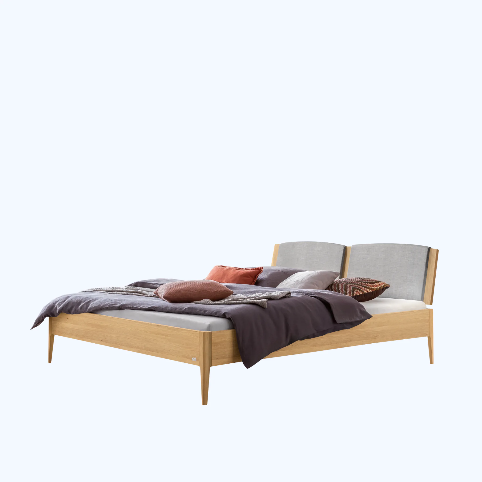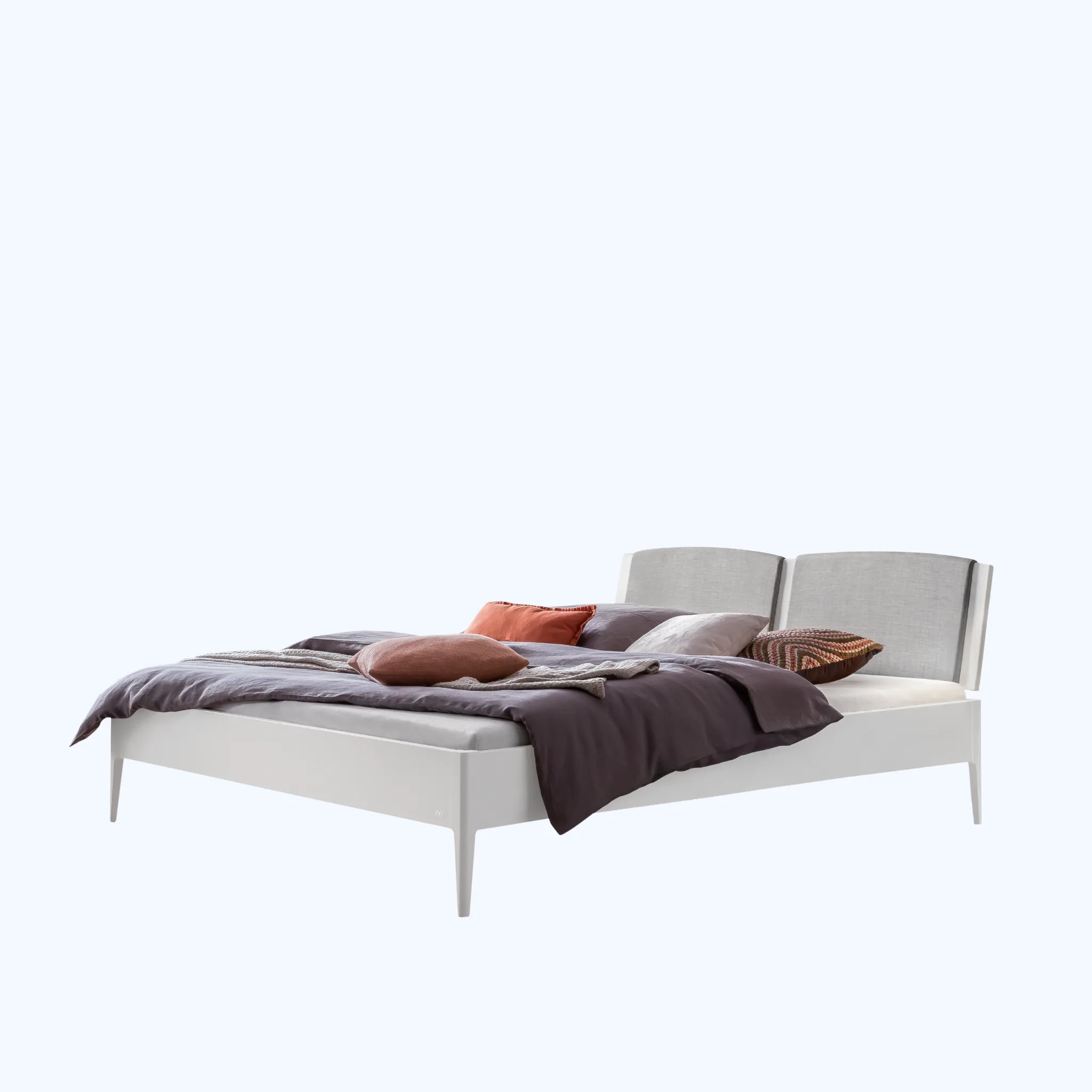 Hasena Pistoia elegantes Massivholzbett mit weich gepolsterten Stoffkissen und schlanken Holzfüßen. Einlegetiefe 18 cm. Erhältlich in 12 Größen und 5 Farben.