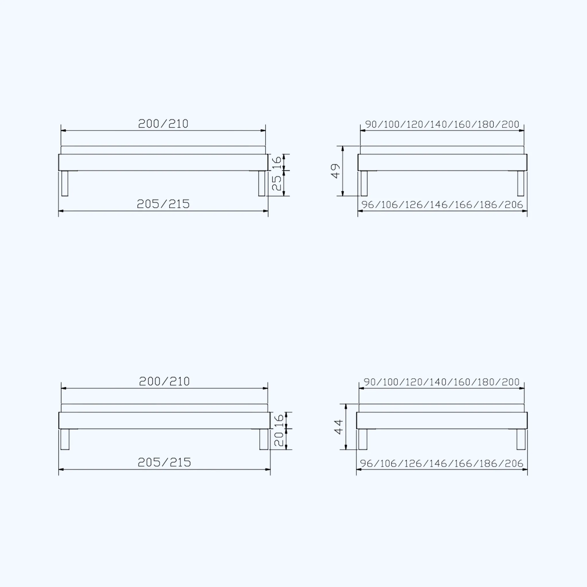 | Maße (Breite x Länge x Höhe) | 106x205x36 cm, 106x205x41 cm, 106x215x36 cm, 106x215x41 cm, 126x205x36 cm, 126x205x41 cm, 126x215x36 cm, 126x215x41 cm, 146x205x36 cm, 146x205x41 cm, 146x215x36 cm, 146x215x41 cm, 166x205x36 cm, 166x205x41 cm, 166x215x36 cm, 166x215x41 cm, 186x205x36 cm, 186x205x41 cm, 186x215x36 cm, 186x215x41 cm, 206x205x36 cm, 206x205x41 cm, 206x215x36 cm, 206x215x41 cm, 96x205x36 cm, 96x205x41 cm, 96x215x36 cm, 96x215x41 cm |