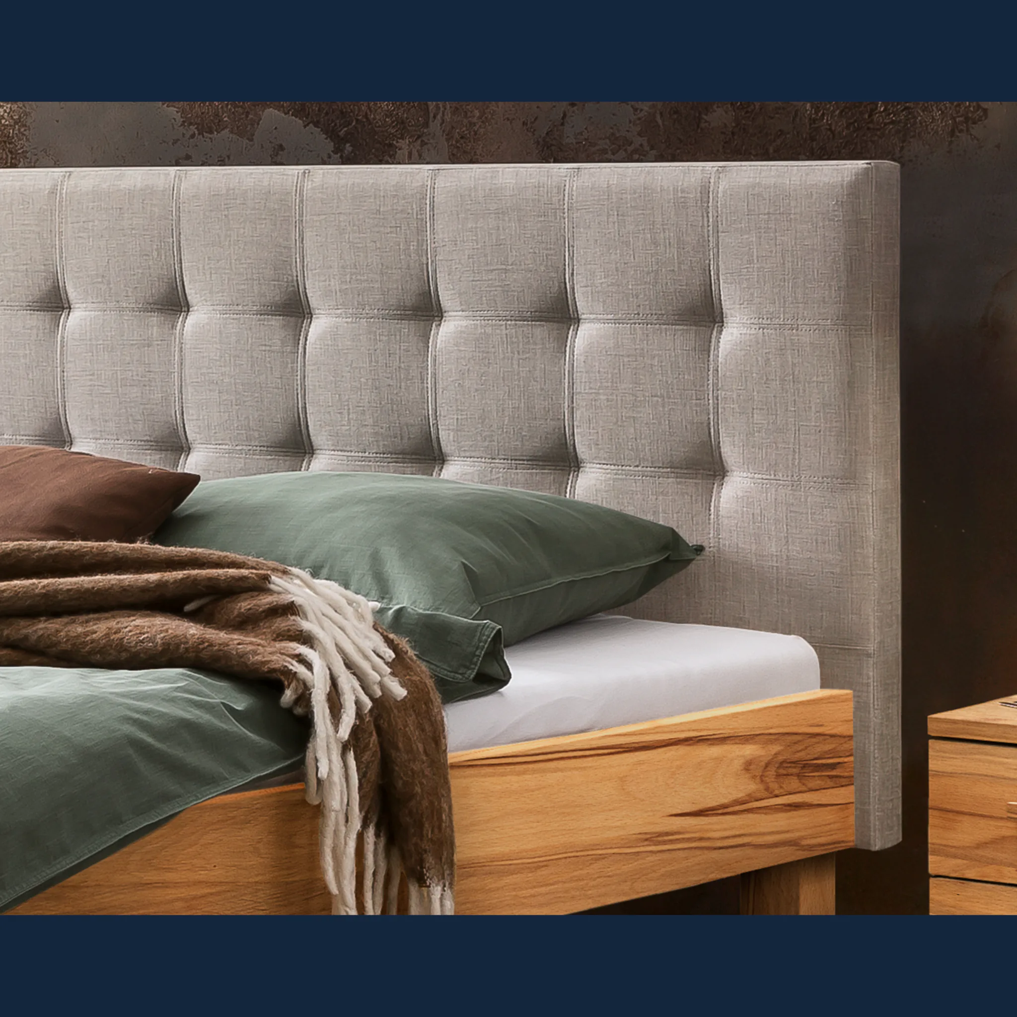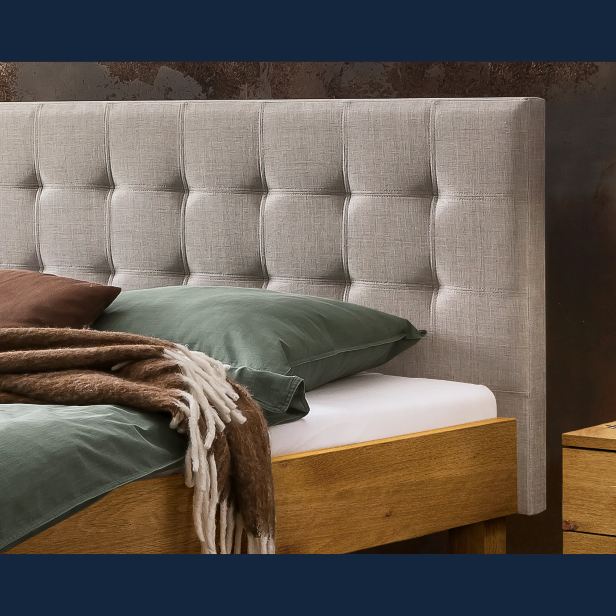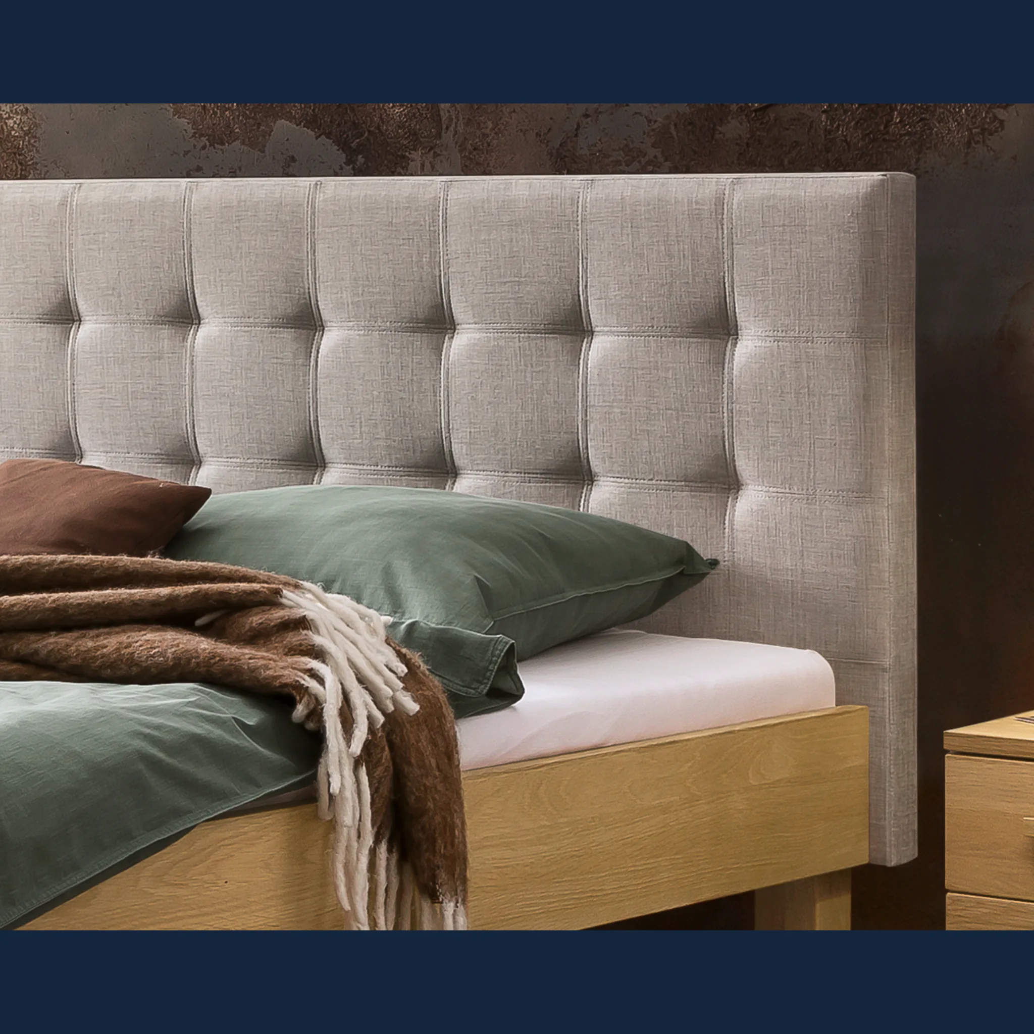 Erleben Sie wertige Haptik und klare Linien. Das Massivholzbett Hasena Ricardo zeigt eine modern-skandinavische Anmutung mit ruhigen Proportionen und weich gerundetem Rahmen. Massives Hartholz in Möbelqualität bildet die stabile Basis, die über Jahre verlässlich bleibt. Das hoch gepolsterte Kopfteil im robusten Stoff Pepe grey sorgt für angenehmen Halt beim Lesen und setzt einen textilen Akzent. Quadratische Steppung verleiht Struktur, während kantige Holzfüße Standfestigkeit und eine geordnete Optik unterstützen. So entsteht ein Bett, das sich unaufdringlich einfügt und den Schlafbereich beruhigt.