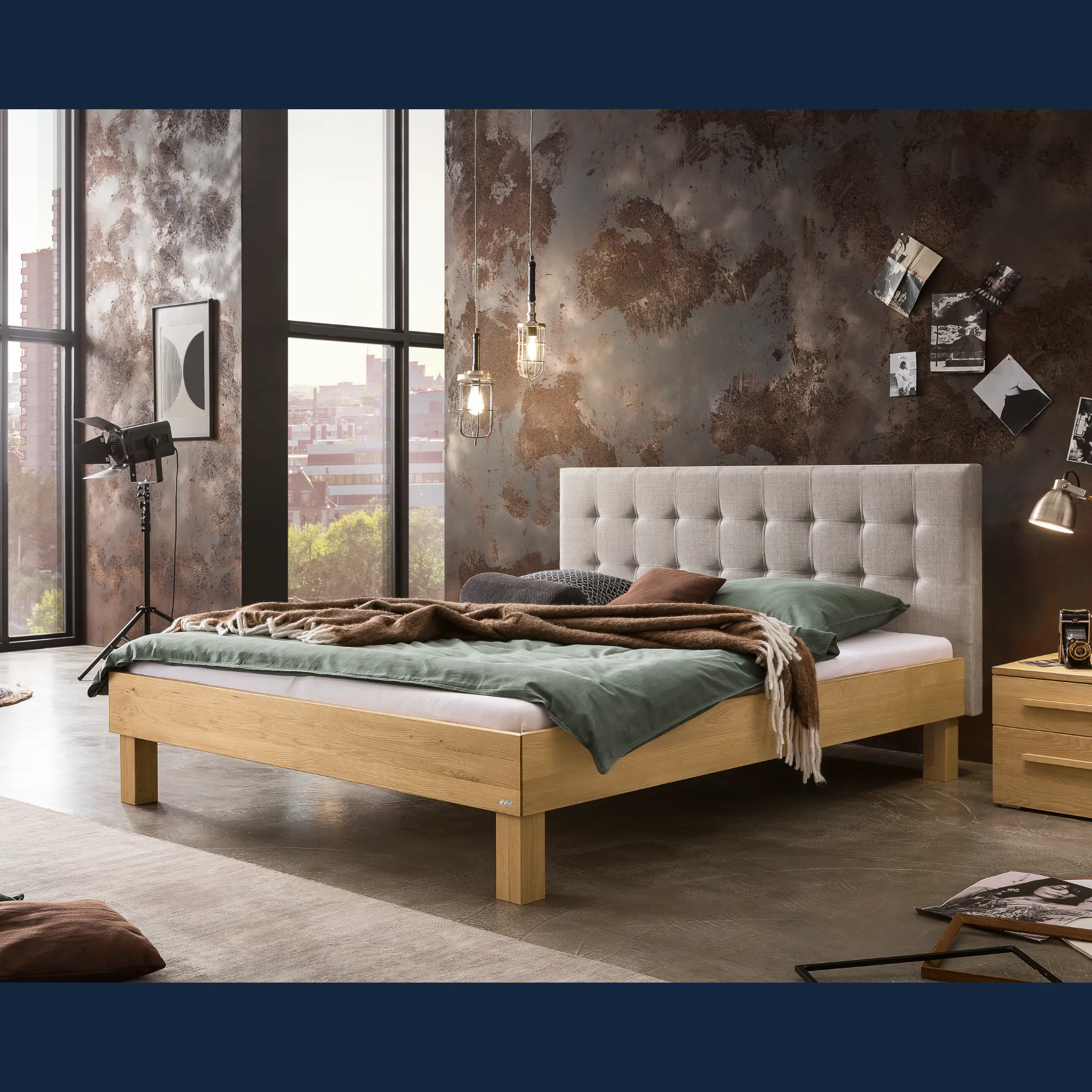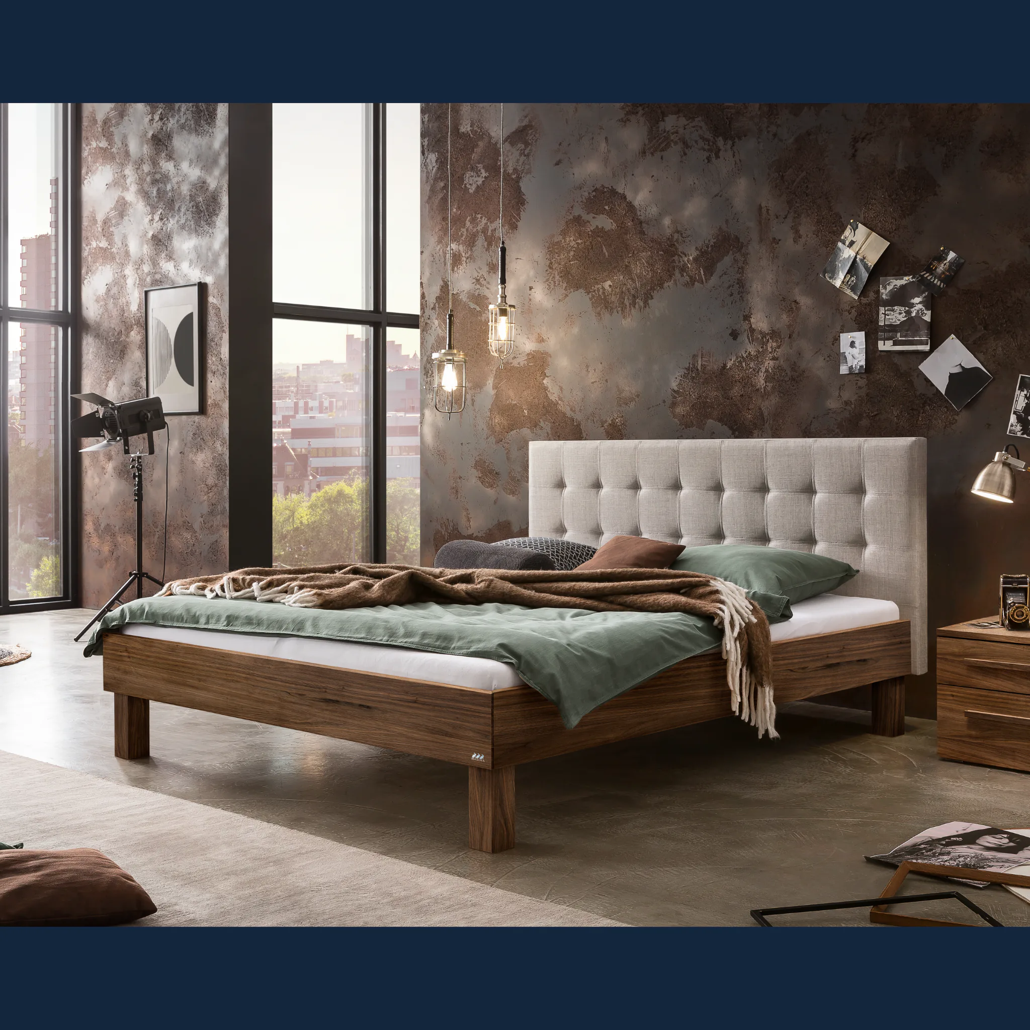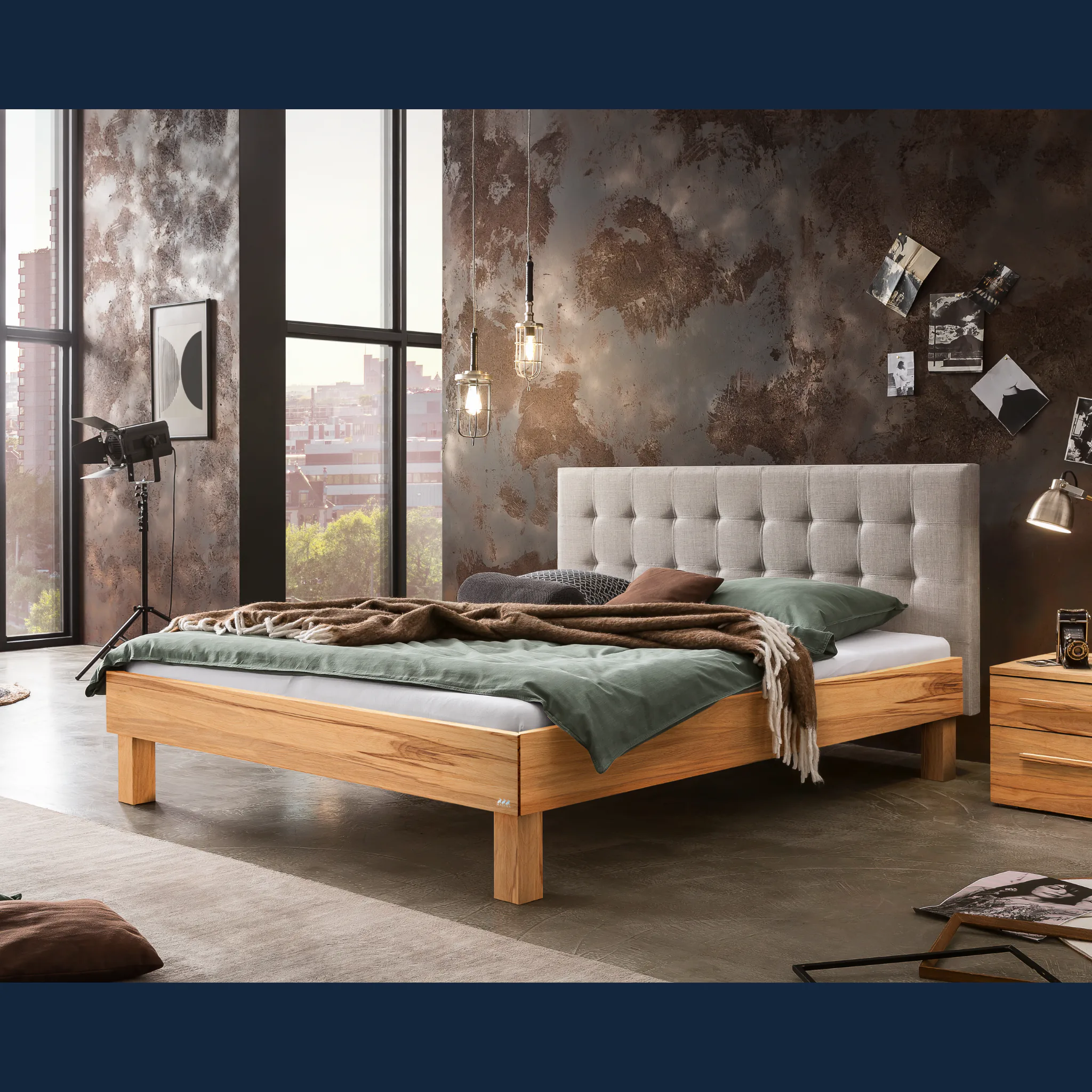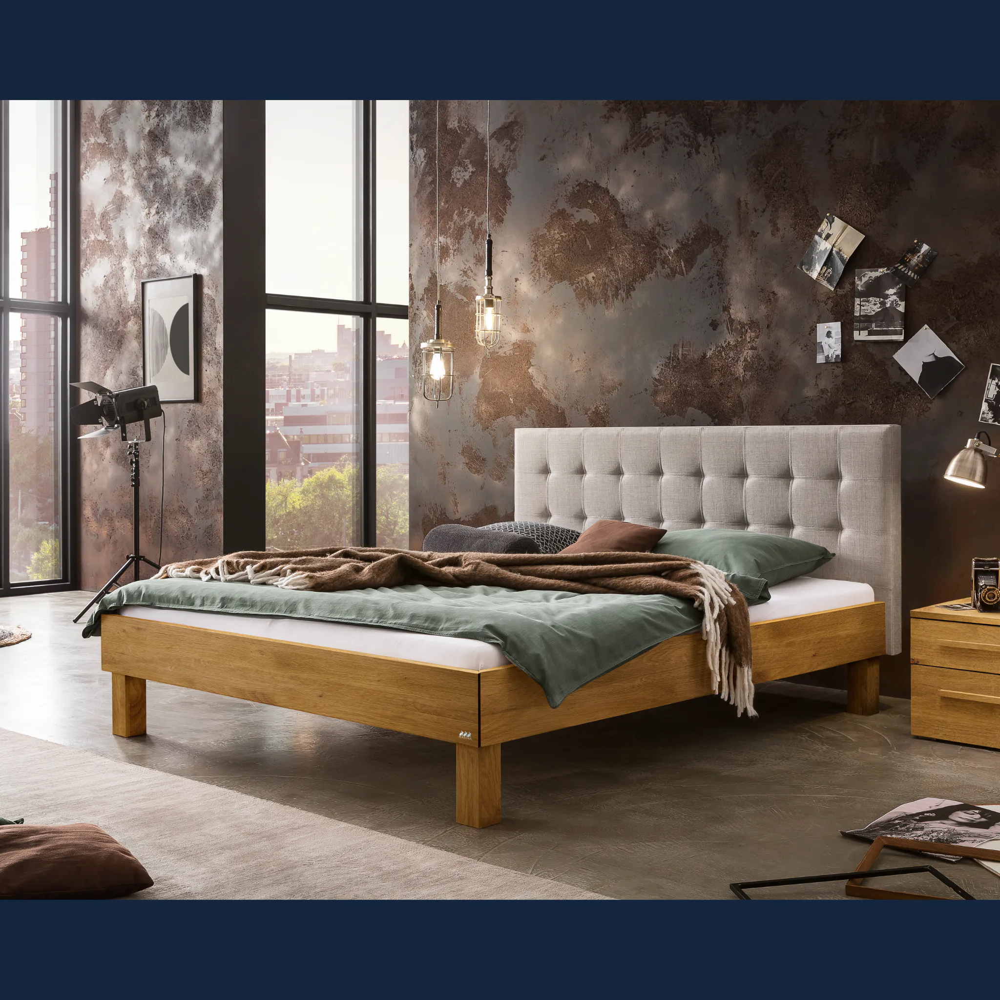 Erleben Sie wertige Haptik und klare Linien. Das Massivholzbett Hasena Ricardo zeigt eine modern-skandinavische Anmutung mit ruhigen Proportionen und weich gerundetem Rahmen. Massives Hartholz in Möbelqualität bildet die stabile Basis, die über Jahre verlässlich bleibt. Das hoch gepolsterte Kopfteil im robusten Stoff Pepe grey sorgt für angenehmen Halt beim Lesen und setzt einen textilen Akzent. Quadratische Steppung verleiht Struktur, während kantige Holzfüße Standfestigkeit und eine geordnete Optik unterstützen. So entsteht ein Bett, das sich unaufdringlich einfügt und den Schlafbereich beruhigt.