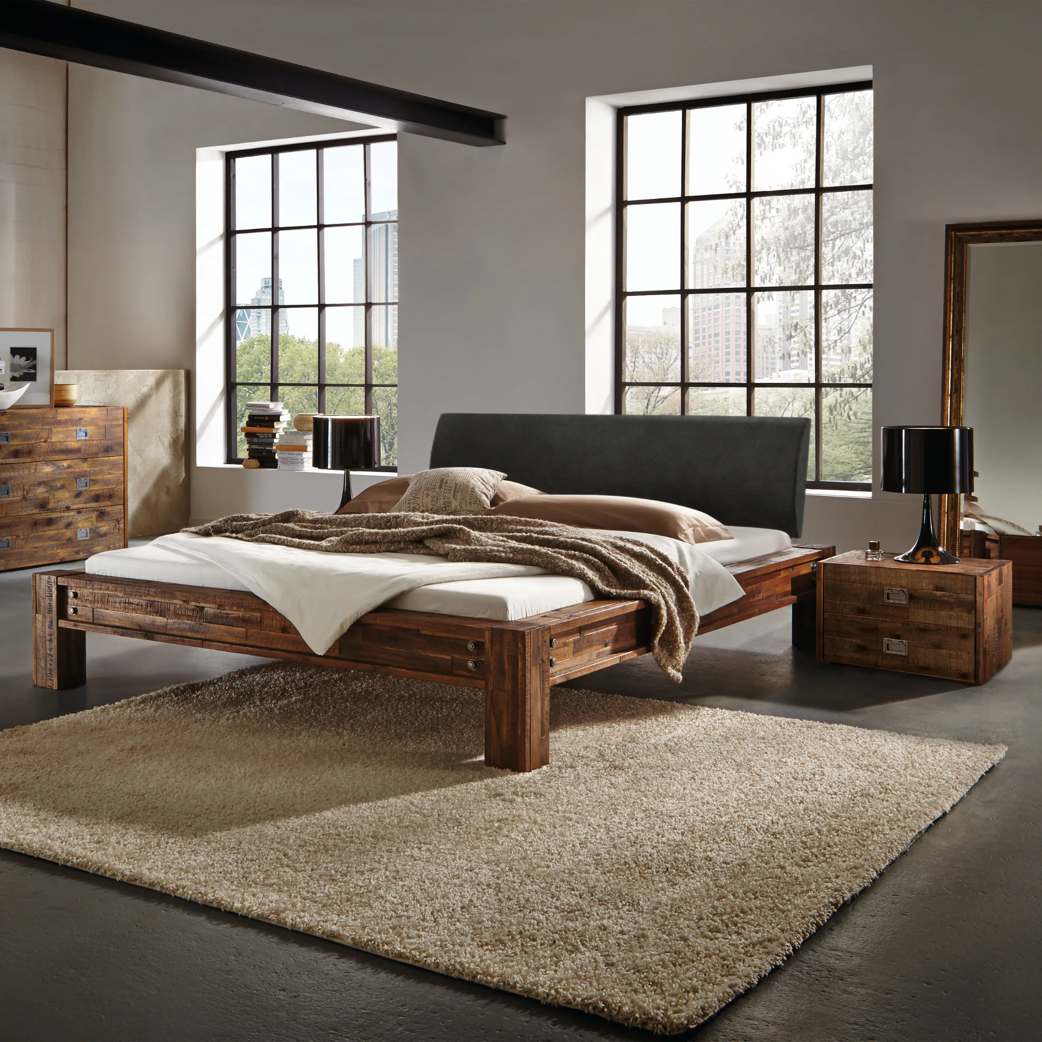 San Felipe überzeugt in wohnlich-rustikalen Interieurs ebenso wie in klaren Lofts mit warmen Akzenten. Die sichtbare Holzstruktur setzt einen natürlichen Fokus, während das dezente Kopfteil visuelle Ruhe schafft. Das Bett trägt textile Schichten überzeugend und bleibt zeitlos kombinierbar.