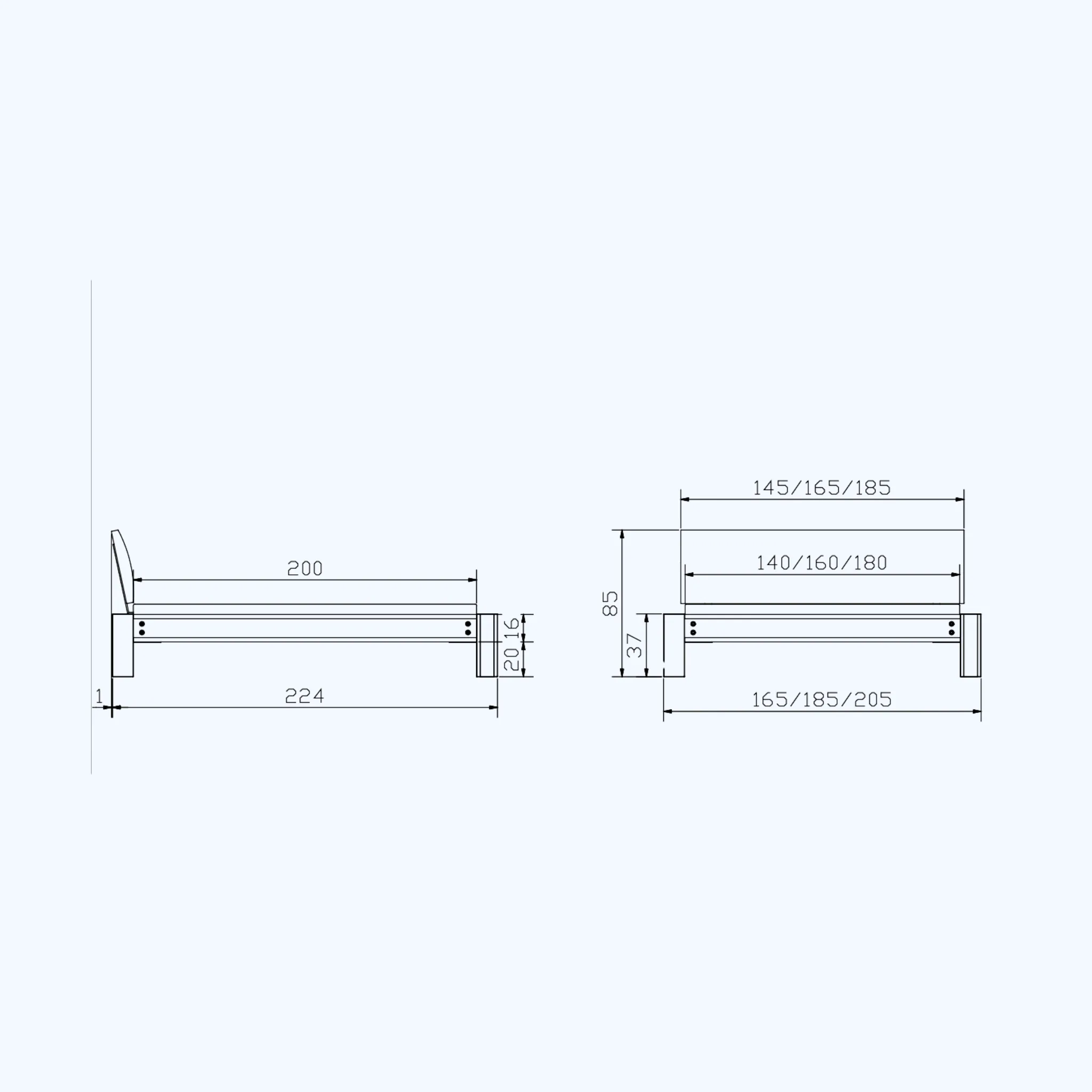 | Maße (Breite x Länge x Höhe) | 165x224x85 cm, 185x224x85 cm, 205x224x85 cm |