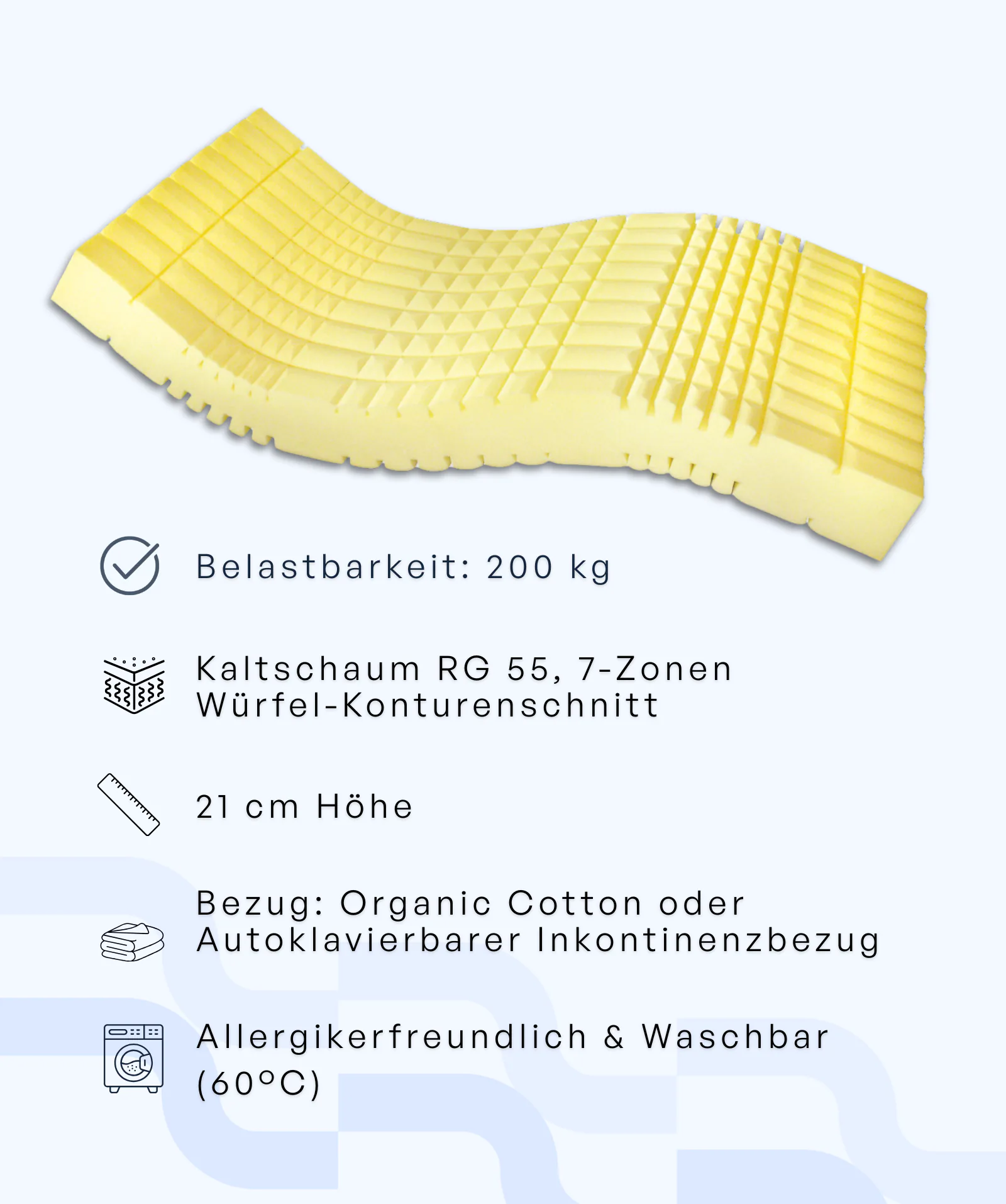 Der Organic-Cotton-Bezug ist mit Baumwolle aus kontrolliert biologischem Anbau gearbeitet, versteppt mit 400 g/m² Klimafaser und mit 4-Seiten Reißverschluss ausgestattet. Alternativ ist ein Inkontinenzbezug erhältlich (autoklavierbar, desinfizierbar, zuverlässiger Schutz bei Inkontinenz, 4-Seiten Reißverschluss). Die Matratzenhöhe beträgt 21 cm, die Belastungsgrenze liegt bei 200 kg; ab 160 cm Breite wird sie als Partnermatratze geliefert. Zertifiziert nach OEKO-TEX® Standard 100.