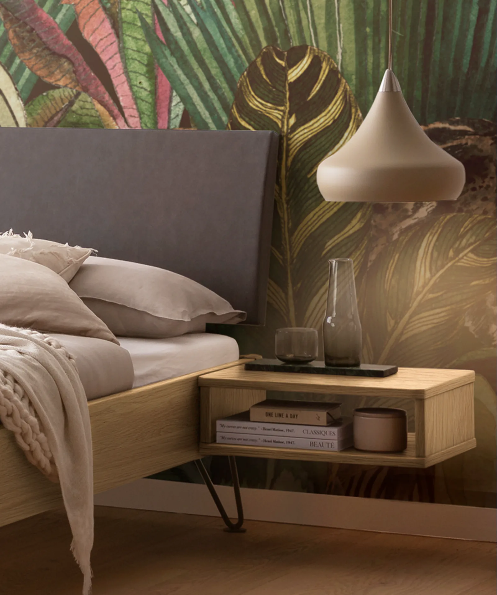 Der hängende Nachttisch ergänzt Holz- wie Polsterbetten und bringt visuelle Ruhe neben die Liegefläche. Wählen Sie den passenden Ton für Ihre Textilien: Buche weiß deckend lackiert, Eiche bright geölt, Nussbaum geölt, Wildbuche natur geölt oder Wildeiche natur geölt.