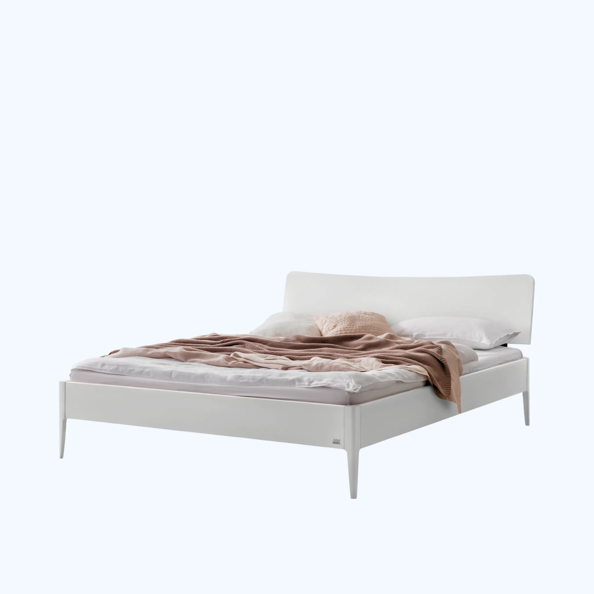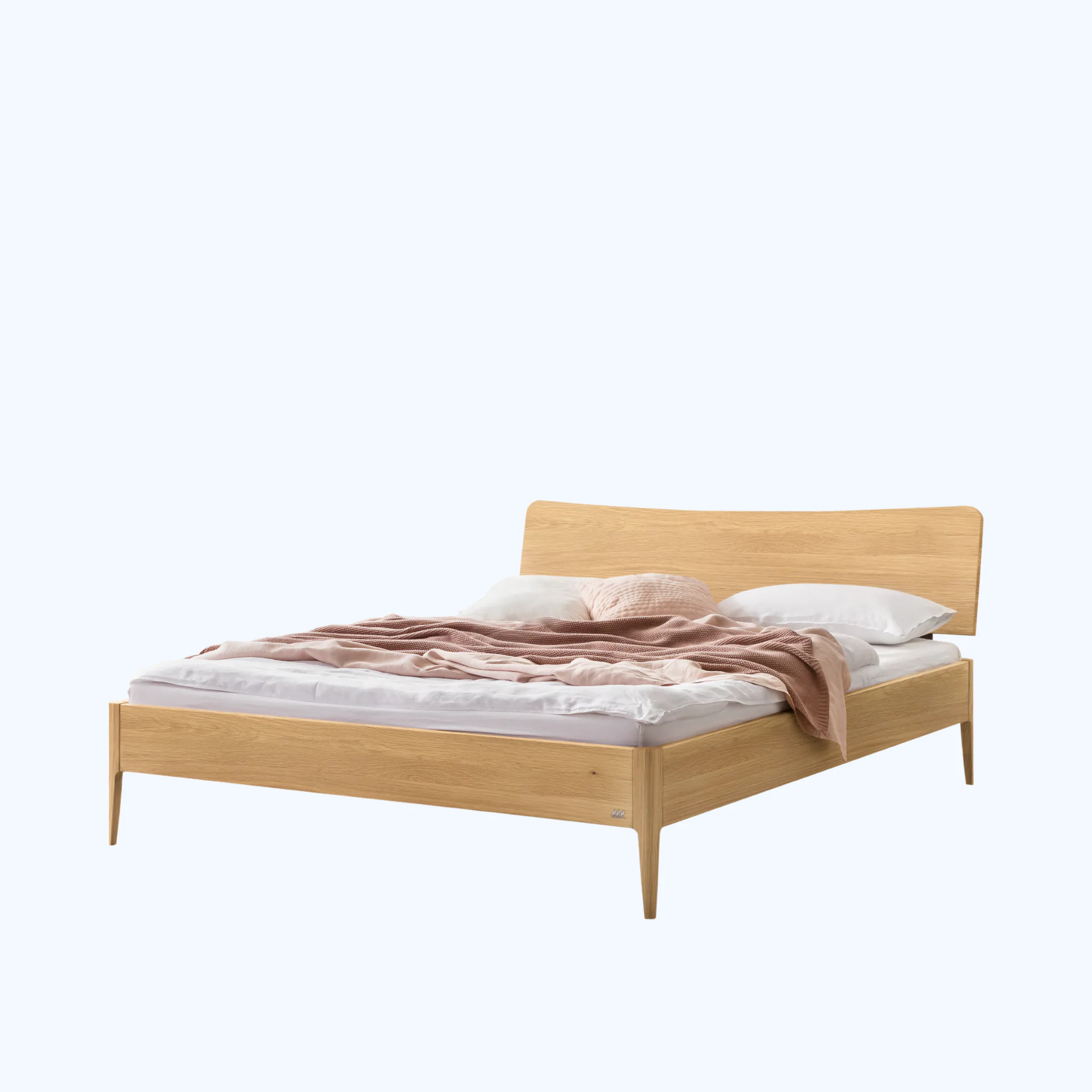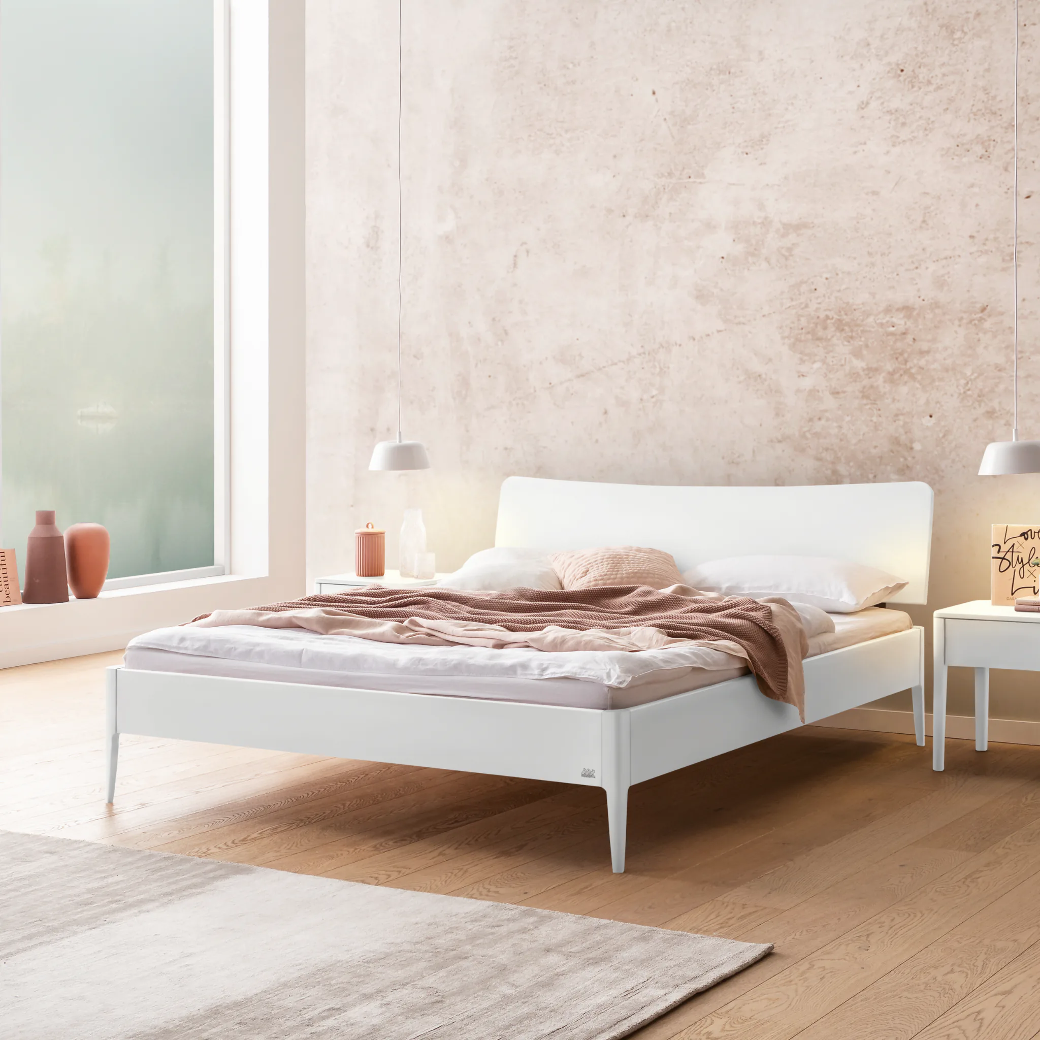 Hasena Spezia elegantes Massivholzbett mit gerundetem Holz-Kopfteil und stabilen konischen Füßen. Einlegetiefe ca. 18 cm. Erhältlich in 12 Größen und 5 Farben.