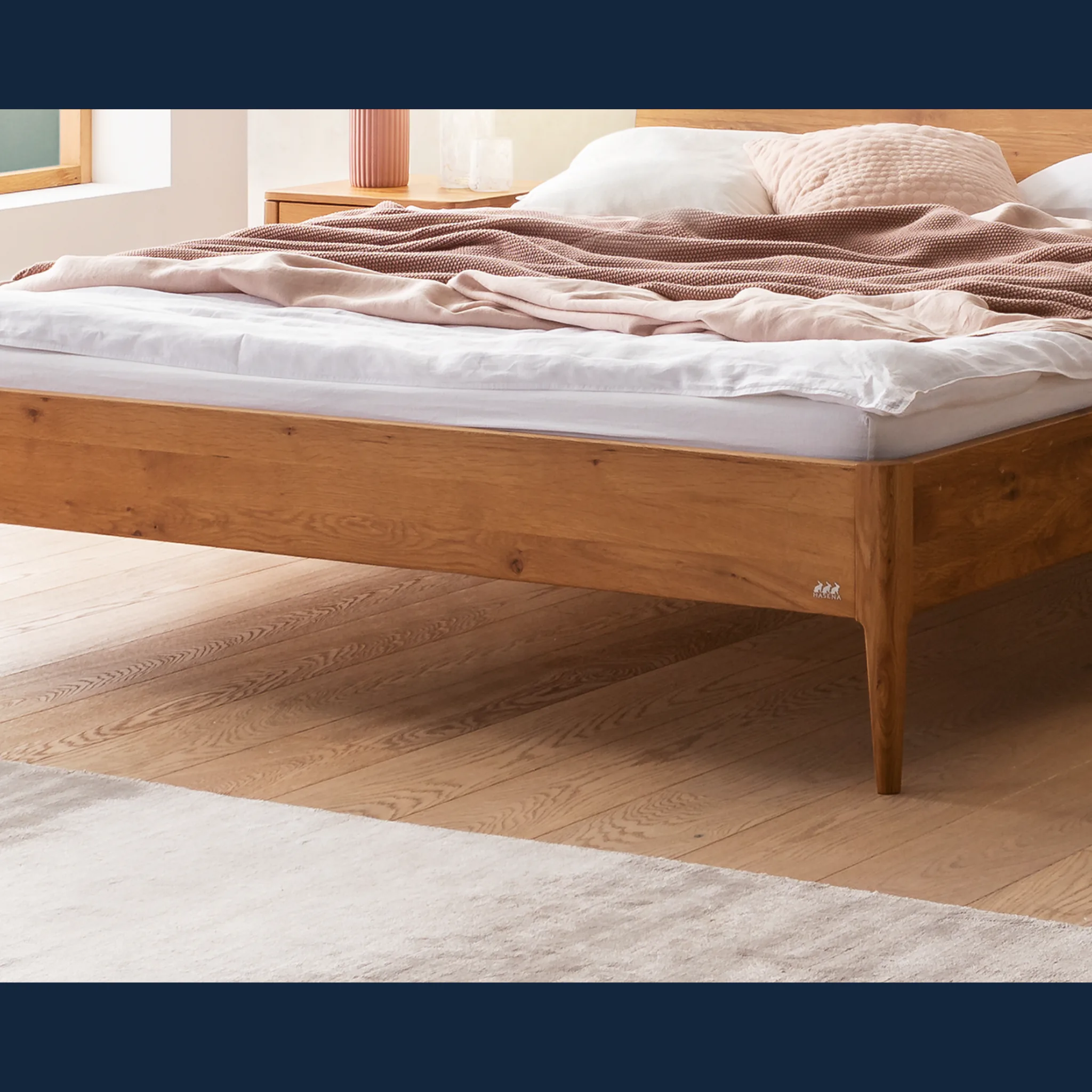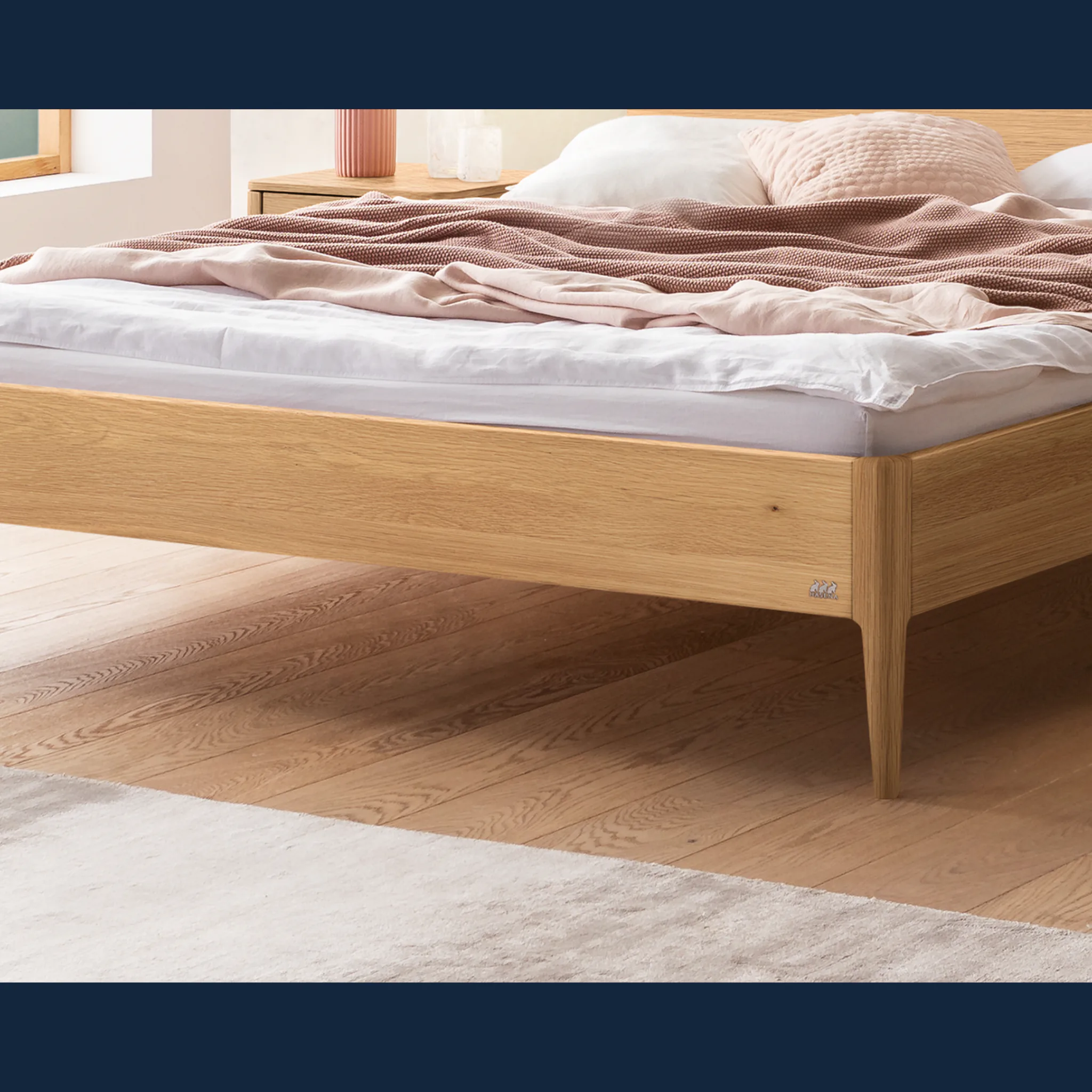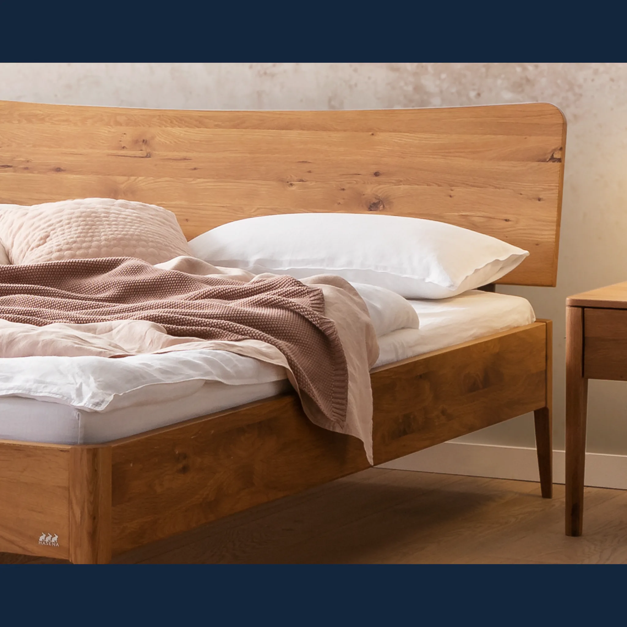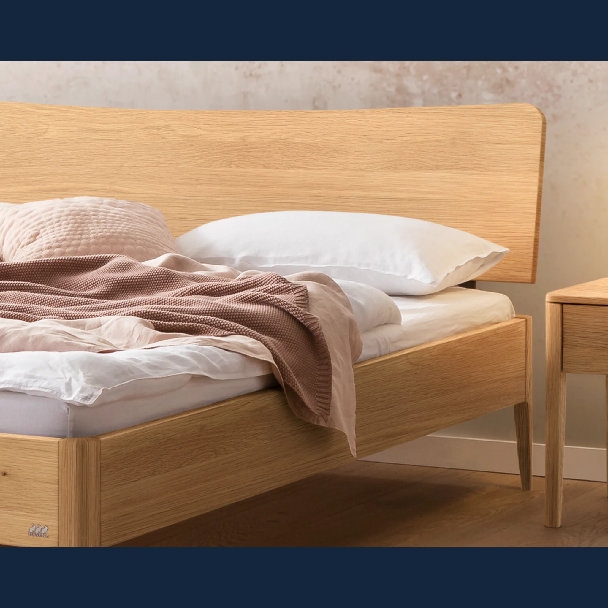 Erleben Sie wertige Haptik und klare Linien. Massivholzbett Hasena Spezia zeigt eine modern skandinavische Handschrift mit sanft gerundetem Kopfteil und ruhigen Proportionen. Der Rahmen aus massivem Hartholz in Möbelqualität wirkt beständig und lässt die natürliche Maserung in geölter Eiche, Wildeiche oder Nussbaum zur Geltung kommen; Buche steht auf Wunsch deckend lackiert zur Verfügung. Schlanke, konische Füße tragen das Bett leicht und halten den Boden gut zugänglich. So entsteht eine ruhige, freundliche Atmosphäre, die Abendrituale unterstützt und über Jahre verlässlich bleibt.