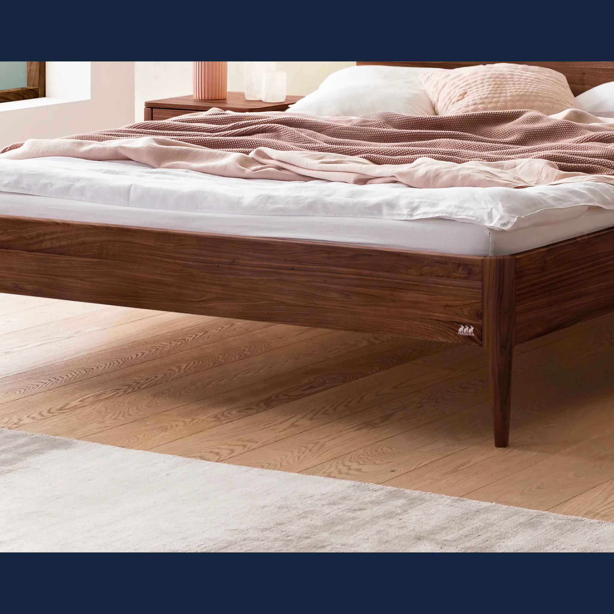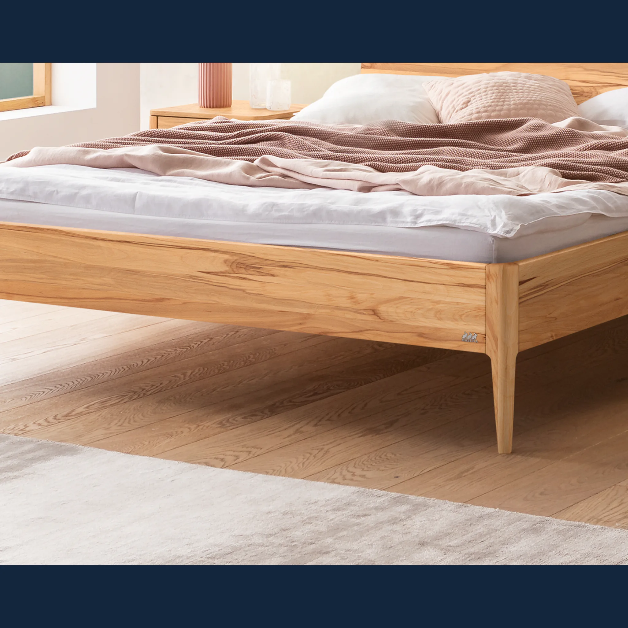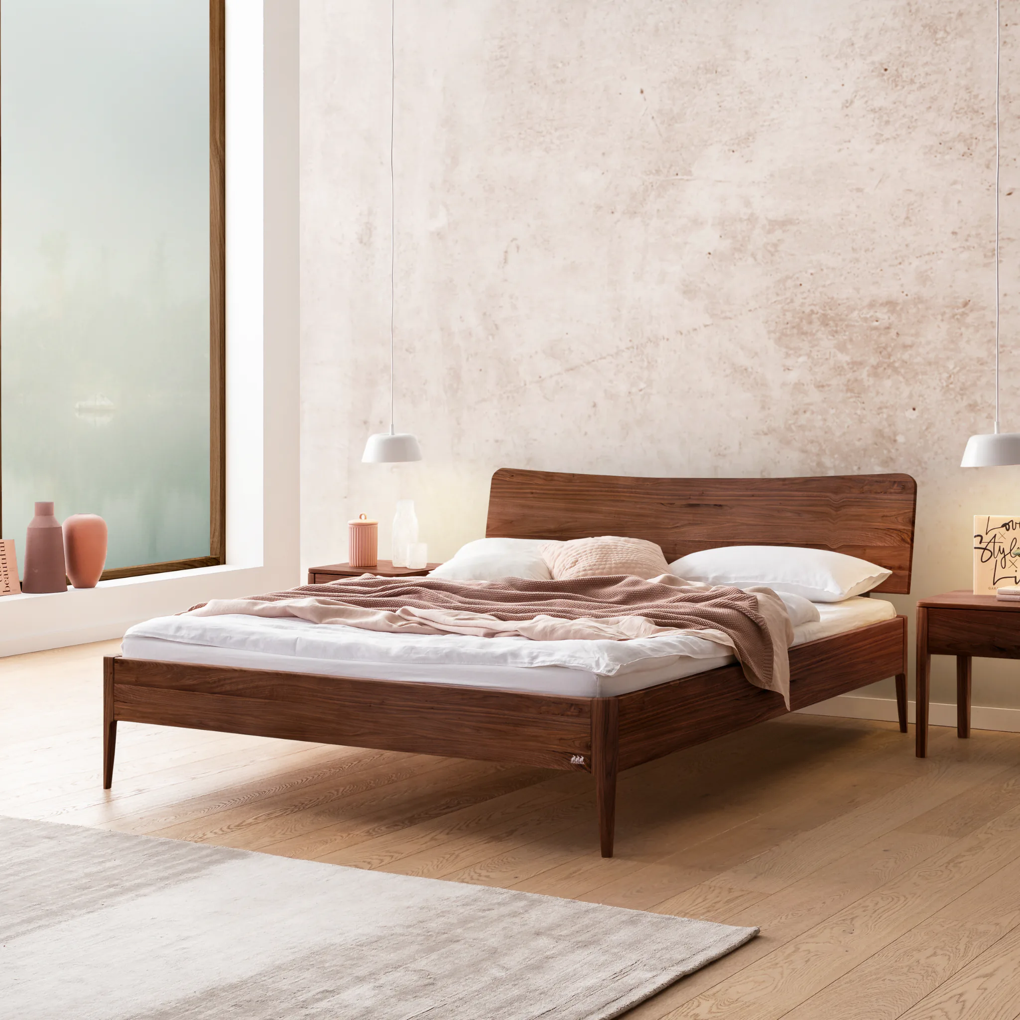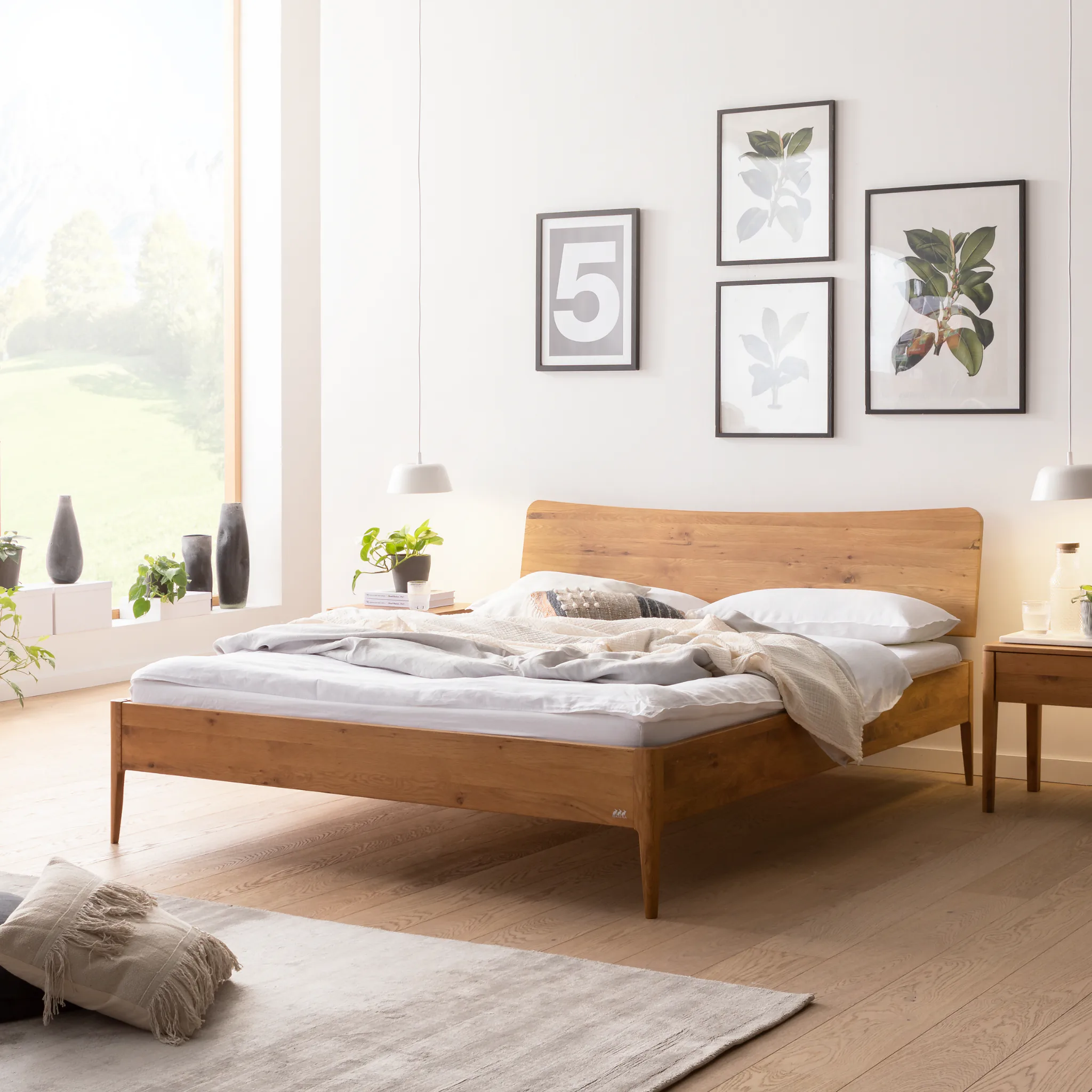 Erleben Sie wertige Haptik und klare Linien. Massivholzbett Hasena Spezia zeigt eine modern skandinavische Handschrift mit sanft gerundetem Kopfteil und ruhigen Proportionen. Der Rahmen aus massivem Hartholz in Möbelqualität wirkt beständig und lässt die natürliche Maserung in geölter Eiche, Wildeiche oder Nussbaum zur Geltung kommen; Buche steht auf Wunsch deckend lackiert zur Verfügung. Schlanke, konische Füße tragen das Bett leicht und halten den Boden gut zugänglich. So entsteht eine ruhige, freundliche Atmosphäre, die Abendrituale unterstützt und über Jahre verlässlich bleibt.