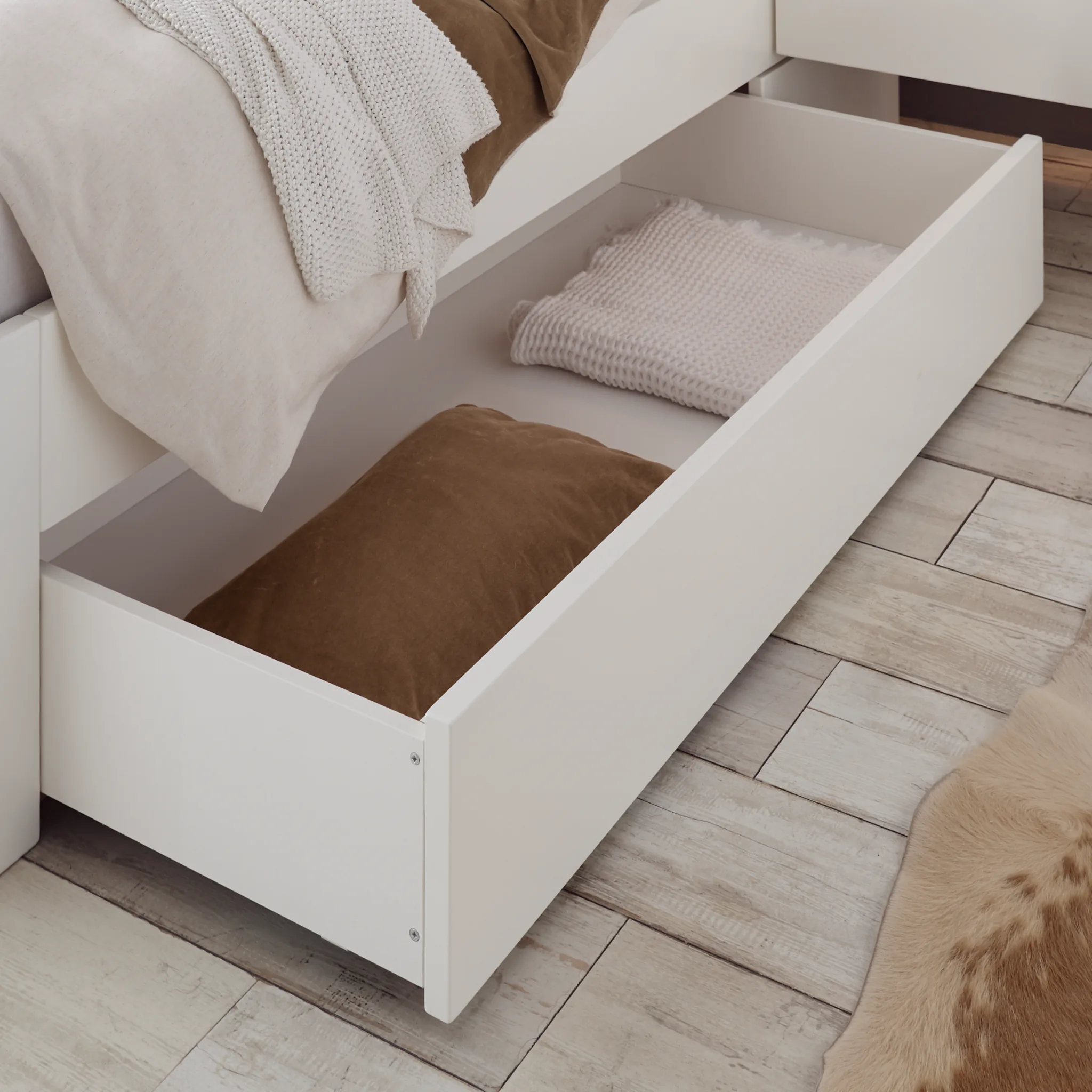 Unter der Liegefläche befinden sich zwei großzügige Bettkästen, die idealen Stauraum für Bettwäsche, Decken oder saisonale Kleidung bieten. Dank der präzisen Verarbeitung gleiten die Schubladen leise und gleichmäßig. So bleibt Ihr Schlafzimmer stets aufgeräumt, ohne dass zusätzlicher Platz benötigt wird.