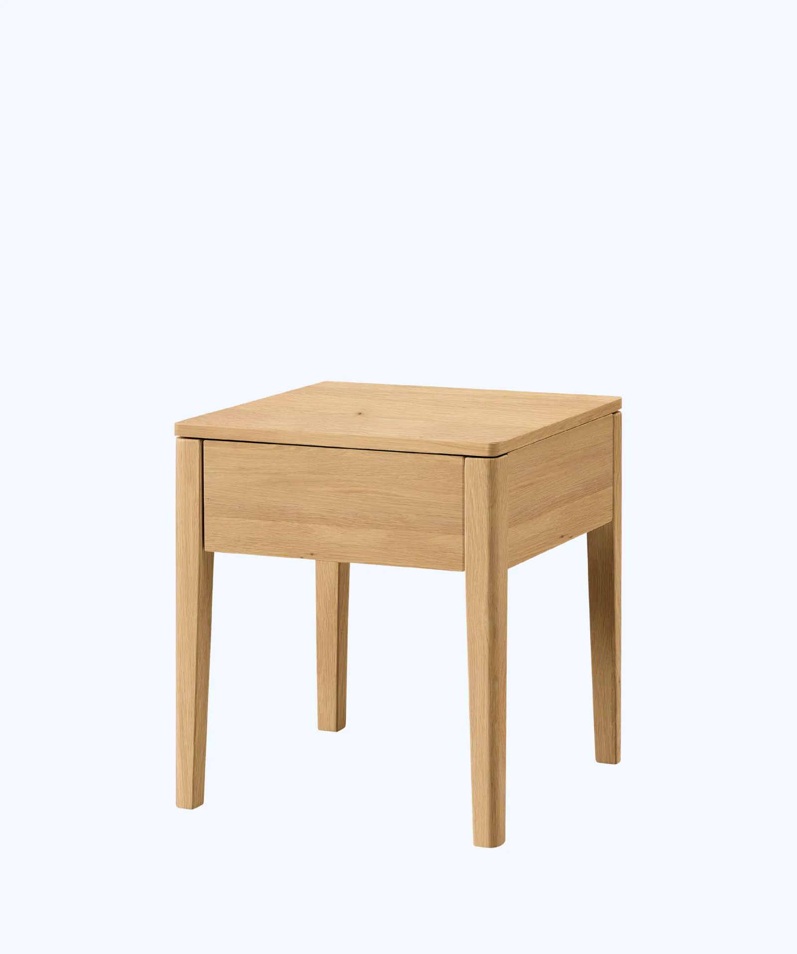 Beruhigend schlicht und spürbar wertig: Der Nachttisch fügt sich mit sanften Radien, abgerundeten Kanten und klaren Linien harmonisch neben Ihr Bett. Aus massivem Hartholz in Möbelqualität gefertigt und der Lounge-Kollektion von Hasena zugehörig, verkörpert er skandinavische Zurückhaltung mit natürlicher Wärme. Die integrierte Schublade sorgt für Ordnung, ohne die leichte Optik zu stören.